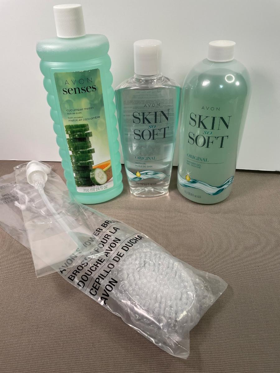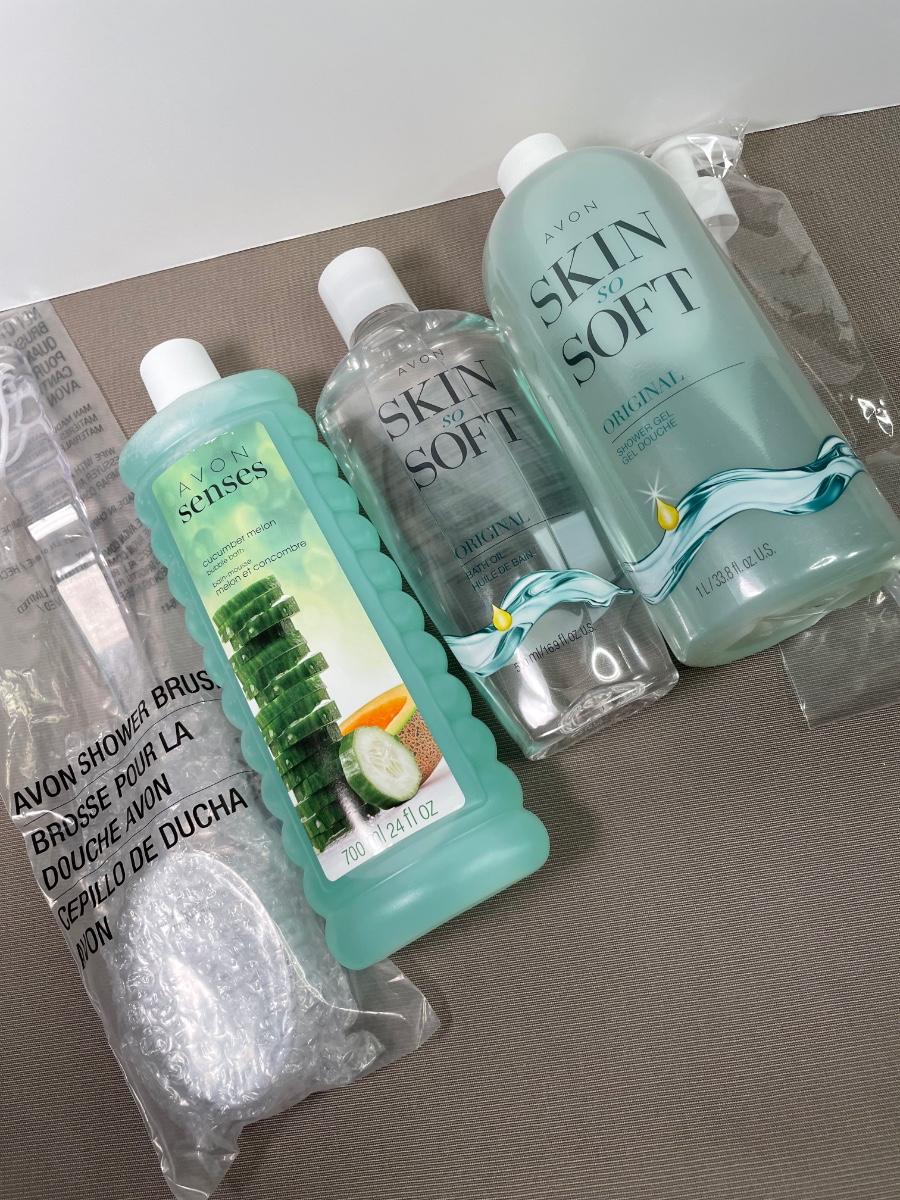 New and sealed. Current inventory. Skin So Soft bath oil and shower gel both bonus sizes, original scent. Cucumber melon bubble bath. Bath brush new in package.