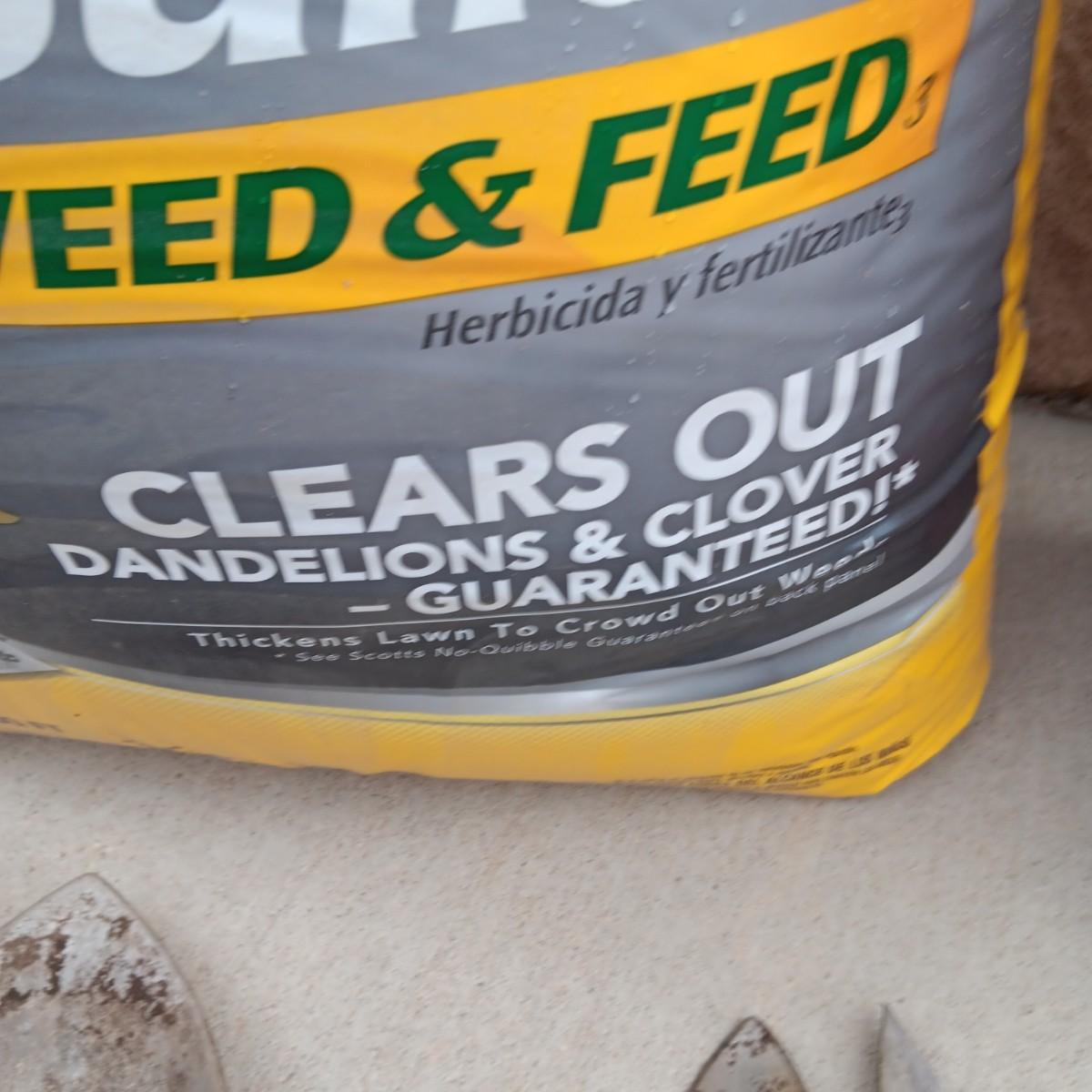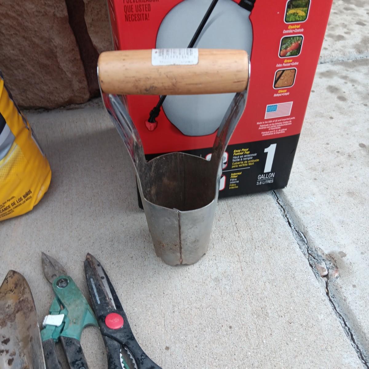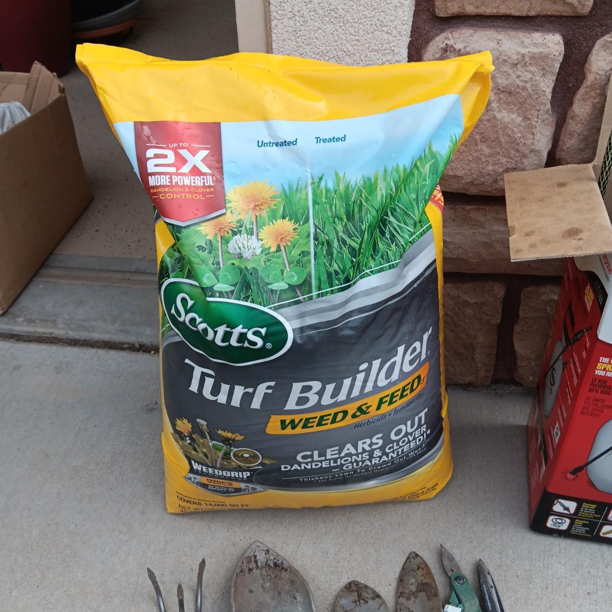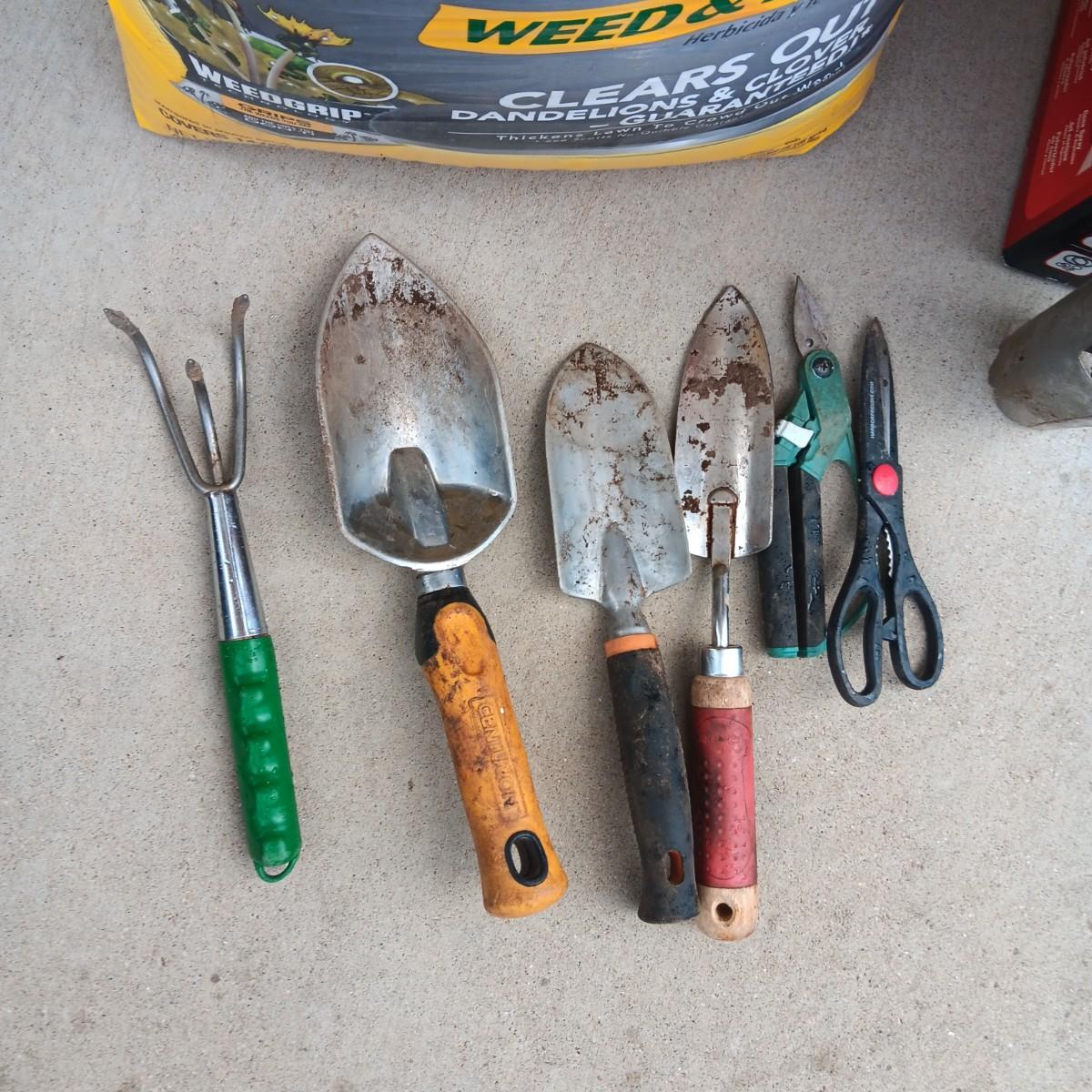 NEW BAG OF TURF BUILDER, WEED SPRAYER AND GARDEN TOOLS