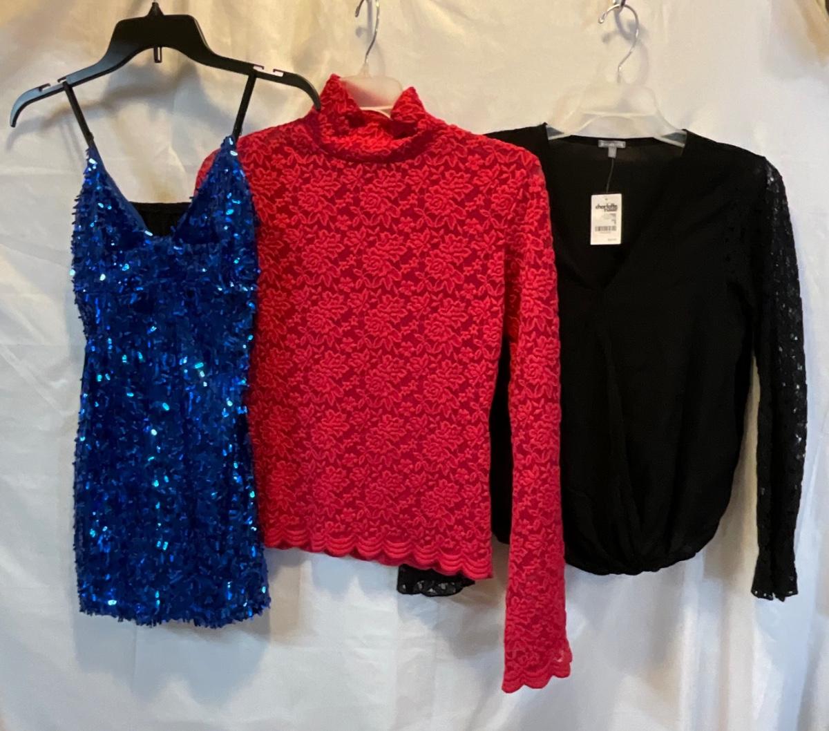 NEW black Charlotte Russe, Forenze red top, blue glitzy dress S