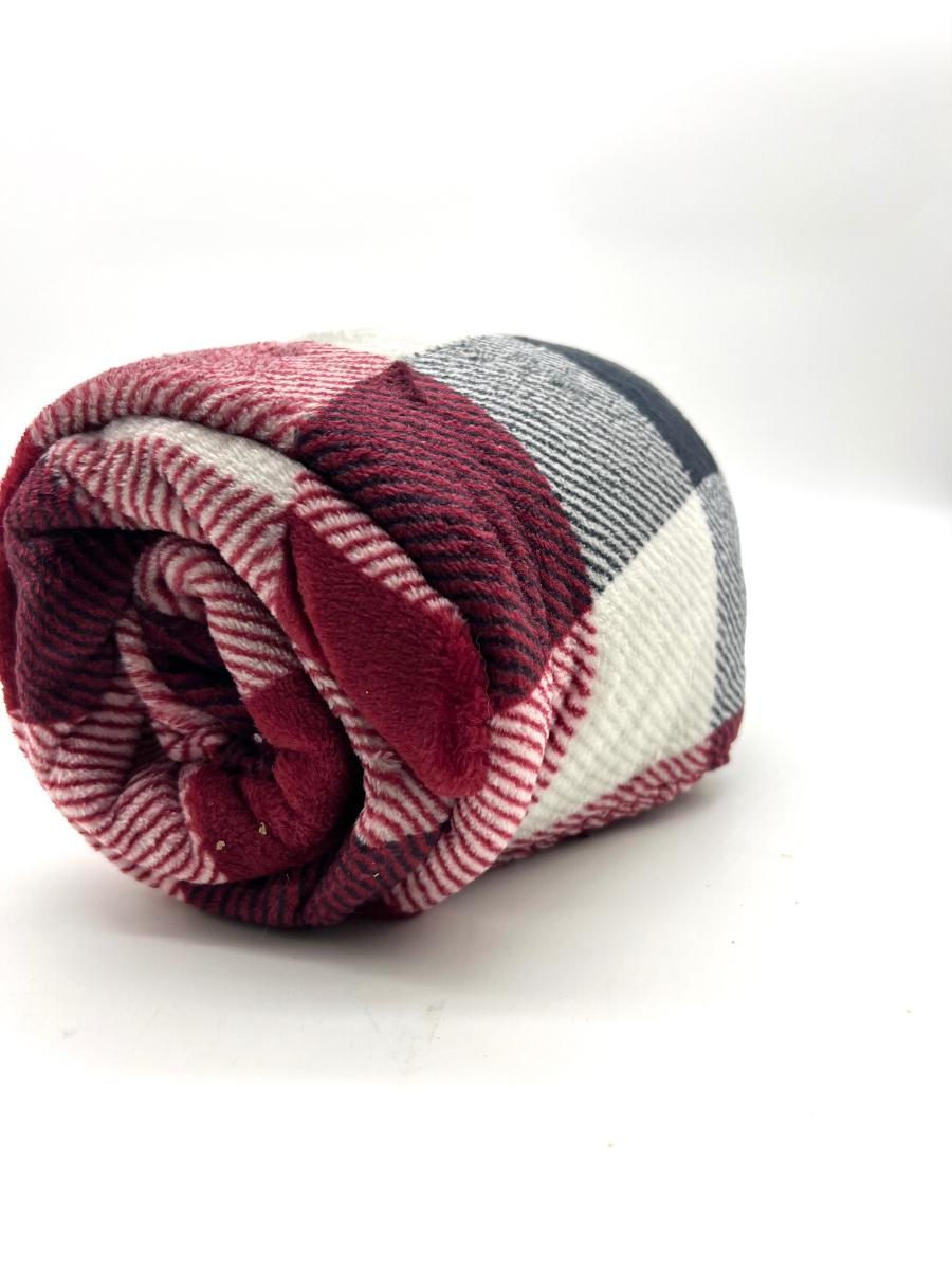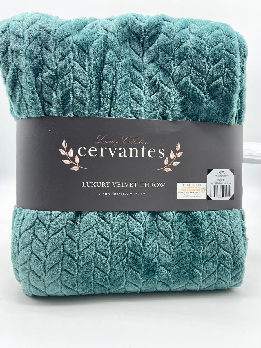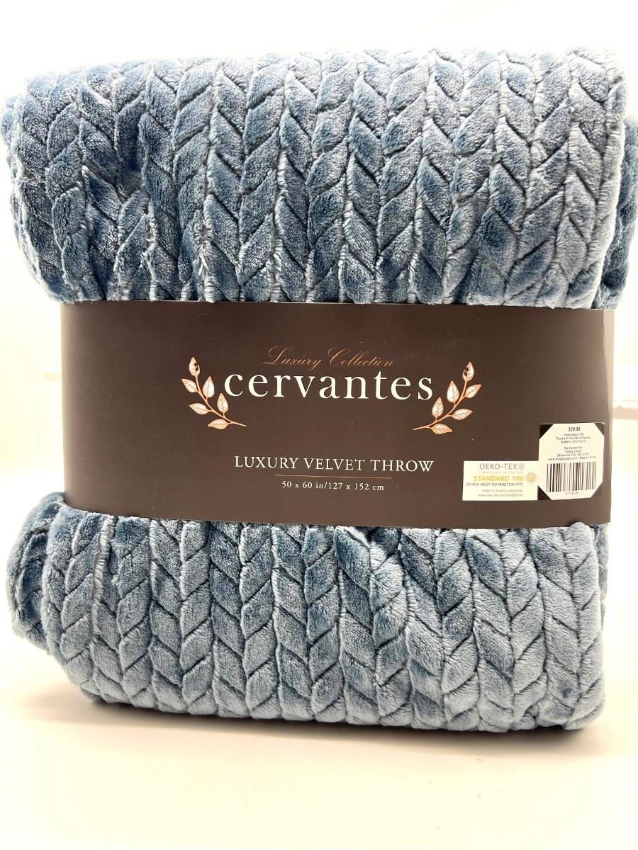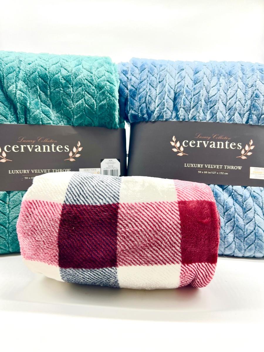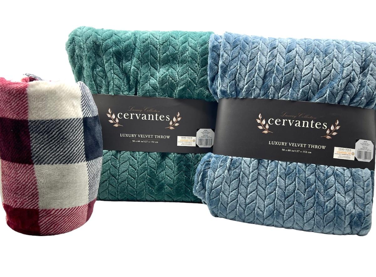 3 brand new blankets. Two luxury velvet throws are 50 x 60 inches colors are blue and green. Plaid blanket is also 50 x 60 inches.