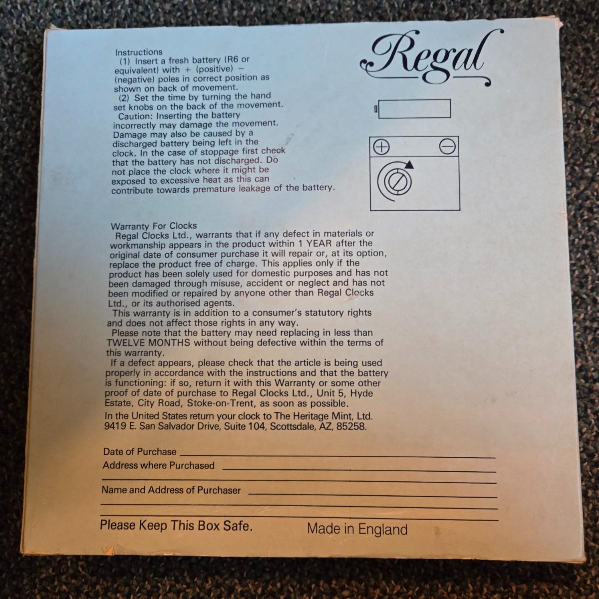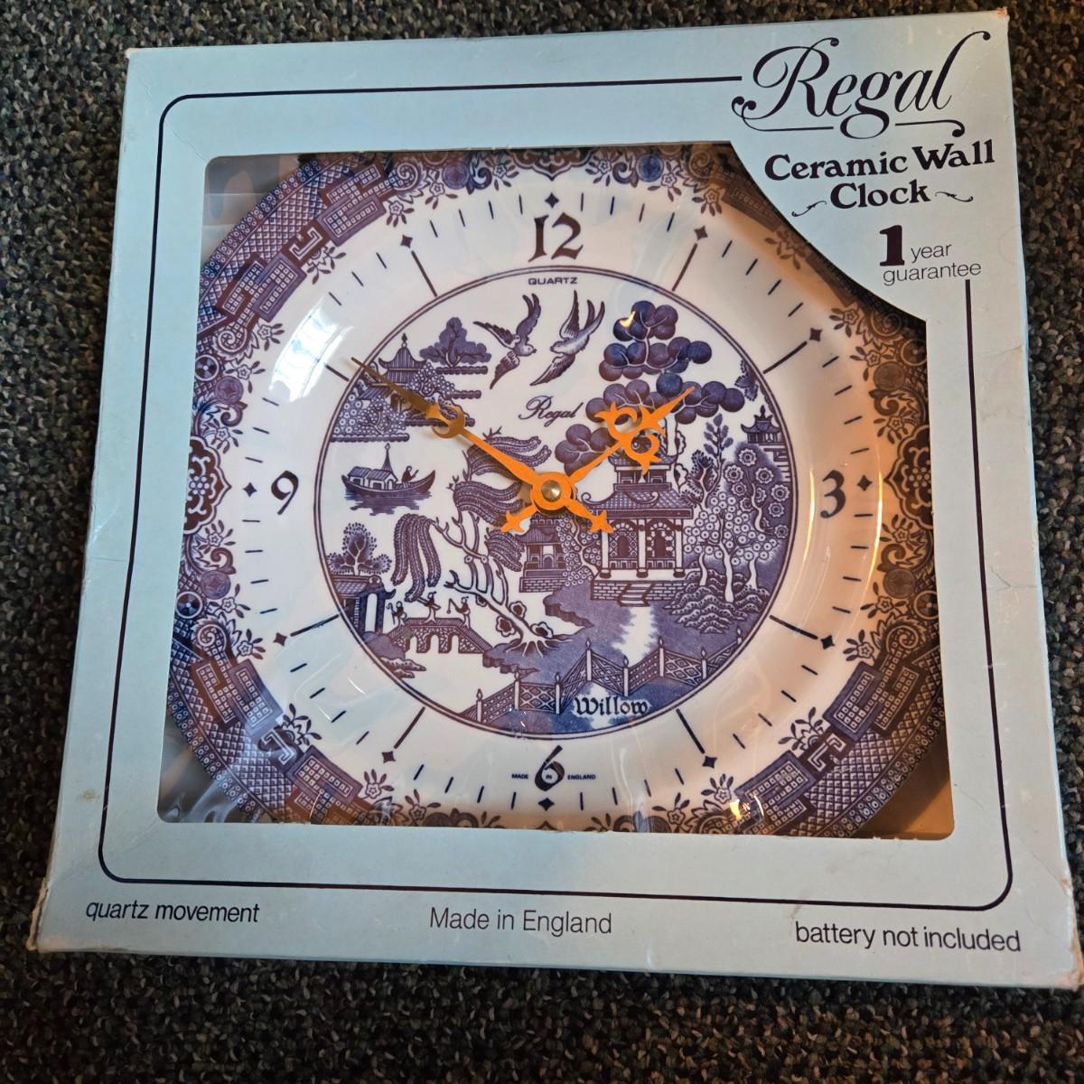This auction lot is for a Blue Willow Wall Clock. New in box made by Regal. This handsome clock features a Quartz movement centered on a beautiful ceramic plate made in England. The box appears to have never been opened. Box size is about 10.5-inches square.