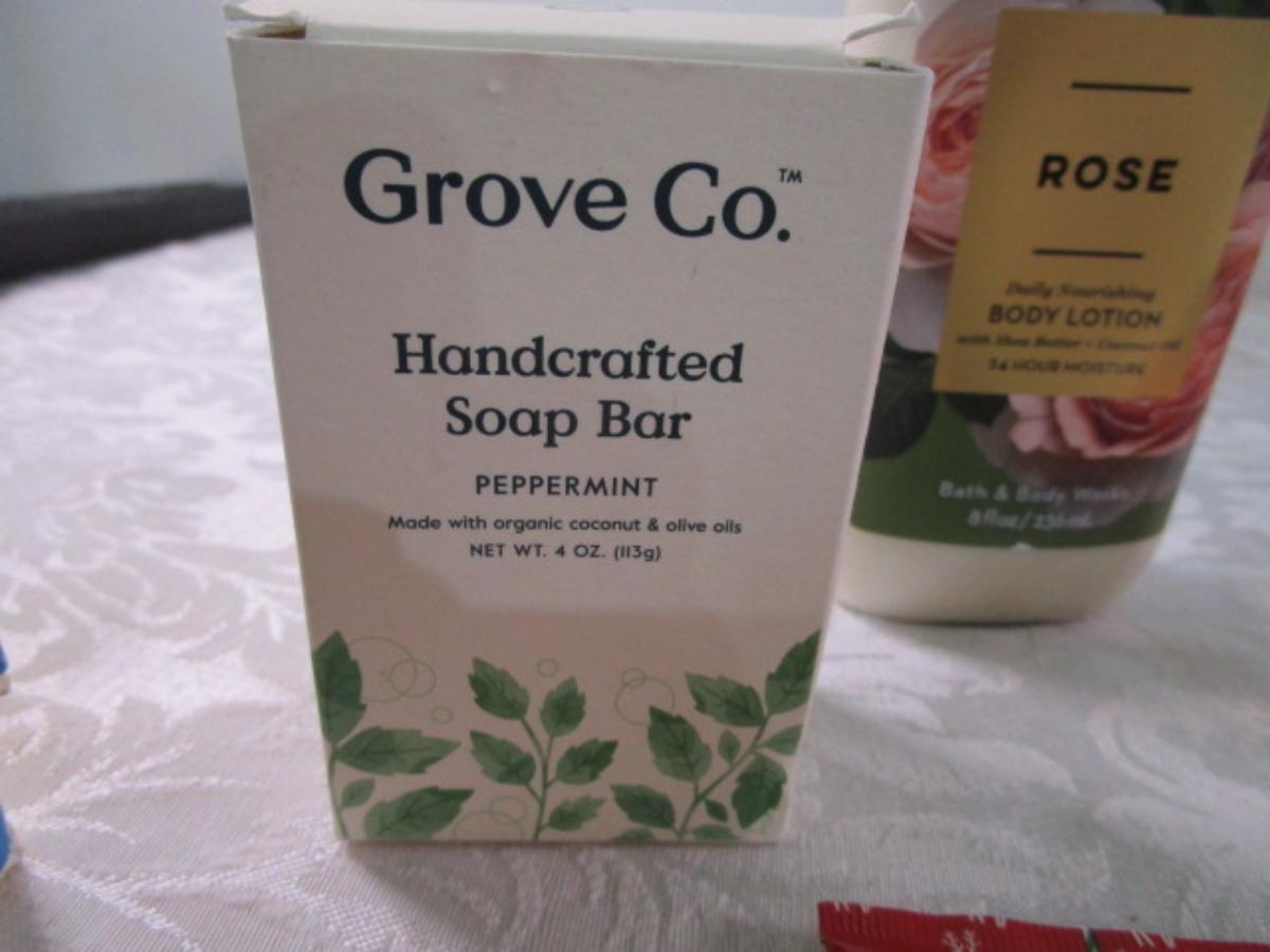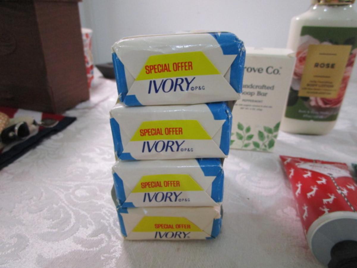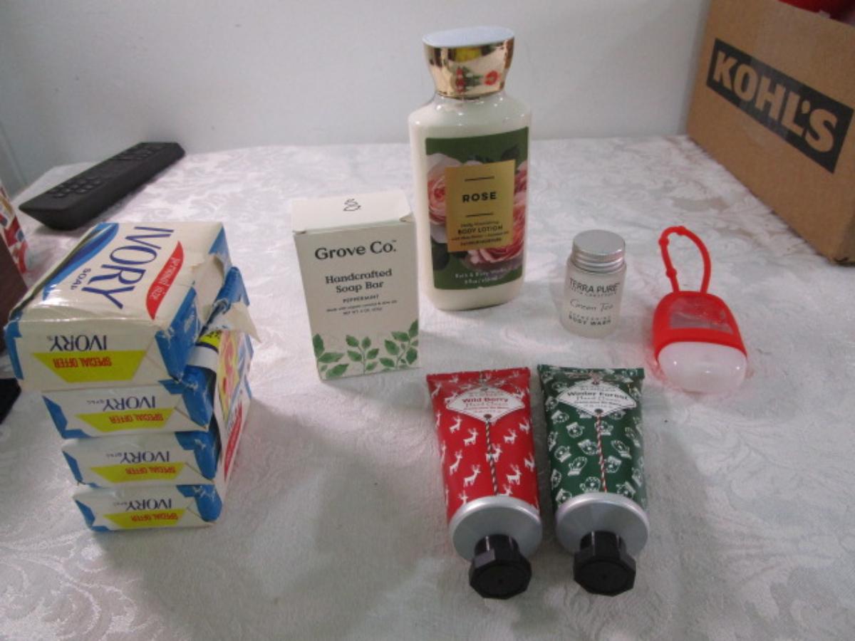 4 bars Ivory soap, hand sanitizer with purse hanger, Grove Co. Handcrafted soap bar-peppermint, Rose body lotion by Bath & Body Works, 2 tubes hand cream, green tea body wash