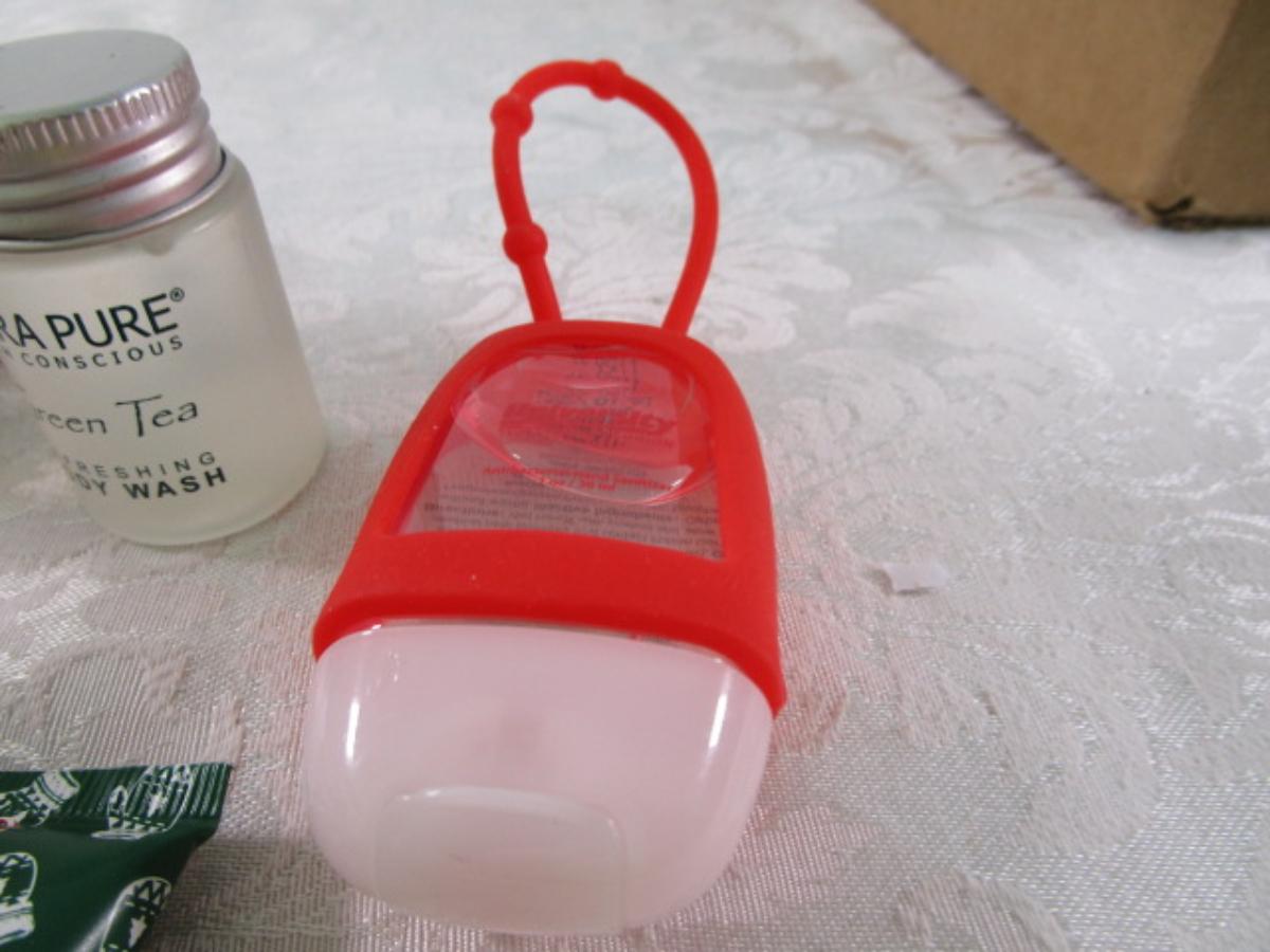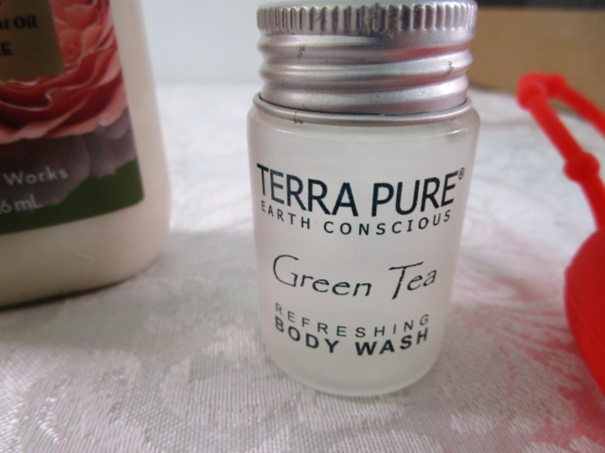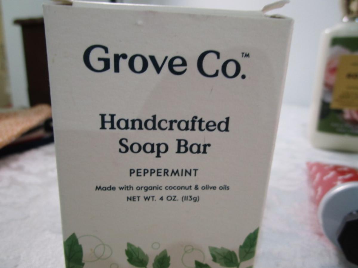 4 bars Ivory soap, hand sanitizer with purse hanger, Grove Co. Handcrafted soap bar-peppermint, Rose body lotion by Bath & Body Works, 2 tubes hand cream, green tea body wash