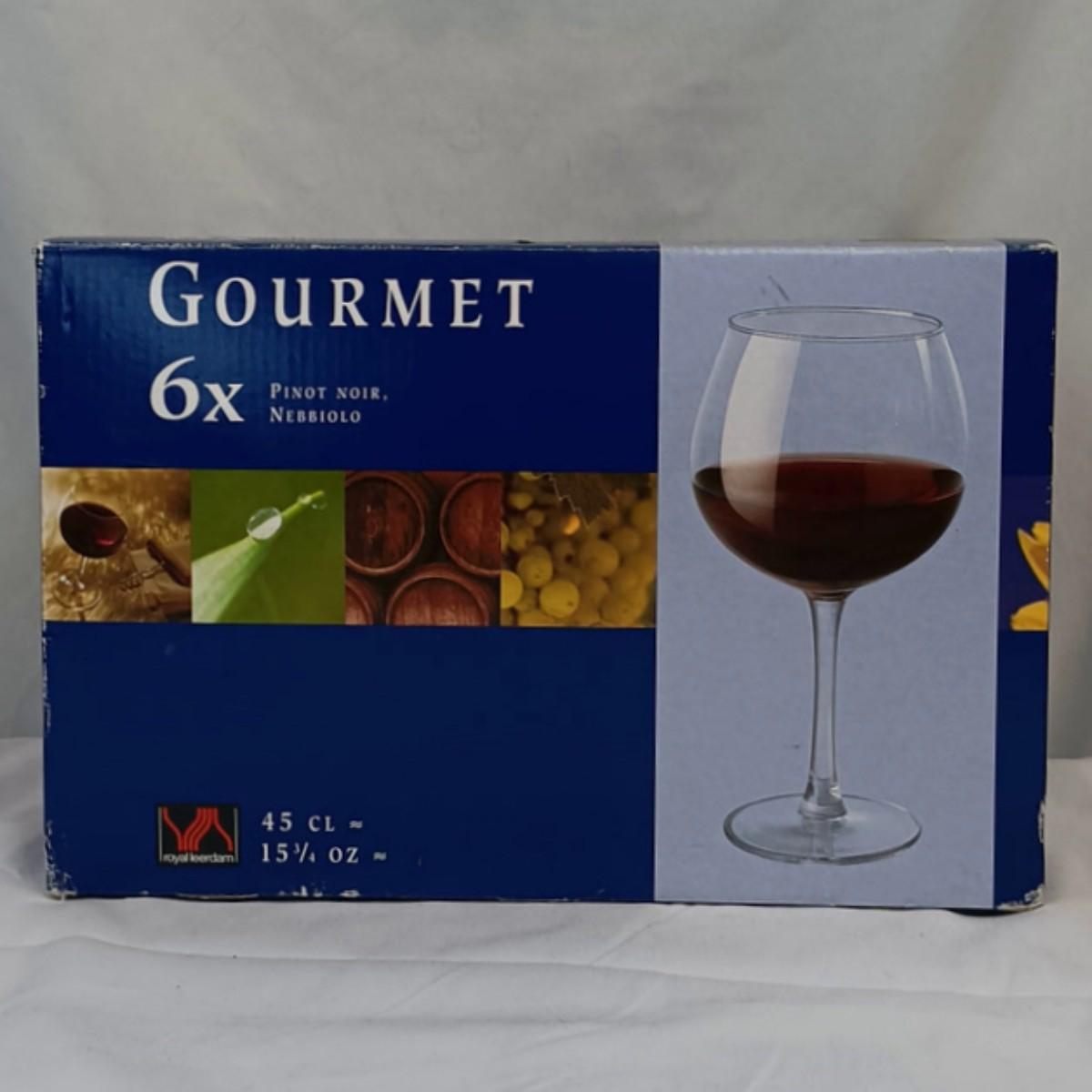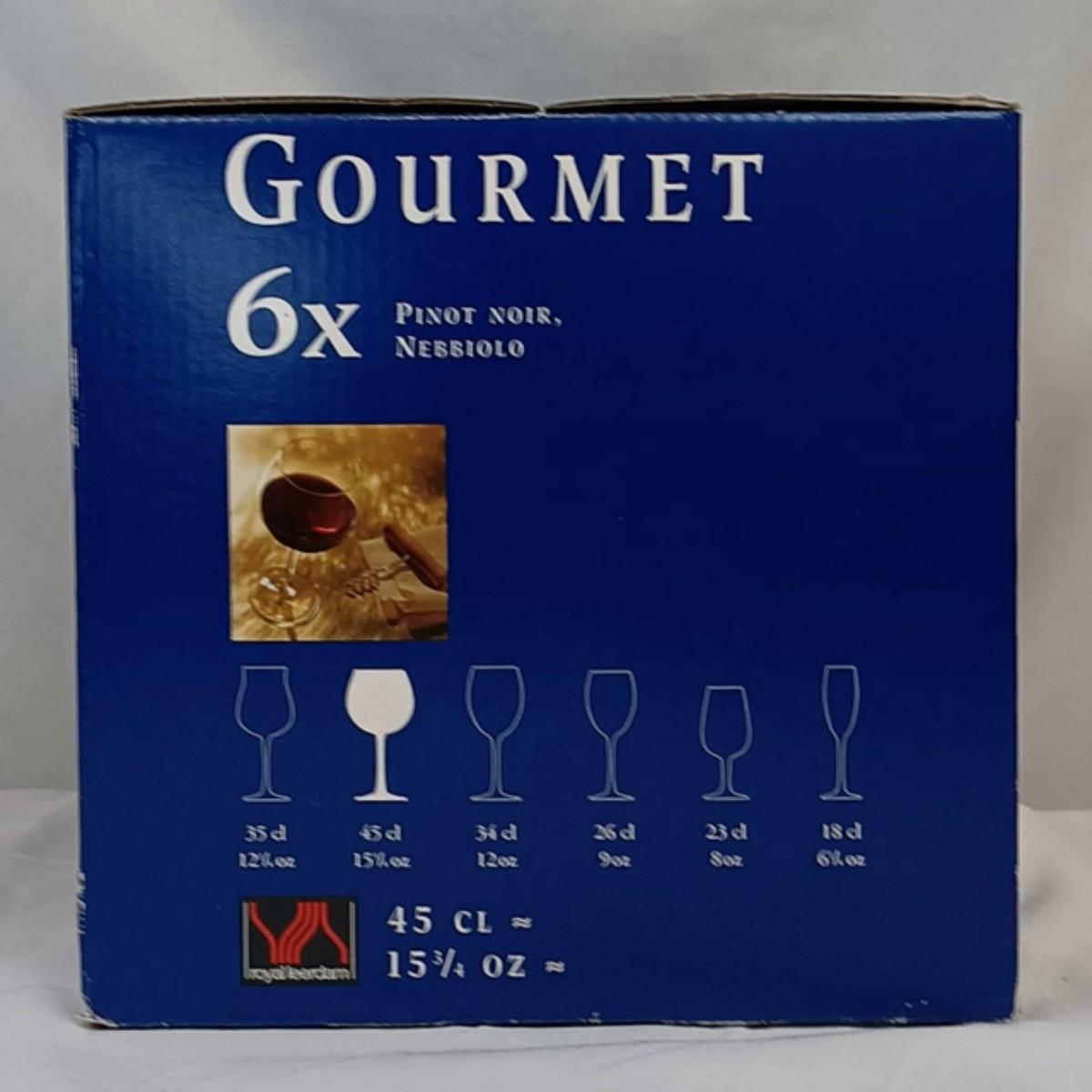 This is a brand new box of six wine glasses. Each glass holds approximately 16 oz.