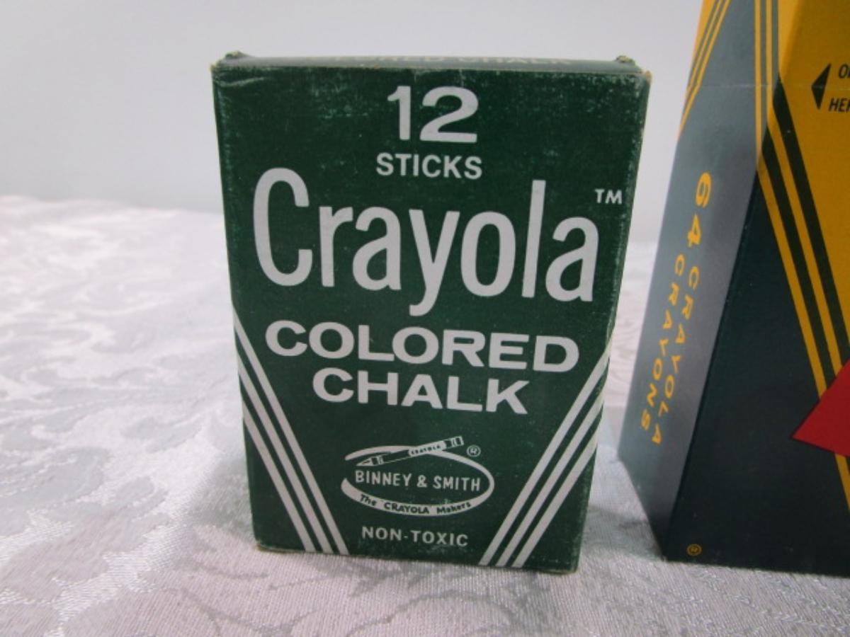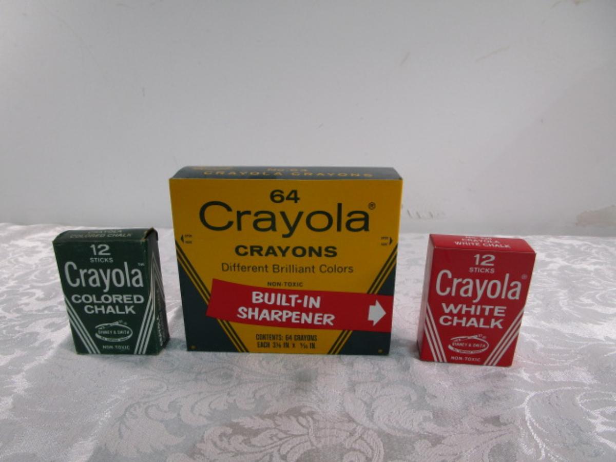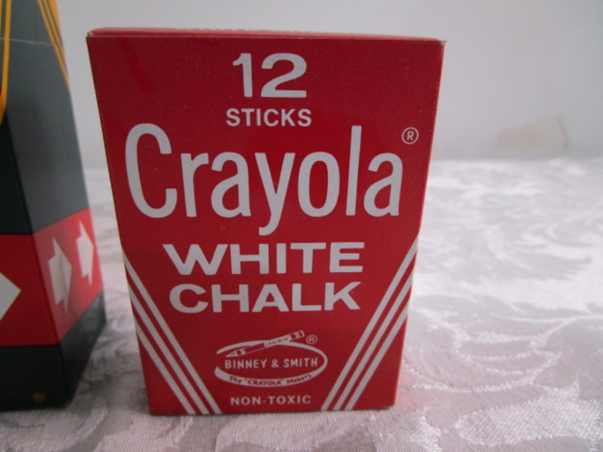 Chalk is 12 sticks each (one box is white chalk, the other is colored), 64 pk of Crayola Crayons with sharpener