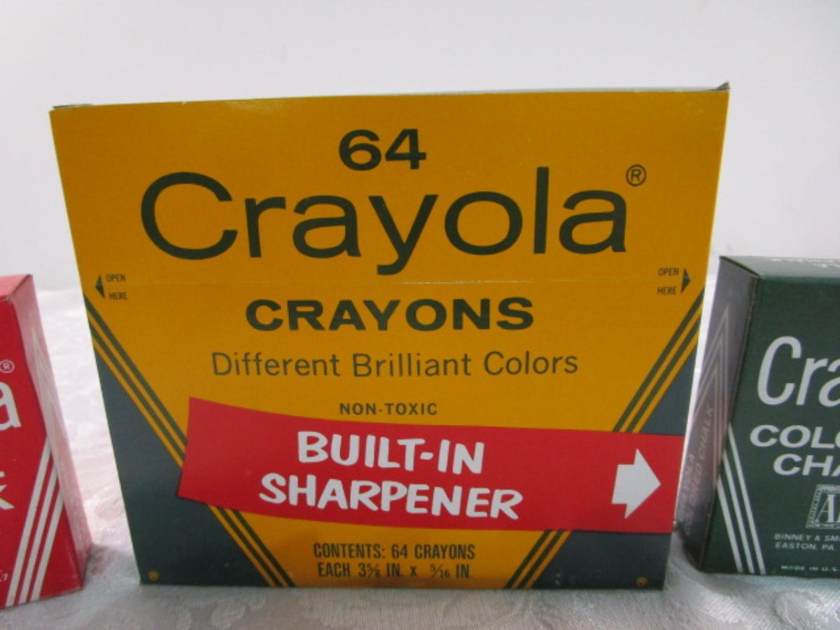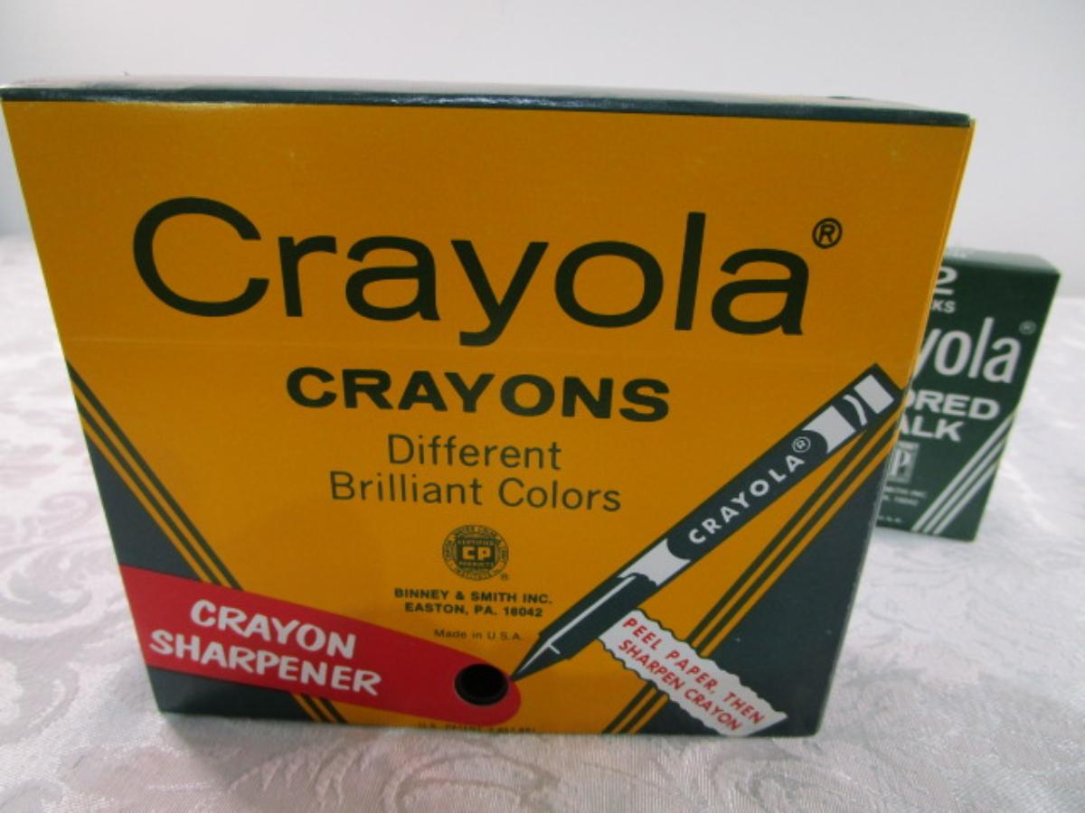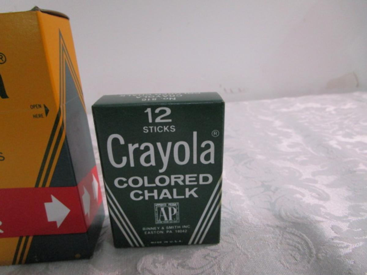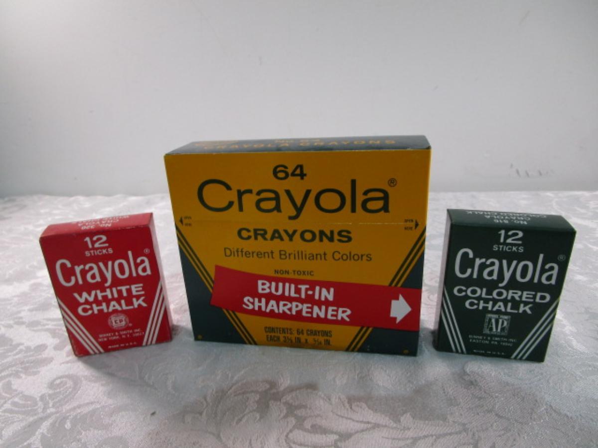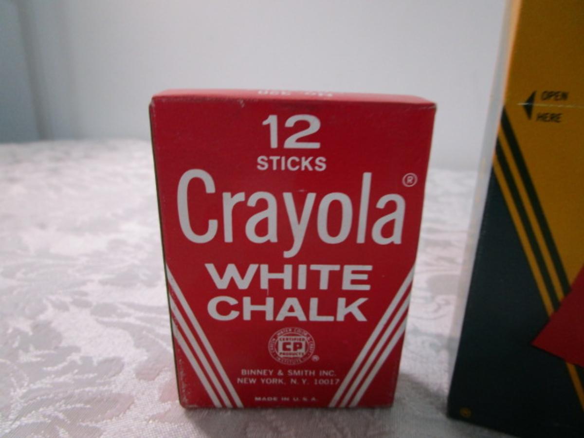 Chalk is 12 sticks each (one box is white chalk, the other is colored), 64 pk of Crayola Crayons with sharpener