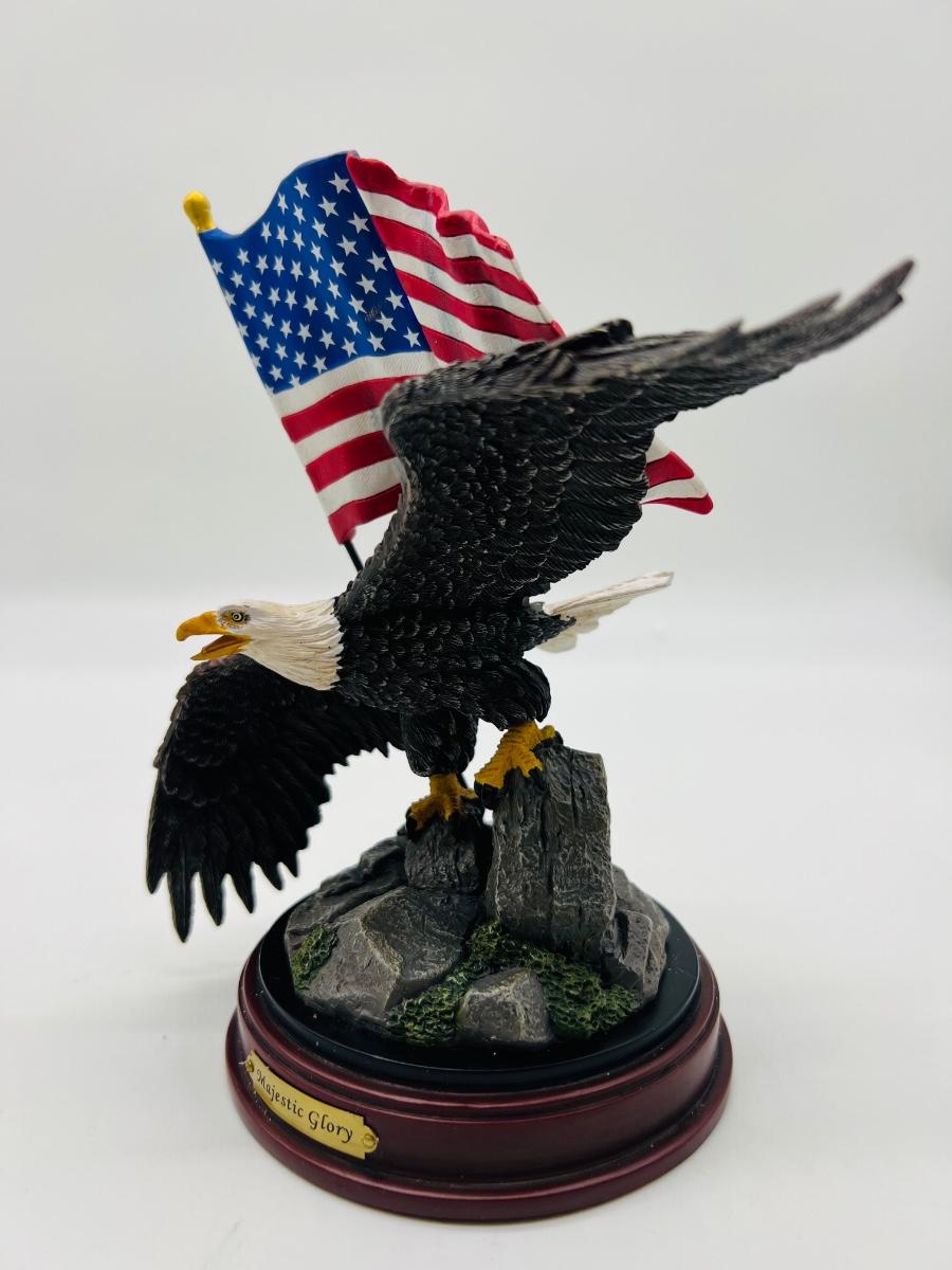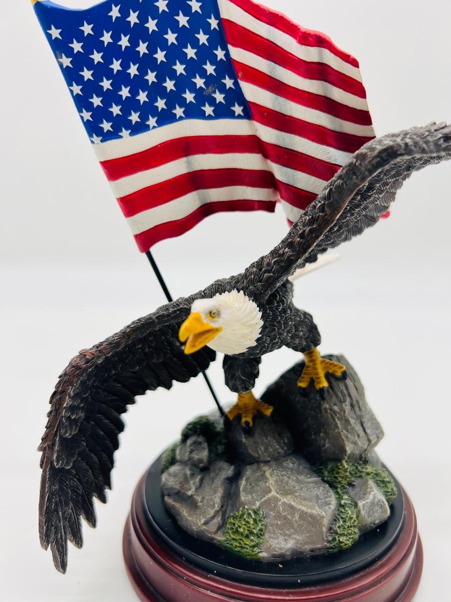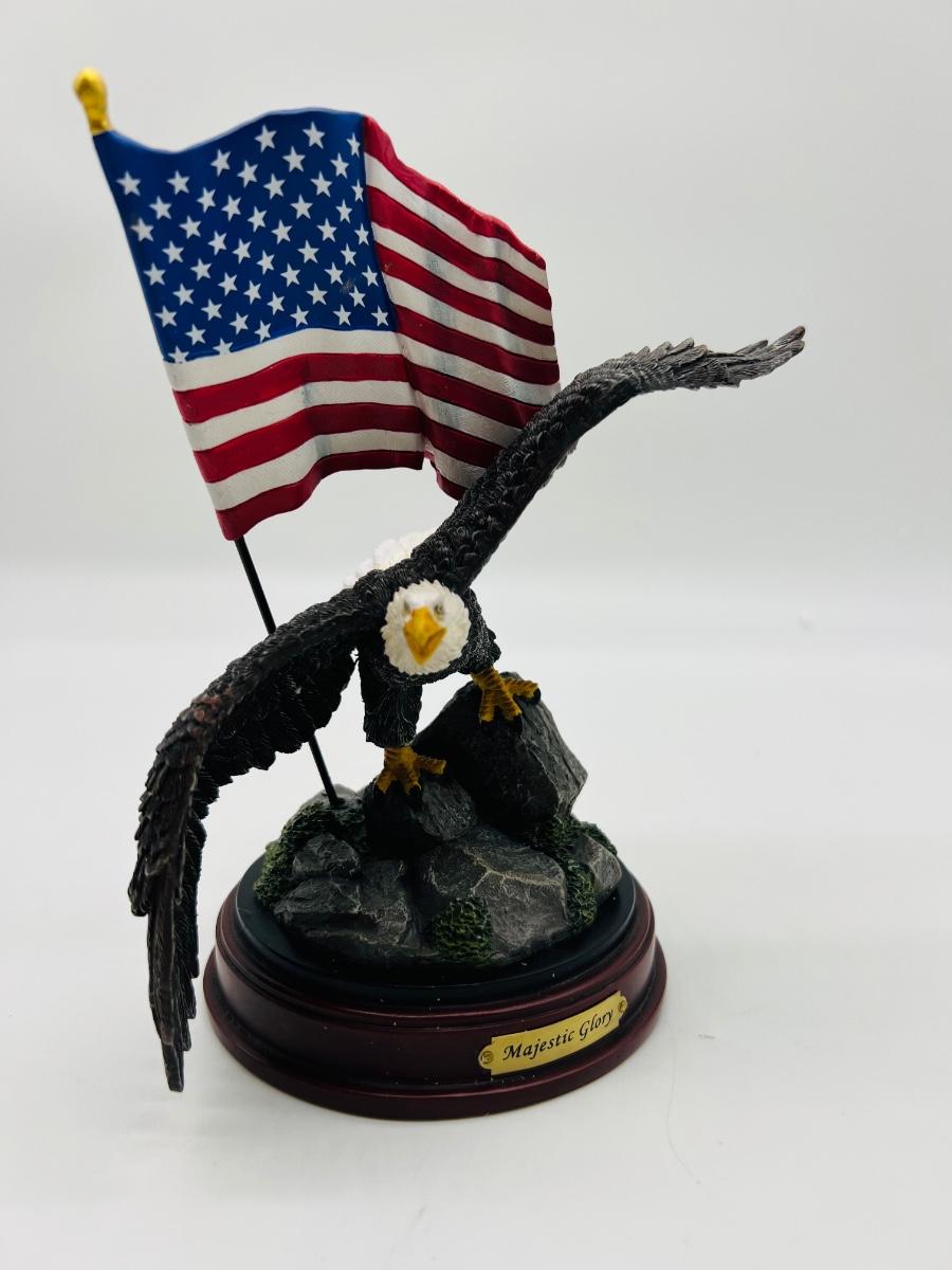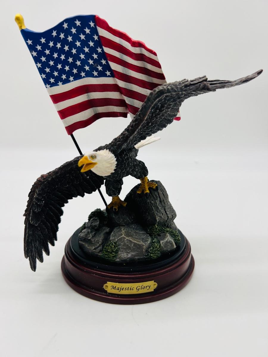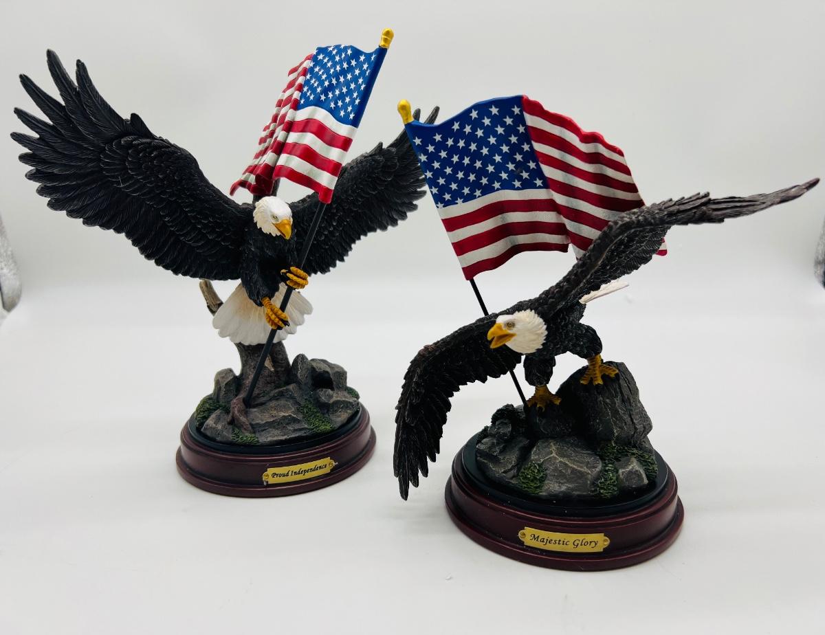 Just unboxed for pictures, never displayed. Two BRADFORD EXCHANGE “Proud Independence” & “Majestic Glory“ flag statues. Proud independence#A1357 measures 9 inches tall and approximately 9 inches wide at wingspan. Majestic glory#A0885 measures 7 inches tall and 8 inches wide at wingspan.