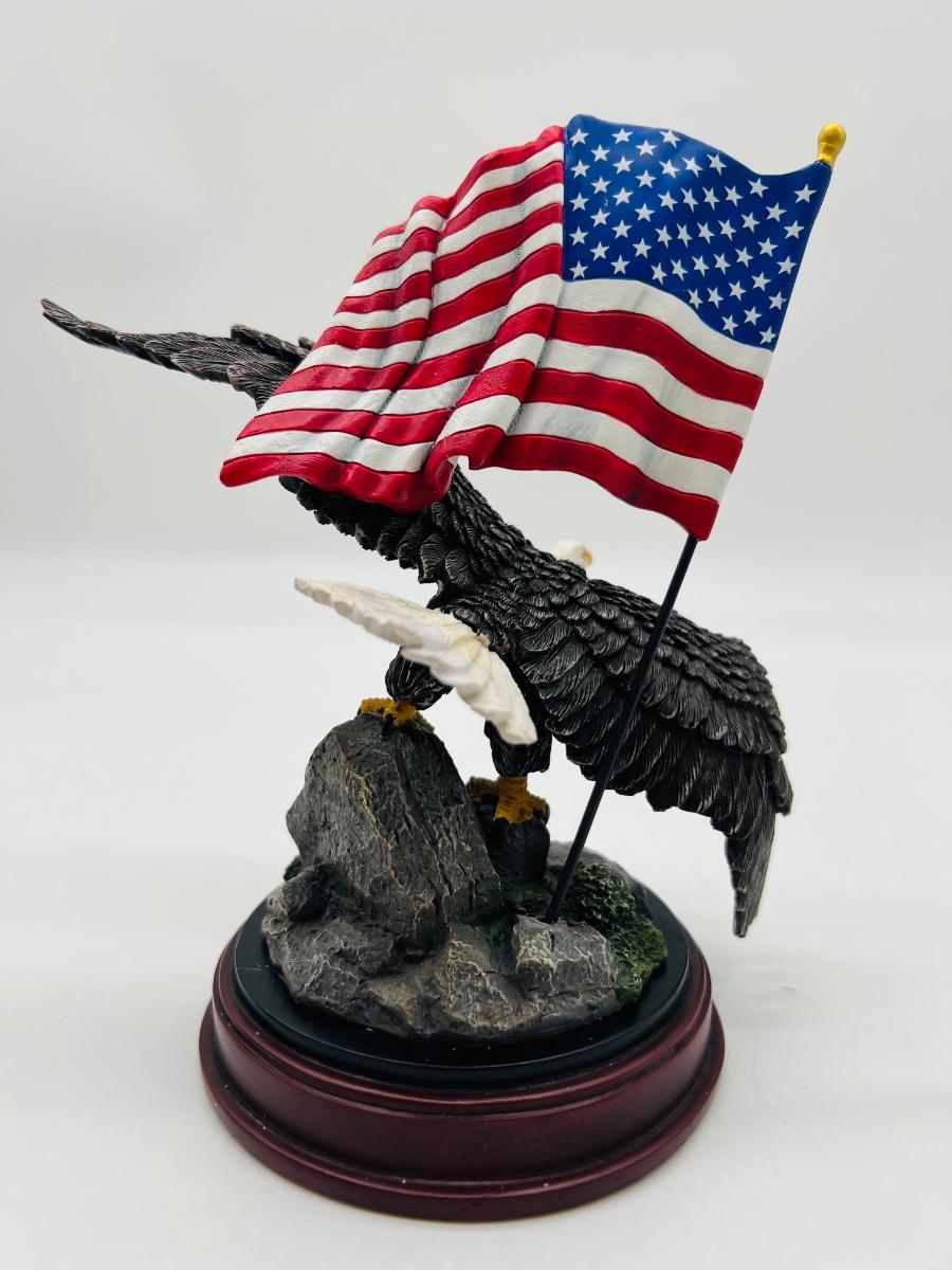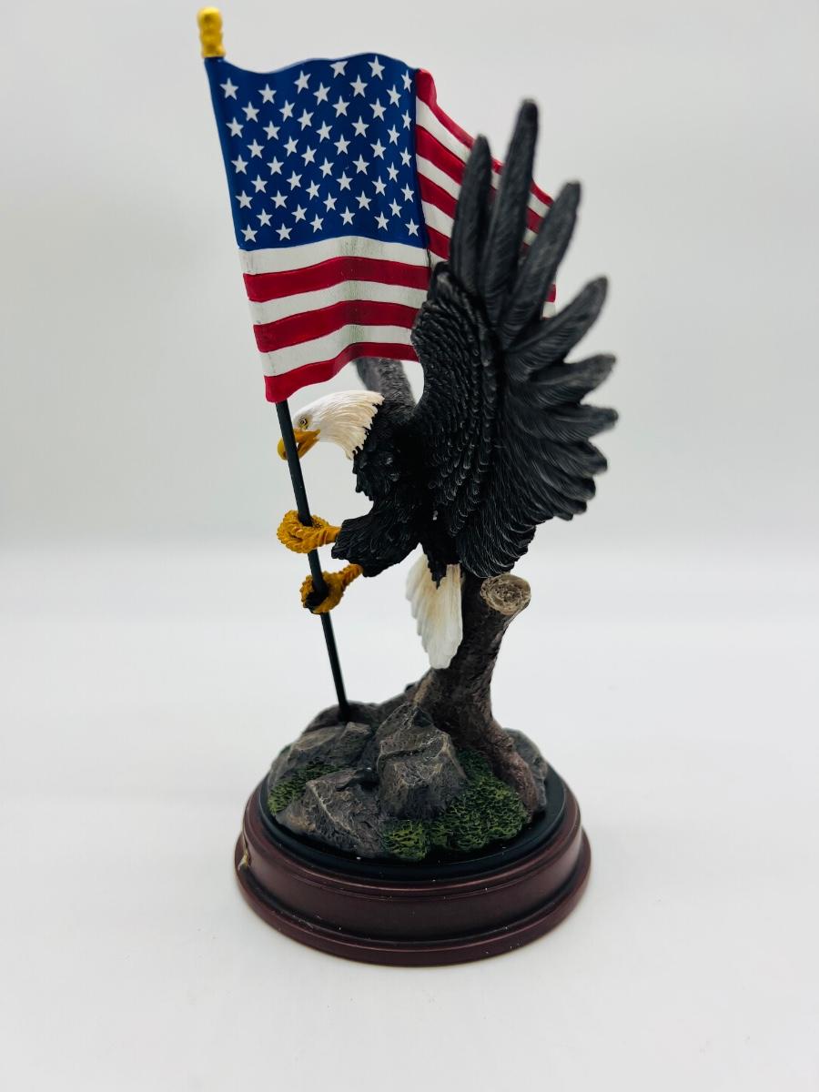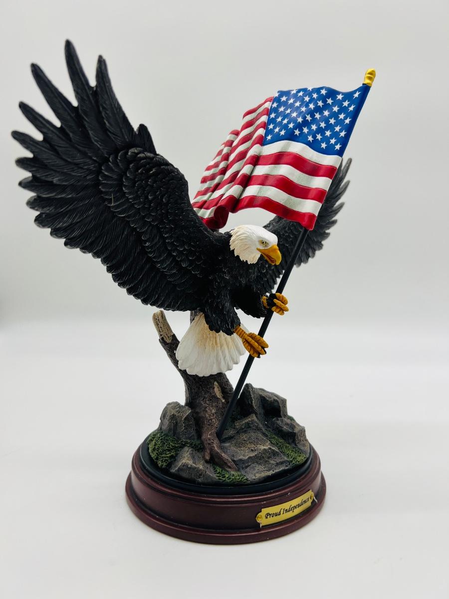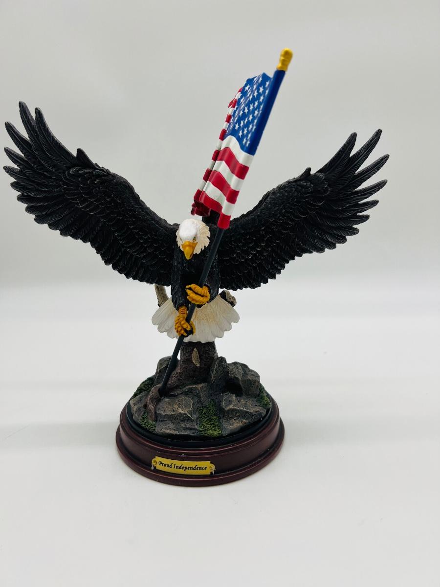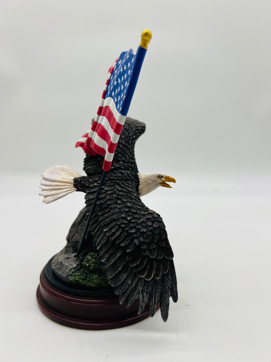 Just unboxed for pictures, never displayed. Two BRADFORD EXCHANGE “Proud Independence” & “Majestic Glory“ flag statues. Proud independence#A1357 measures 9 inches tall and approximately 9 inches wide at wingspan. Majestic glory#A0885 measures 7 inches tall and 8 inches wide at wingspan.