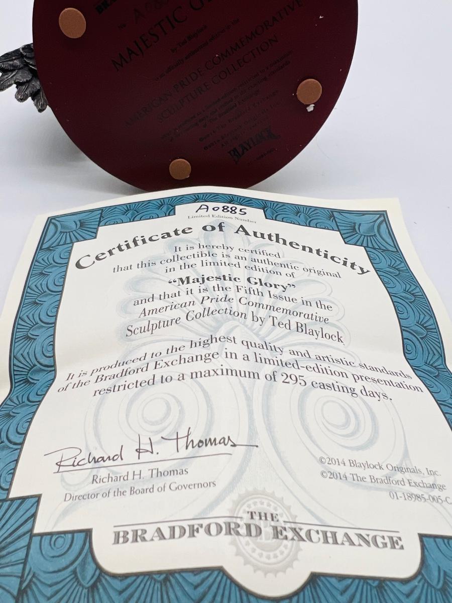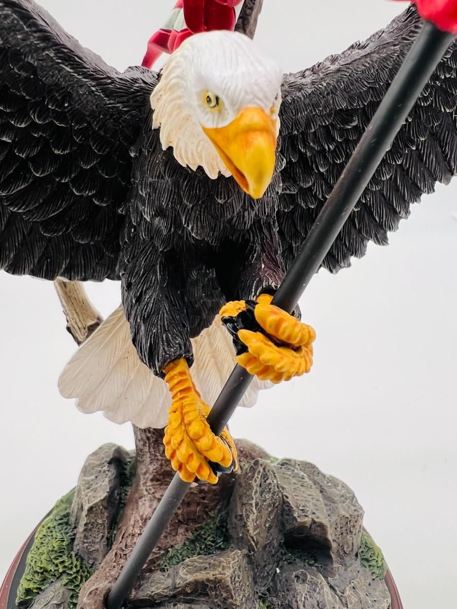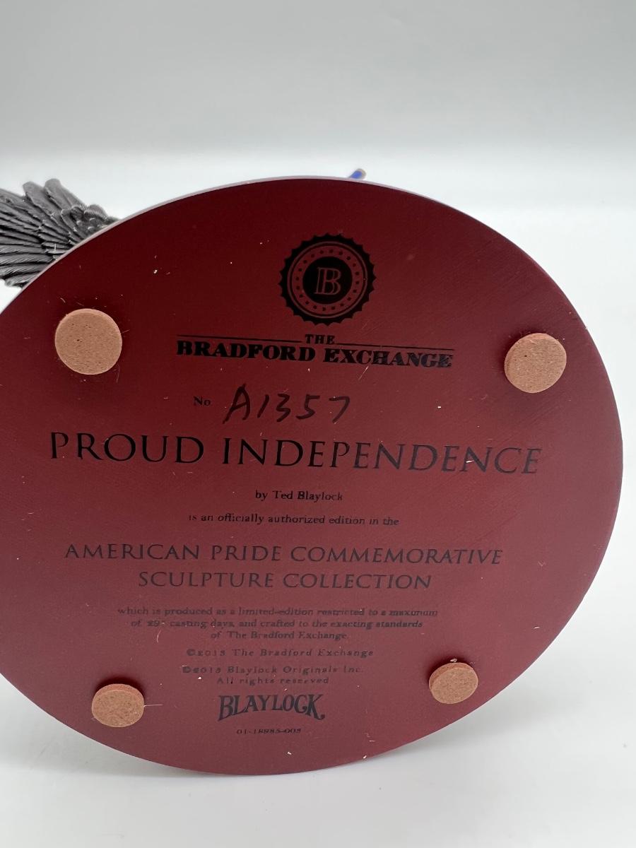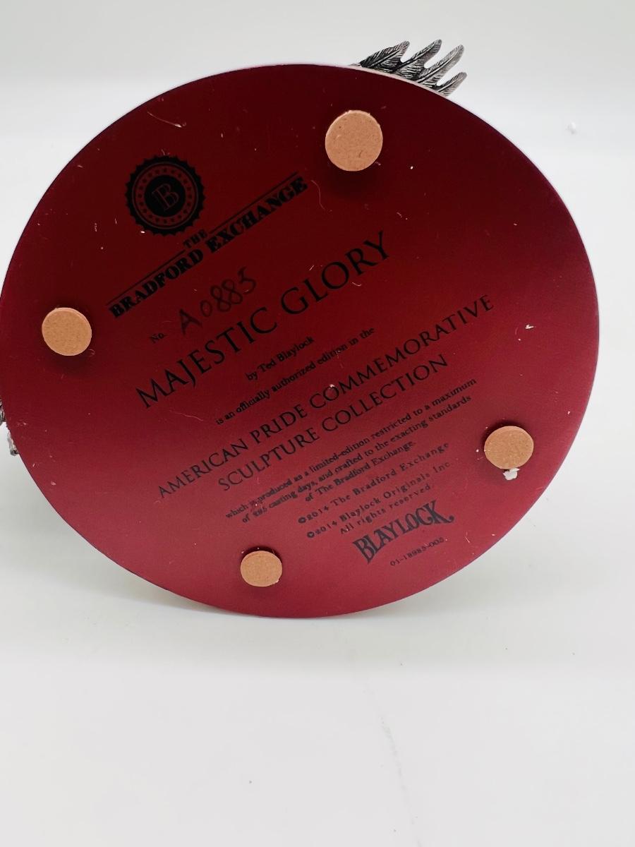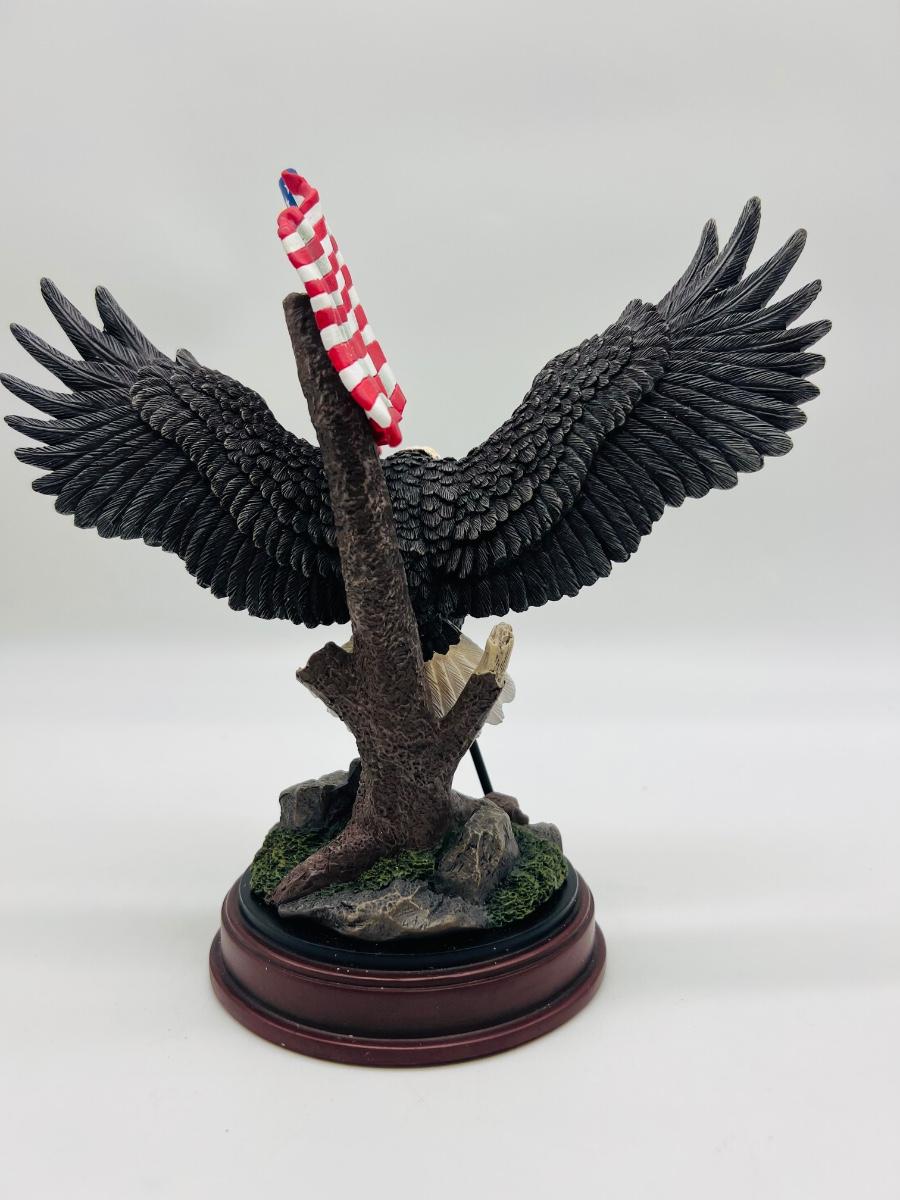 Just unboxed for pictures, never displayed. Two BRADFORD EXCHANGE “Proud Independence” & “Majestic Glory“ flag statues. Proud independence#A1357 measures 9 inches tall and approximately 9 inches wide at wingspan. Majestic glory#A0885 measures 7 inches tall and 8 inches wide at wingspan.