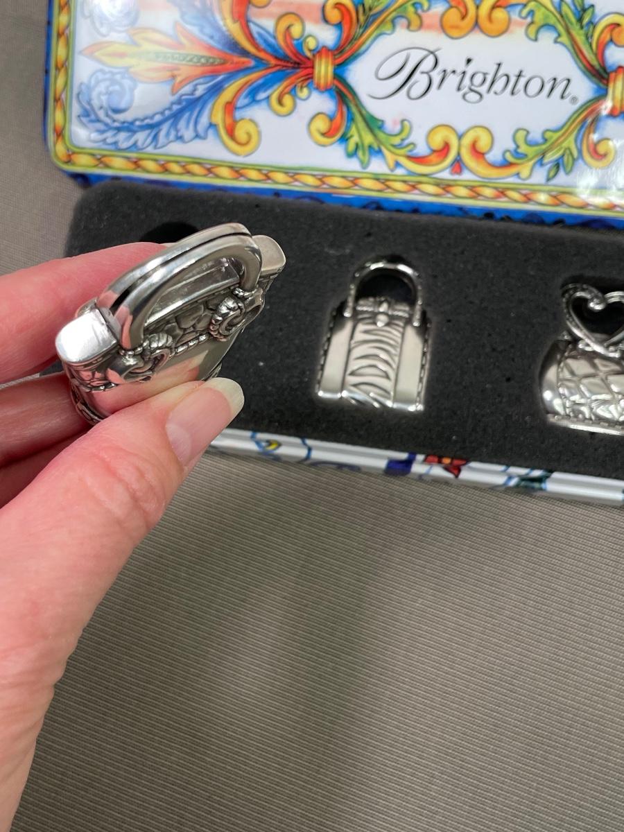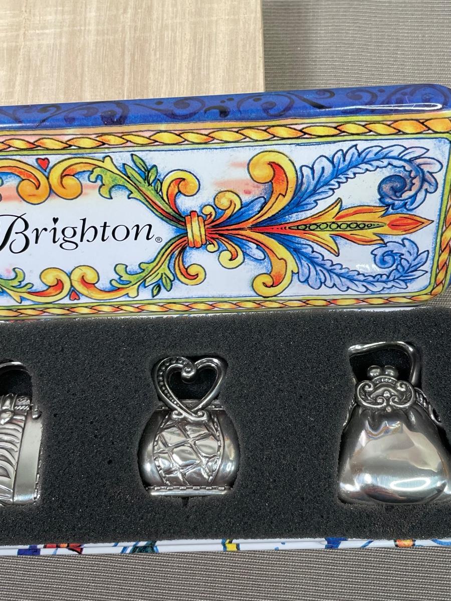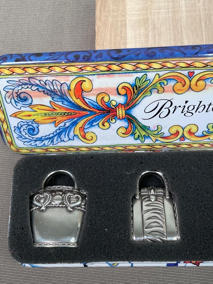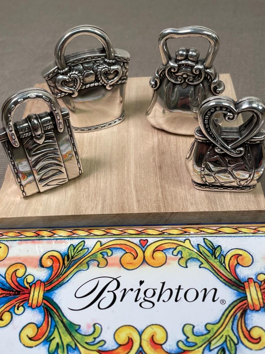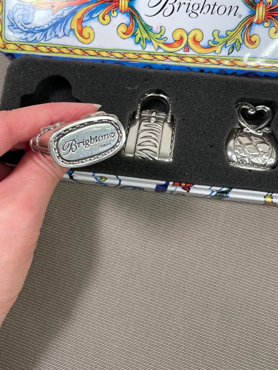 Cute weighted metal mini purses set of 4. Use as decor, paperweights or maybe a card holder as it has a small slot on top. Comes in tin box.