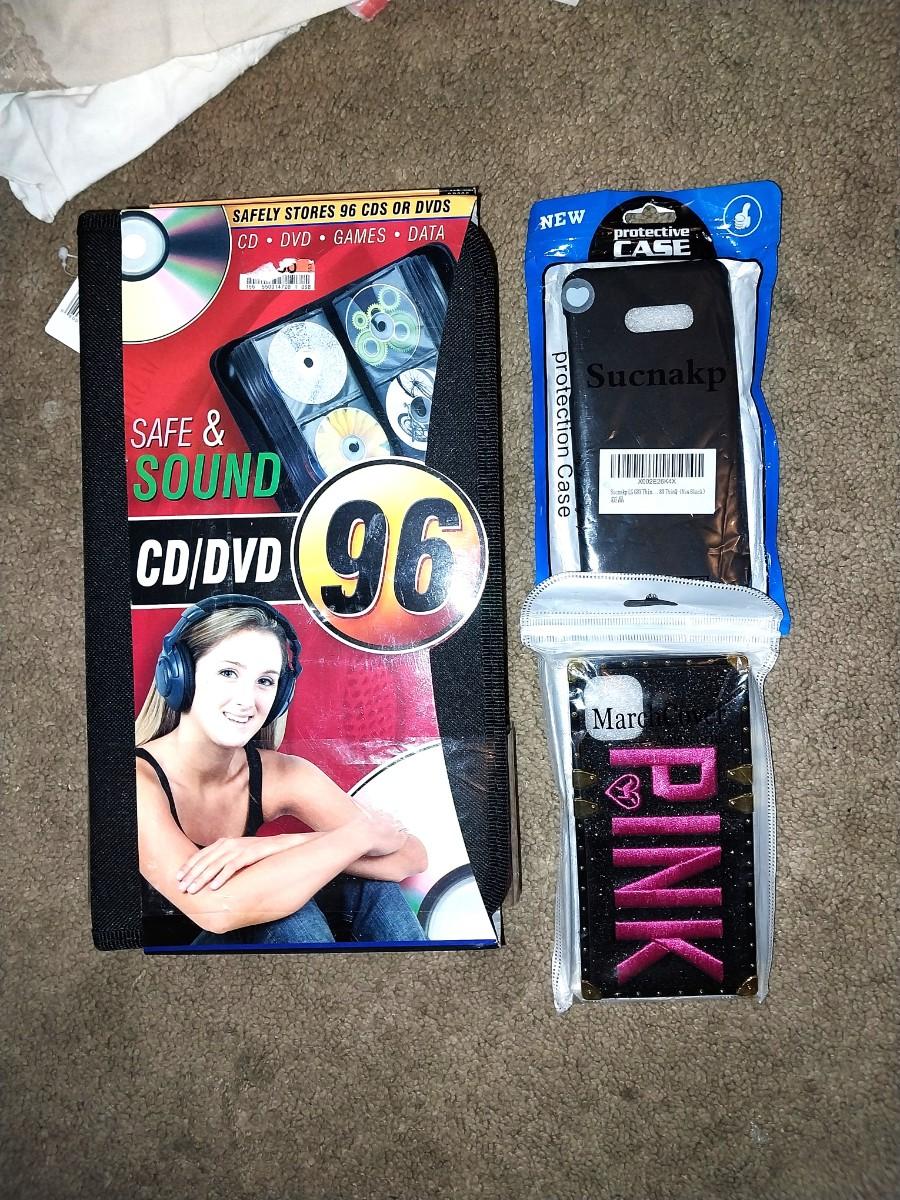 NEW CD/DVD HOLDER AND TWO NEW PHONE CASES