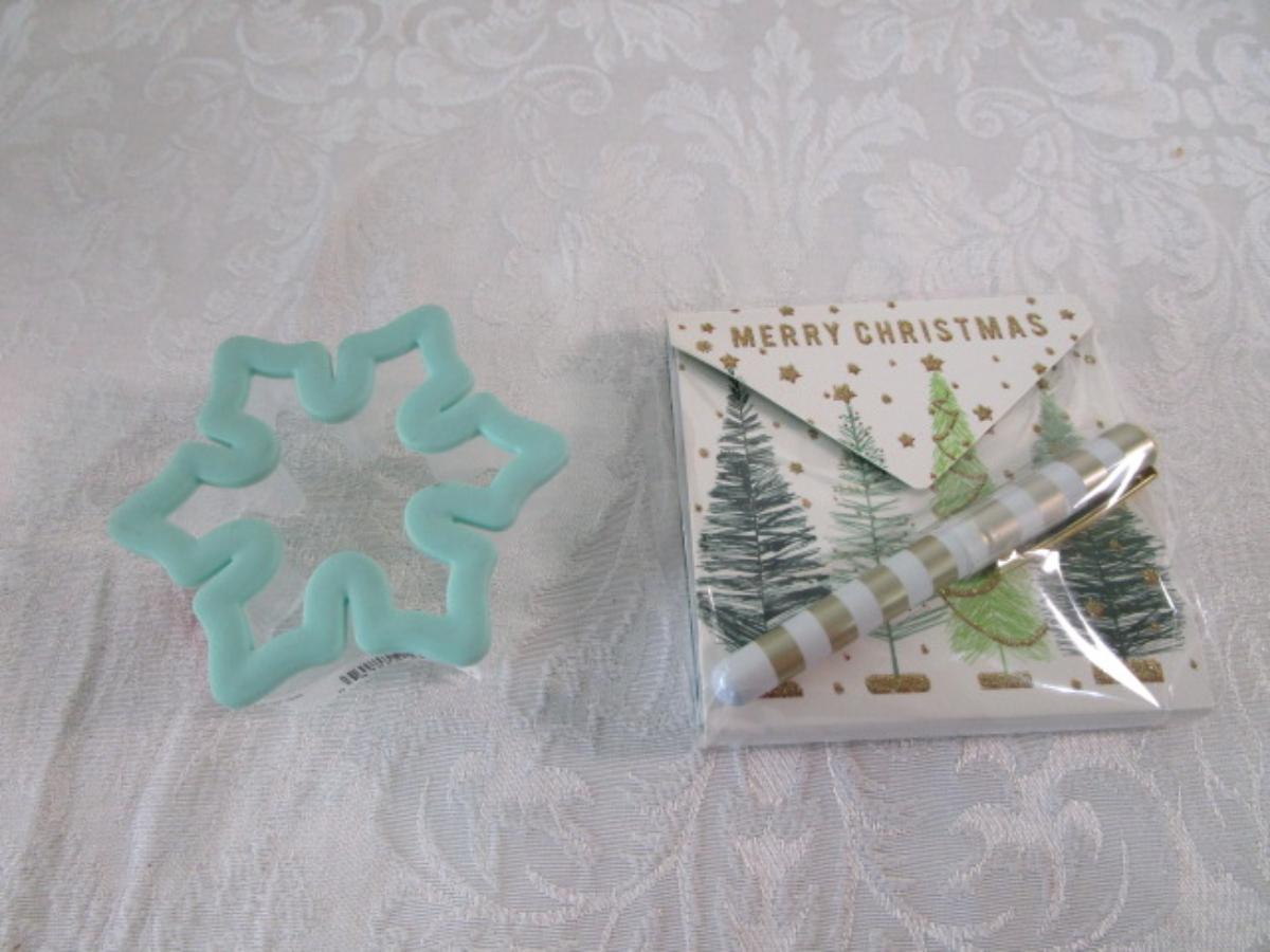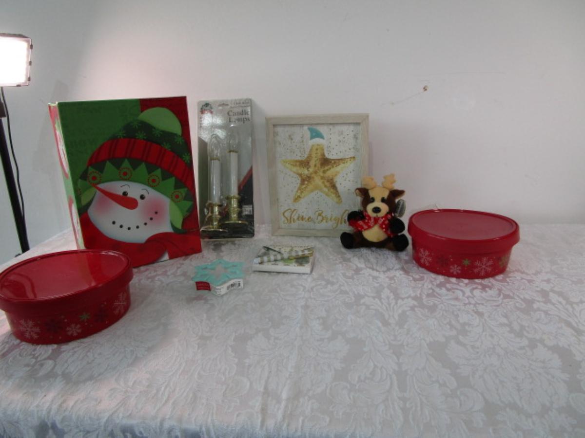 1 large gift box, 11-1/2" x 8"x 5" deep, 2 plastic round gift containers, Coca Cola bean bag plush Reindeer, battery operated candles each takes 2 AA batteries not included, "Shine Bright" picture 8" x 10", Merry Christmas note pad with pen, snowflake cookie cutter