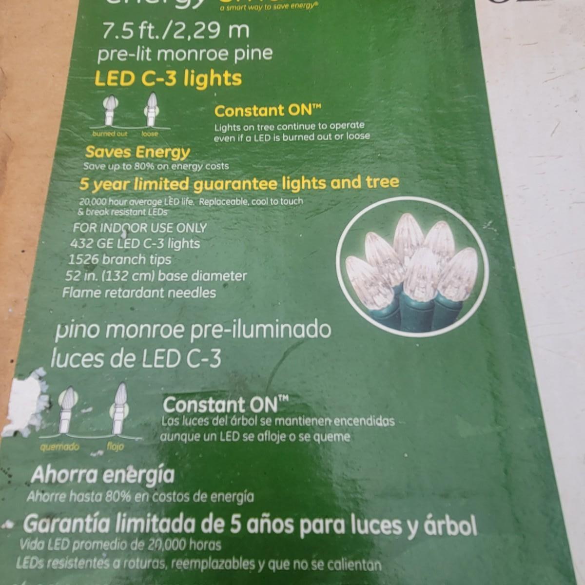 7.5ft prelit Monroe pine Christmas tree. Wired with C-3 led light and is in original, unopened package. Has 432 leds, 1526 branch tips and measures 52" at the base. Local pickup only