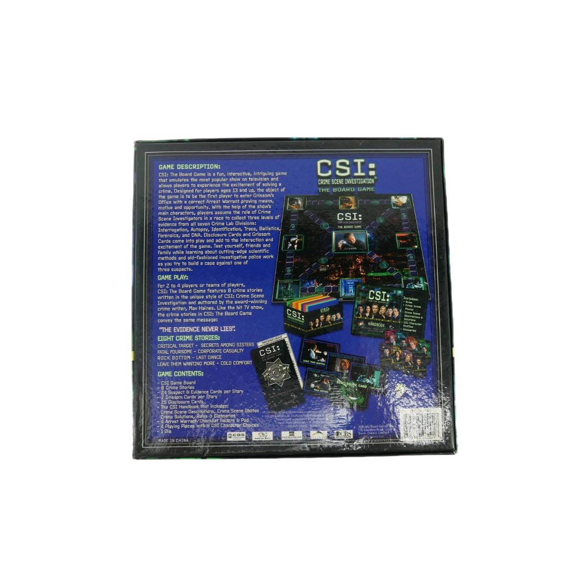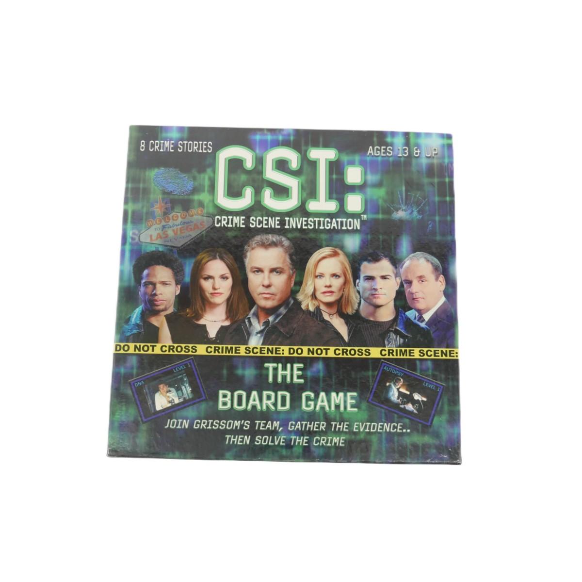 New, open box CSI: The Board Game. Some pieces are still packaged, others are not. All game pieces look to be present. Packaged lot measures 11" x 11" x 4, weighs 3 lbs. (M66)