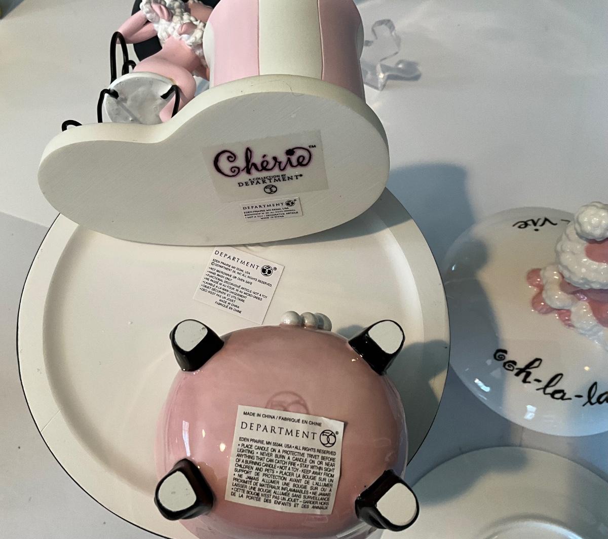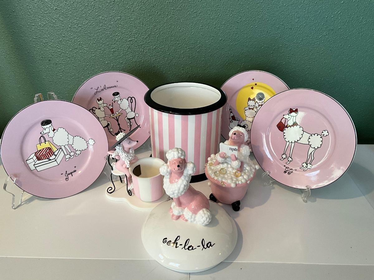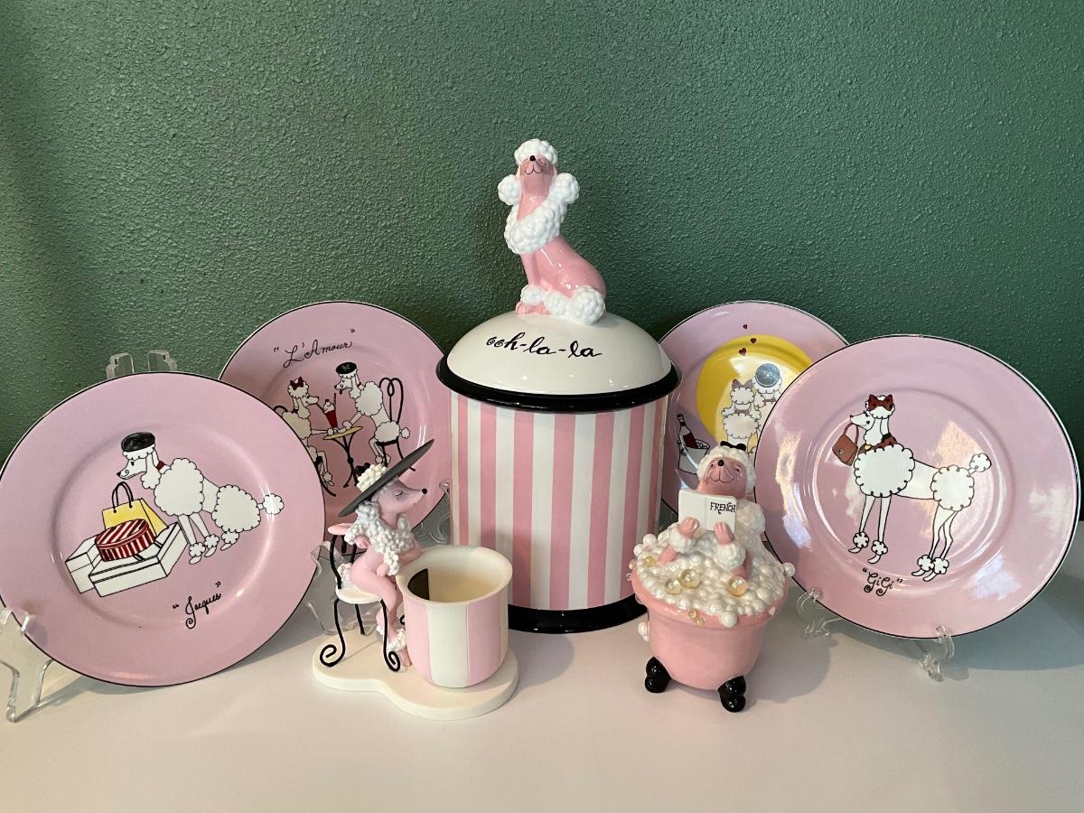 NEW Department 56, Cookie Jar, Candle, Tooth Pick holder, plus 4 pink poodle plates