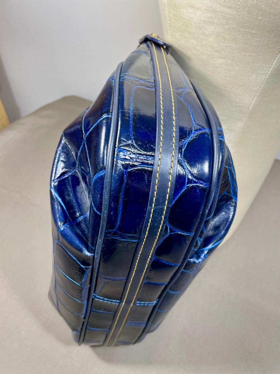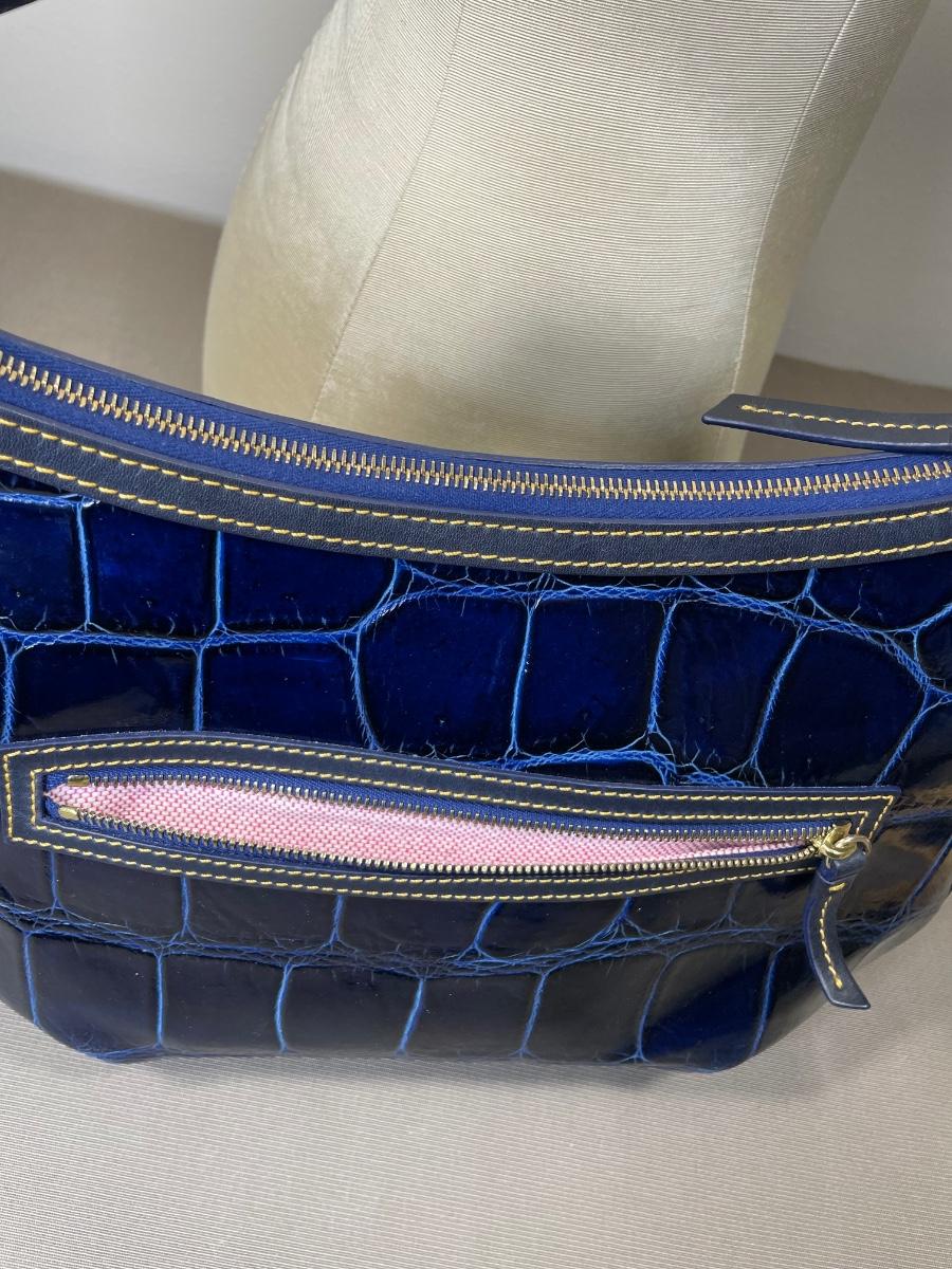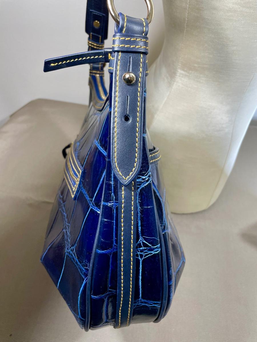 In blue croc embossed leather. Gorgeous bag includes dust cover. Retail $300+