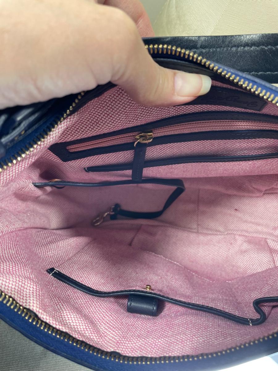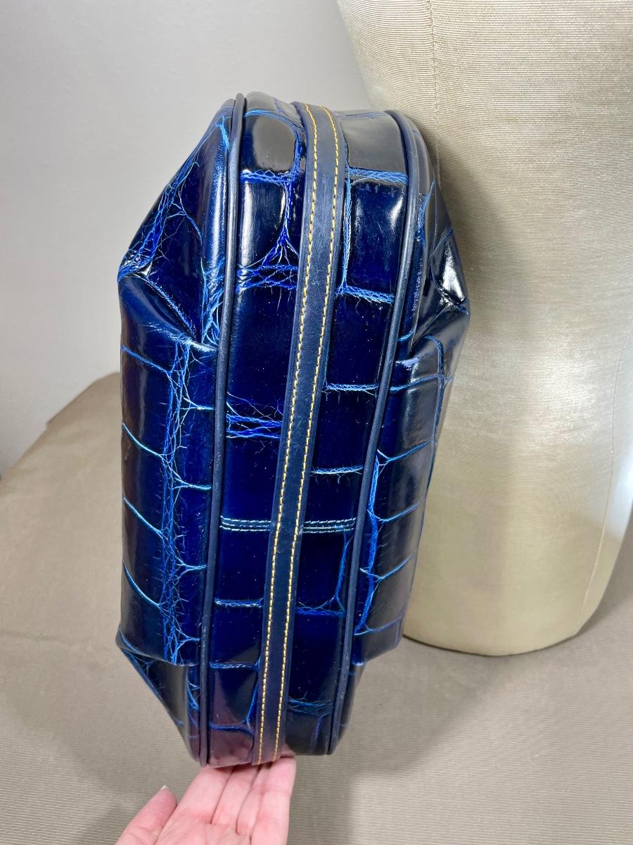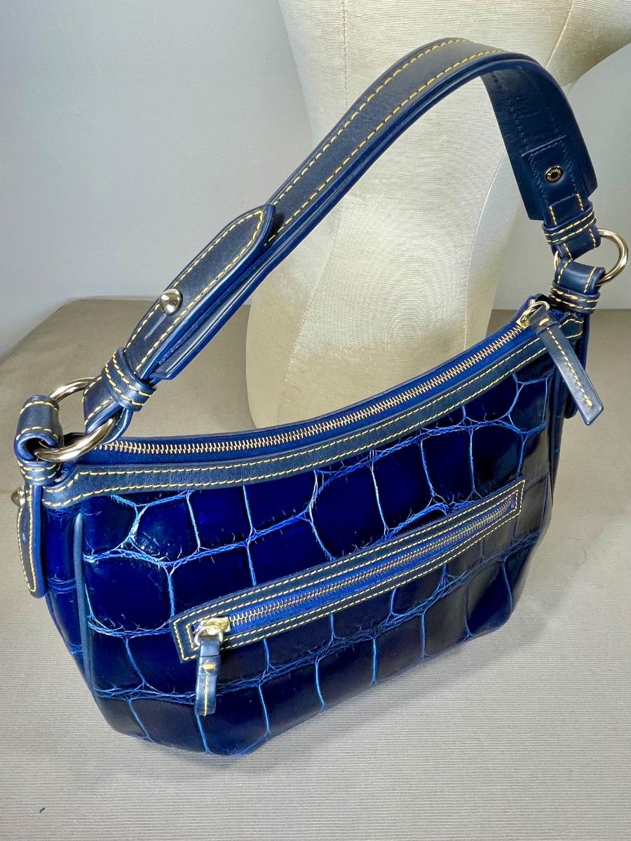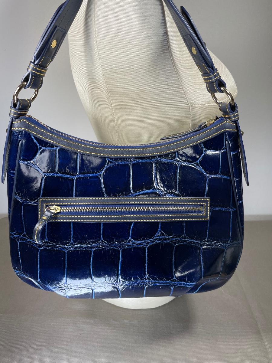 In blue croc embossed leather. Gorgeous bag includes dust cover. Retail $300+