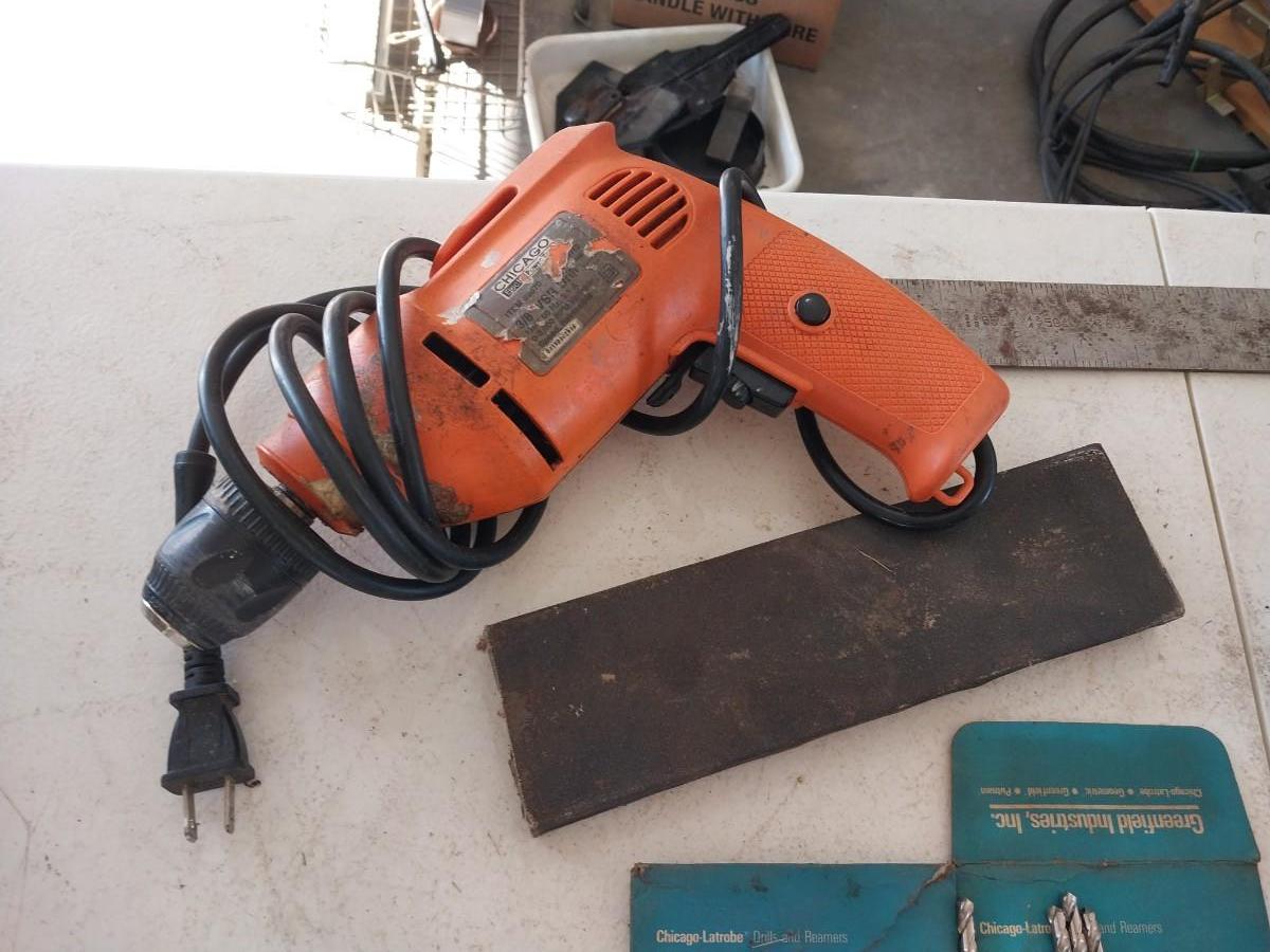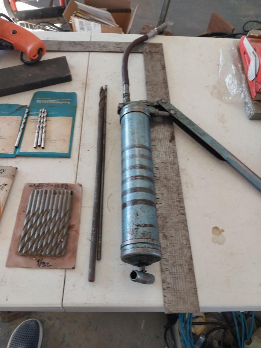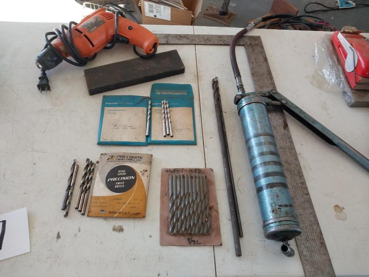 NEW DRILL BITS, CORDED DRILL, PALM SANDER & GREASE GUN