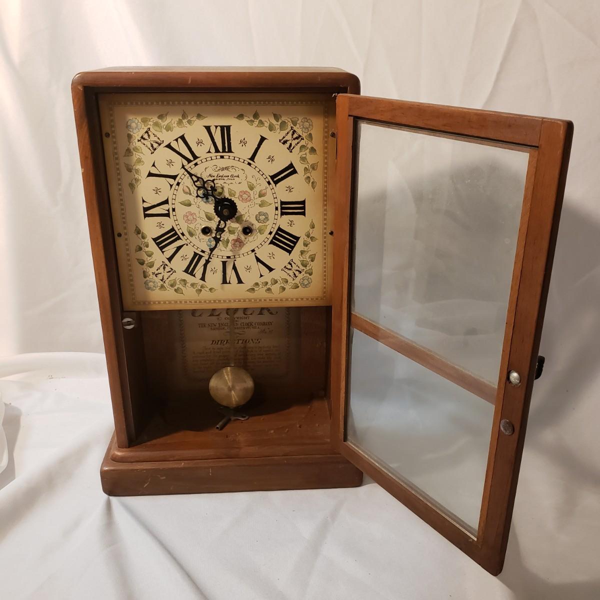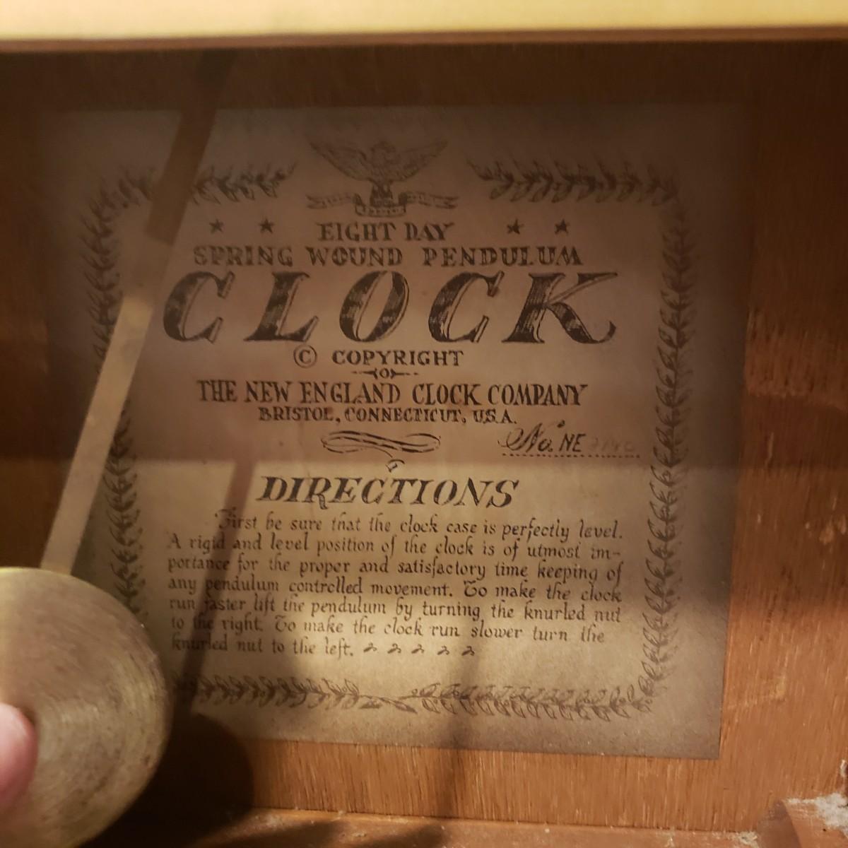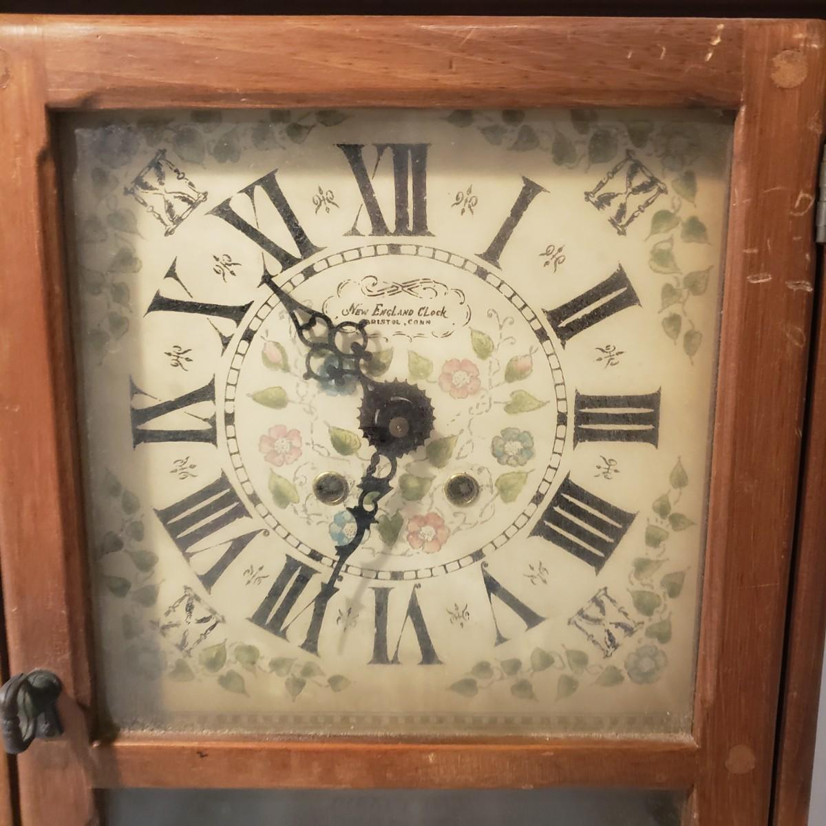 This clock was made by the New England Clock company from Bristol, Conn. The paper face has some browning around the edges and worn spots on the wood, as seen in pictures. The clock measures 5"X11.5"X18". There is no Key with this clock.