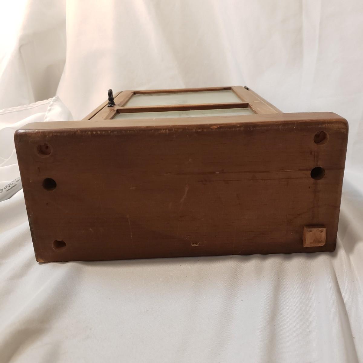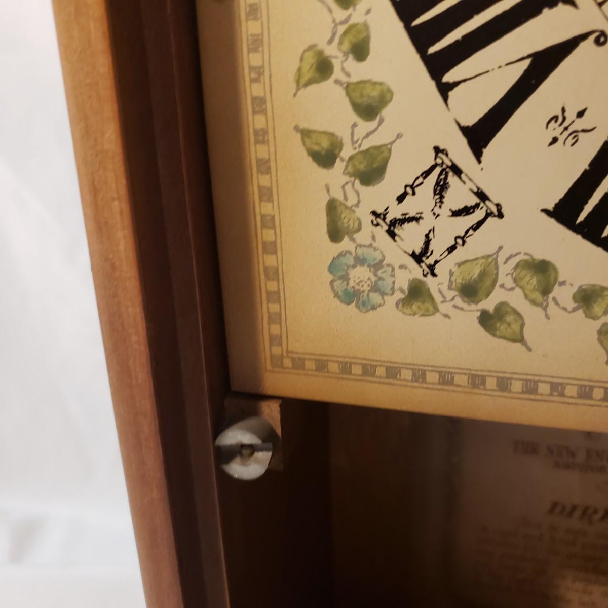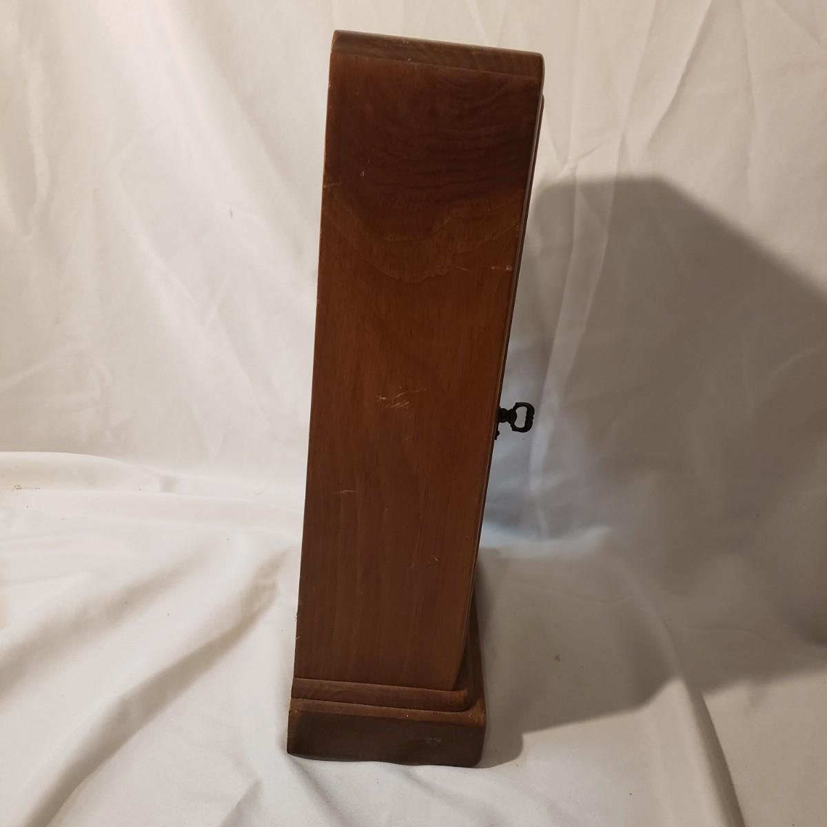 This clock was made by the New England Clock company from Bristol, Conn. The paper face has some browning around the edges and worn spots on the wood, as seen in pictures. The clock measures 5"X11.5"X18". There is no Key with this clock.