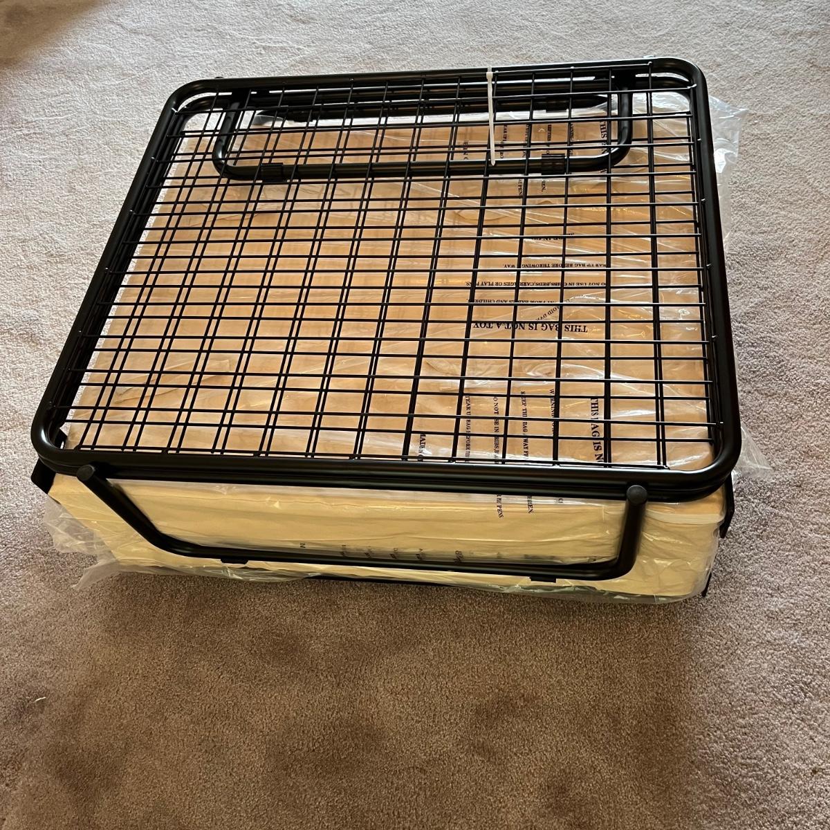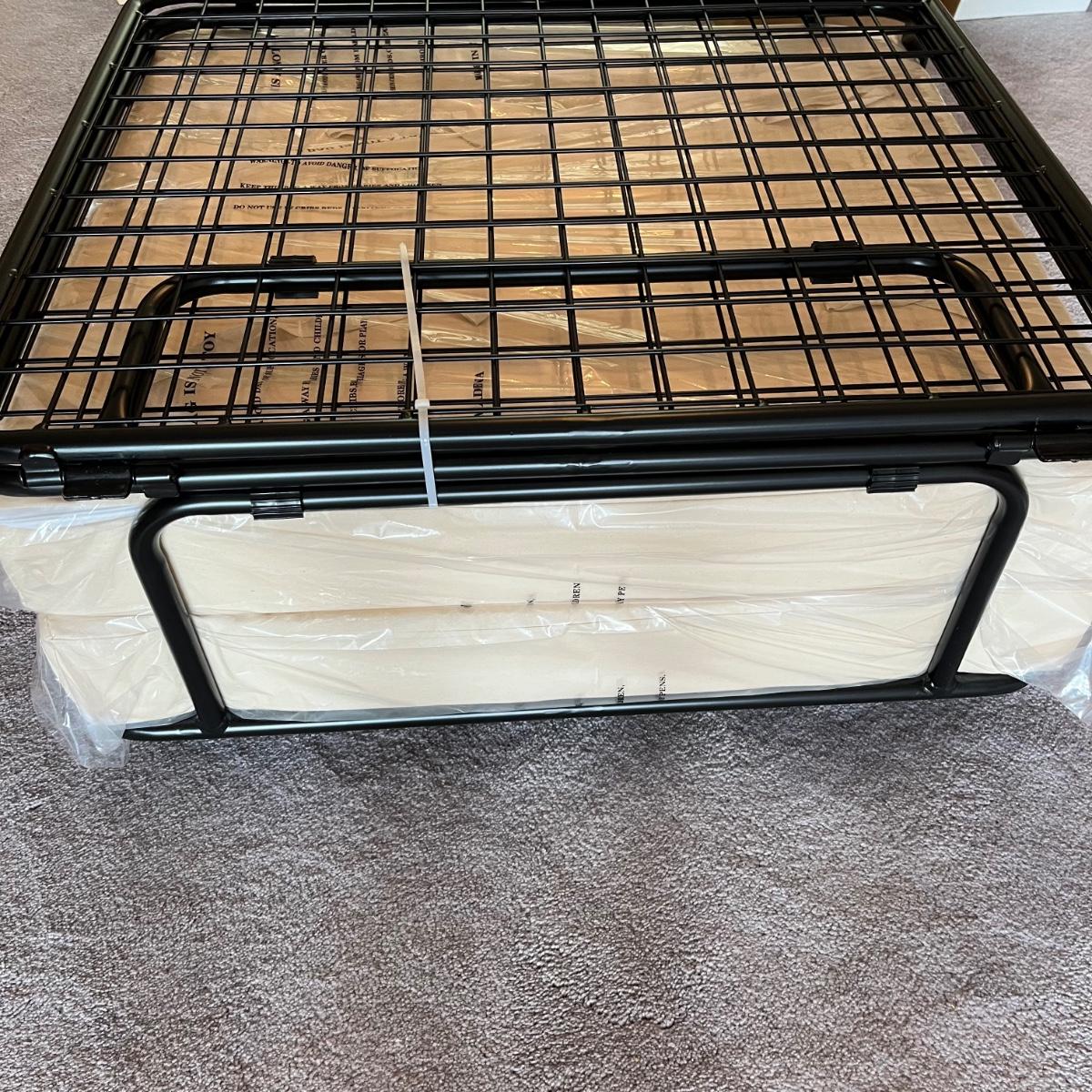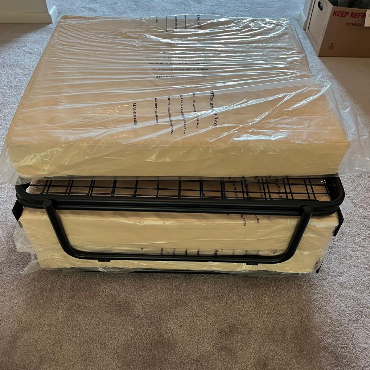 This lot includes one folding twin size bed and an ottoman cover. The bed is unused and the cushions are in original packaging. The bed is on wheels and currently zip tied from original packaging. The folded bed measures about 27” x 29” x 14”H. Local pick up only.