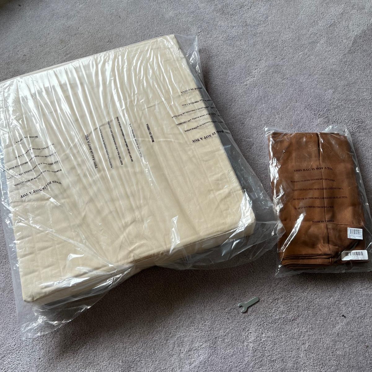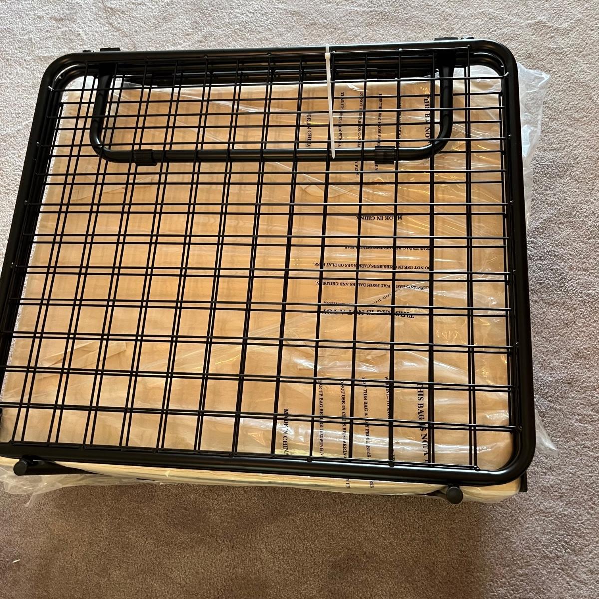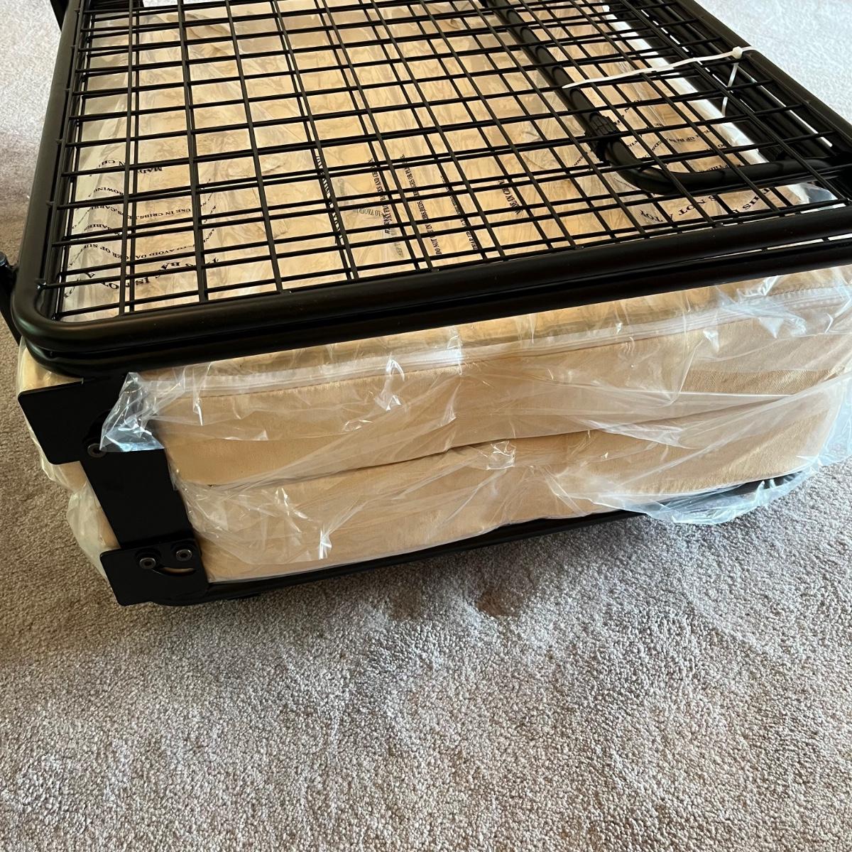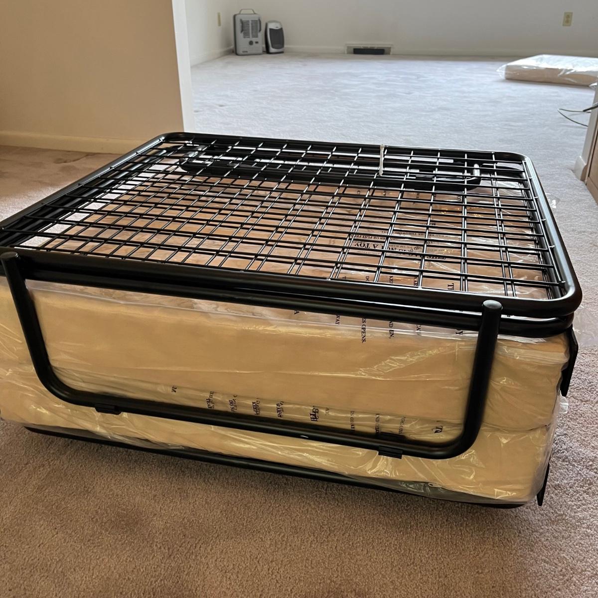 This lot includes one folding twin size bed and an ottoman cover. The bed is unused and the cushions are in original packaging. The bed is on wheels and currently zip tied from original packaging. The folded bed measures about 27” x 29” x 14”H. Local pick up only.