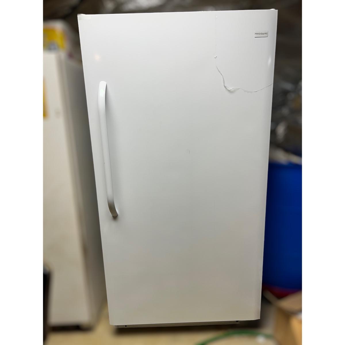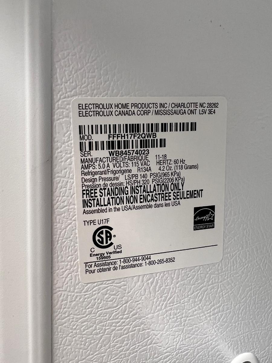 Model: FFFH17F2QWB. Still has plastic on the front door. Some torn away as shown in pics. In basement with door. Able to remove through backyard. NOTE: PICK UP ONLY IN DUNKIRK MD.
