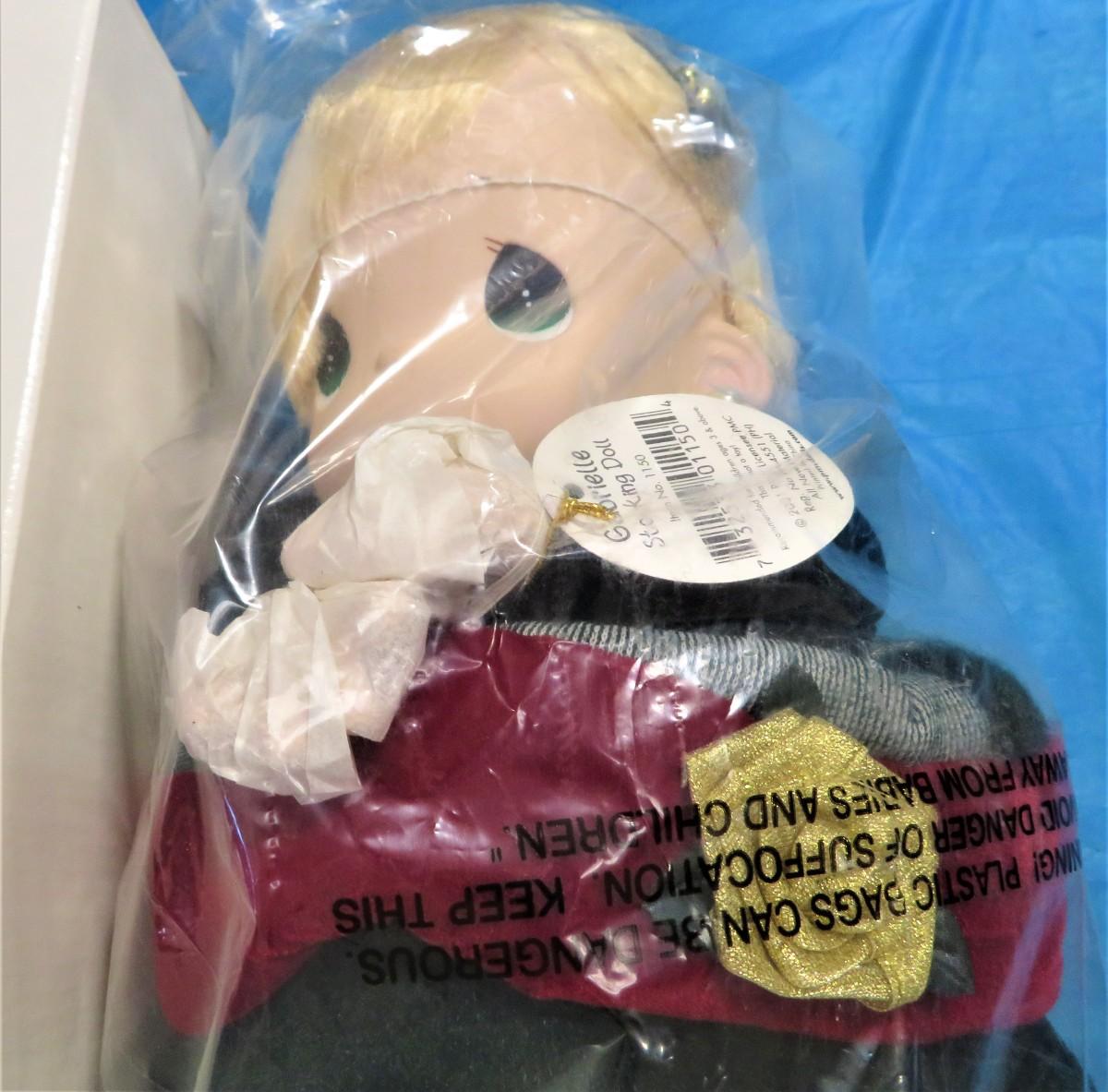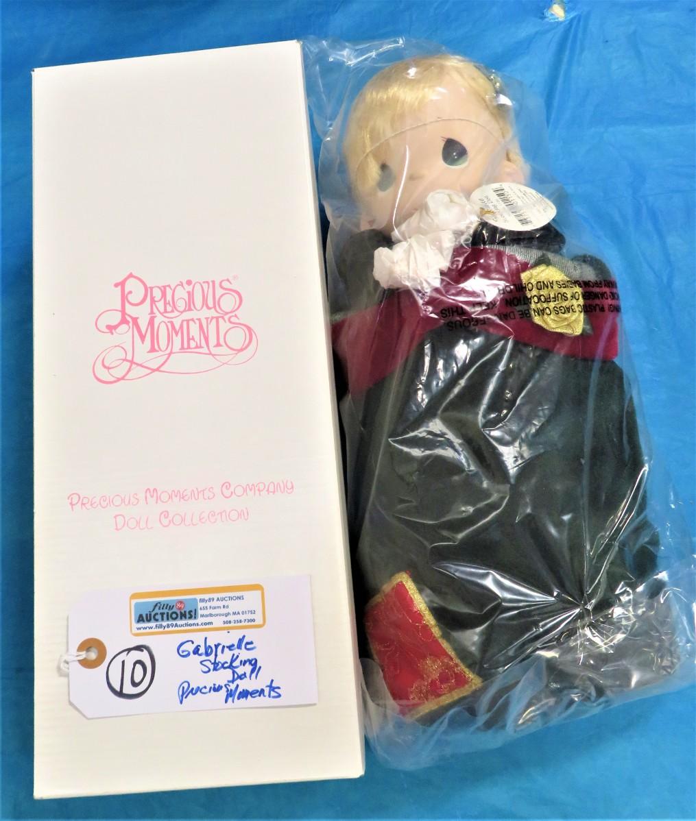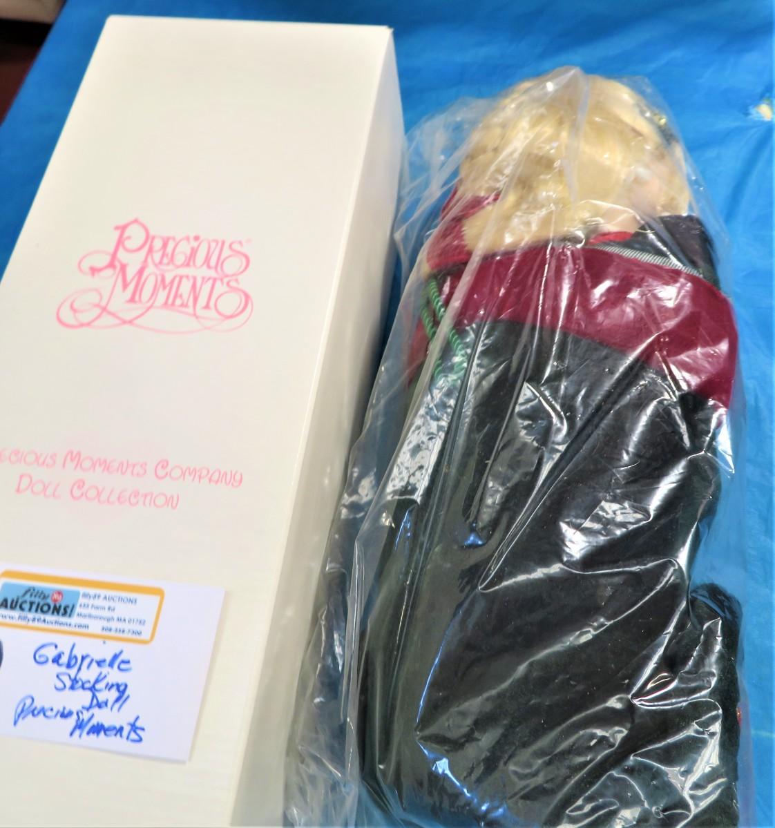 Vintage Precious Moments " Gabrielle " Stocking DOLL COLLECTION. 2001 with PM tag. # 1150. Blonde hair in a dark green velvet stocking with Red trim and Gold flower.