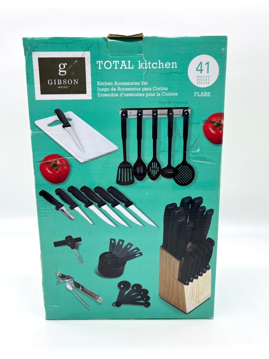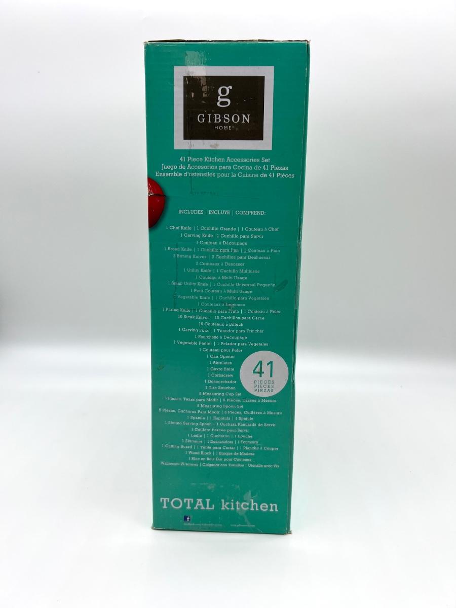 New GIBSON Total Kitchen 41 Piece Set. Never out of the box. Set includes one chef knife, one carving knife, one bread knife, two boning knives, one utility knife, one vegetable knife, one paring, knife, 10 steak knives, one carving fork, one vegetable peeler, one can opener, one corkscrew, five measuring cups, one spatula, one serving spoon, one cutting board one wood block.