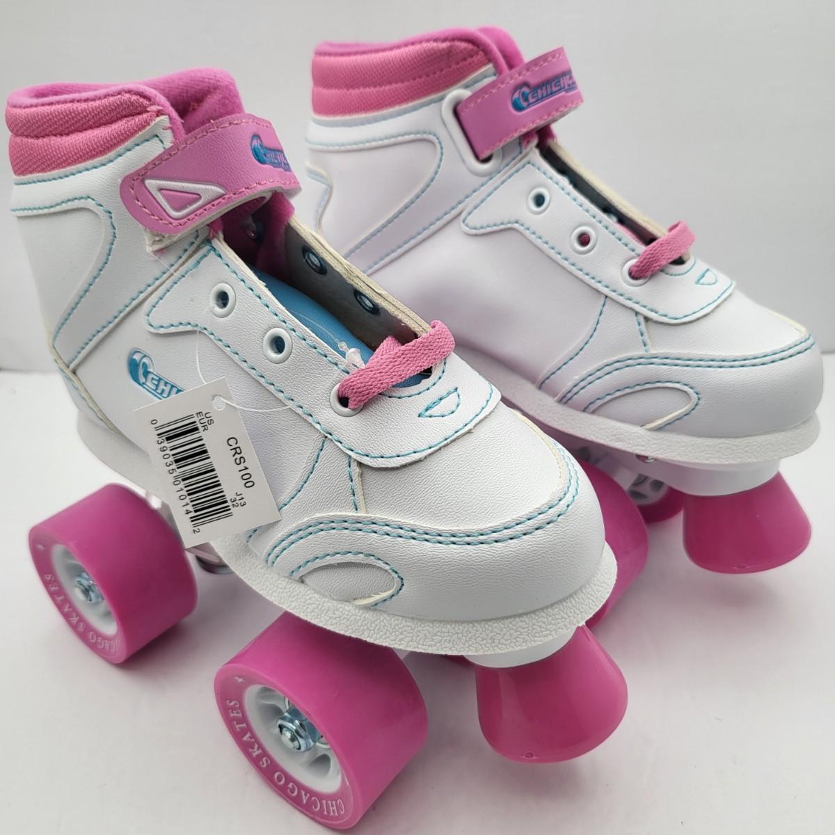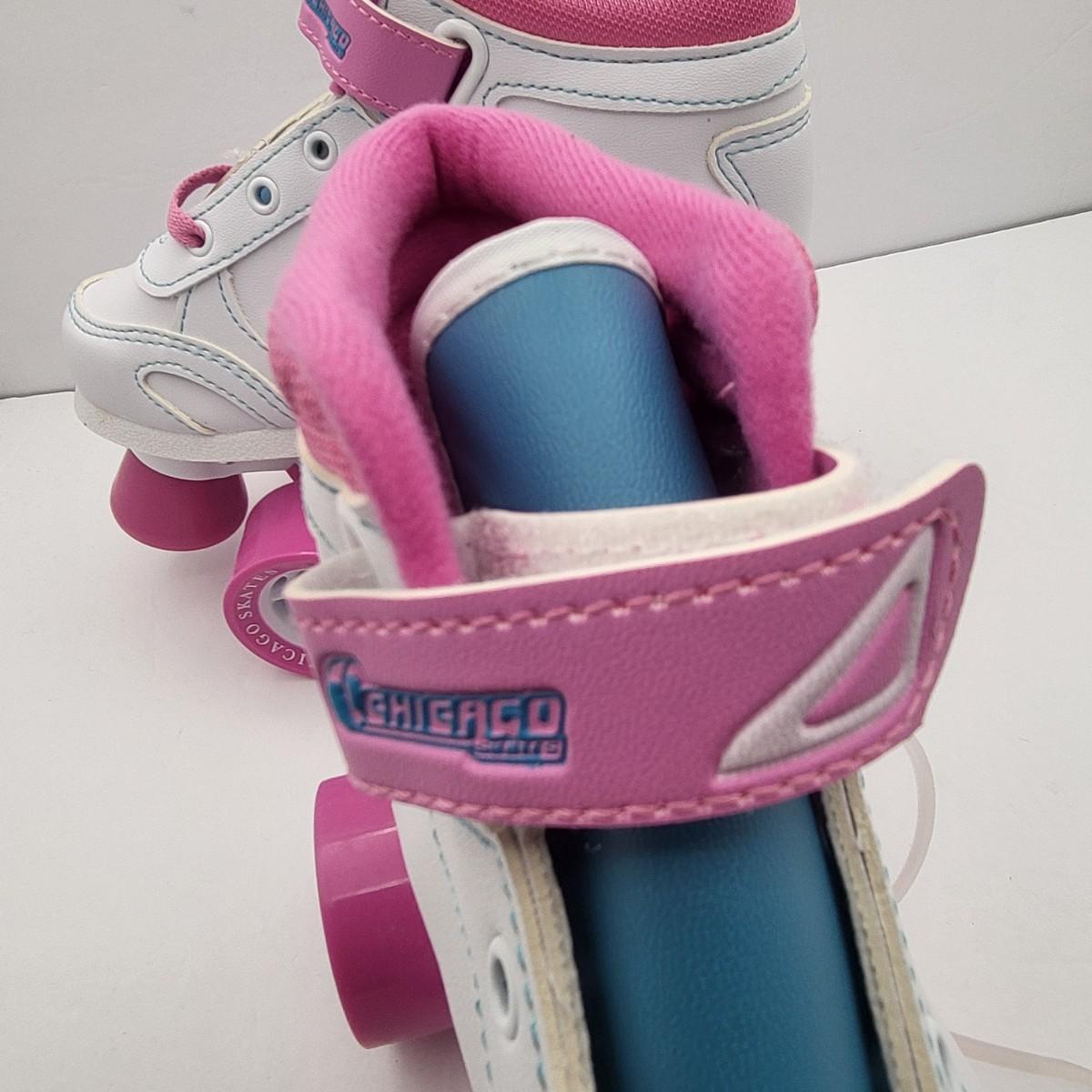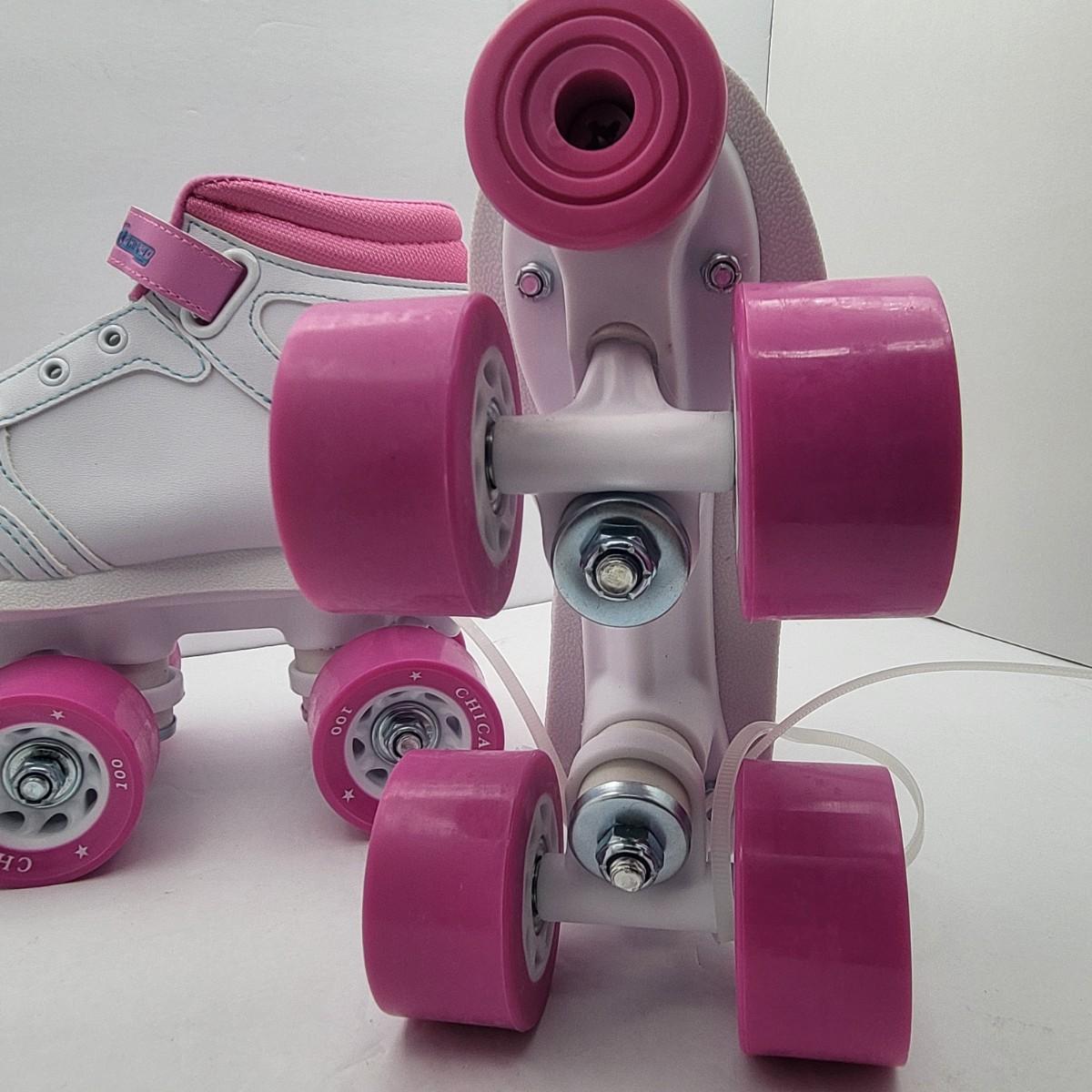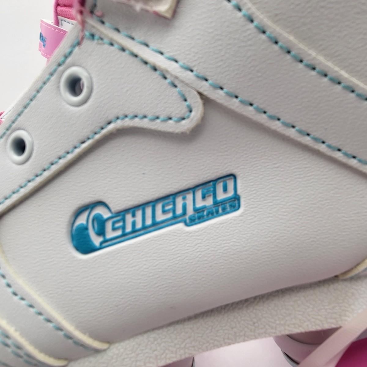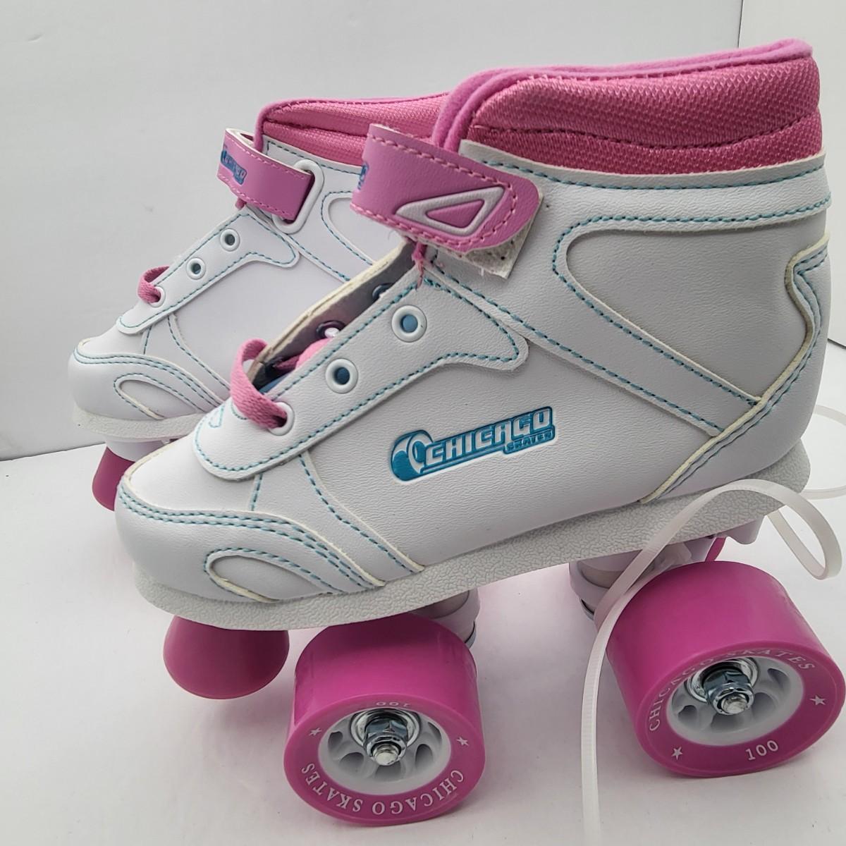 New girls sidewalk roller skates by Chicago Skates company. Pink rubber wheels & stopper. White & pink shoe with blue stitching. Girls size 13.