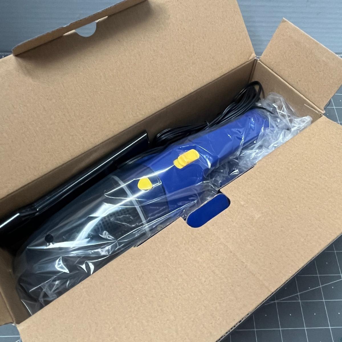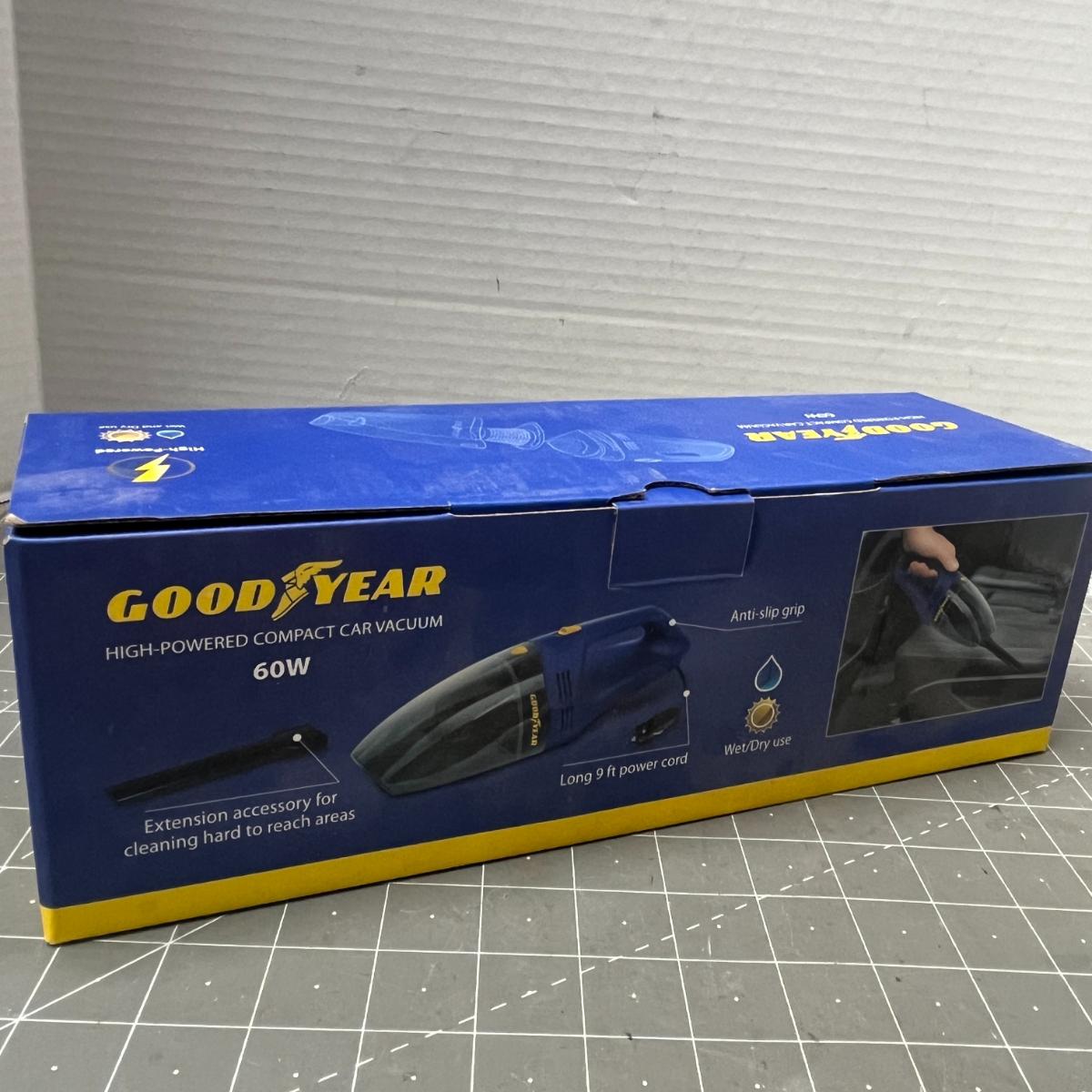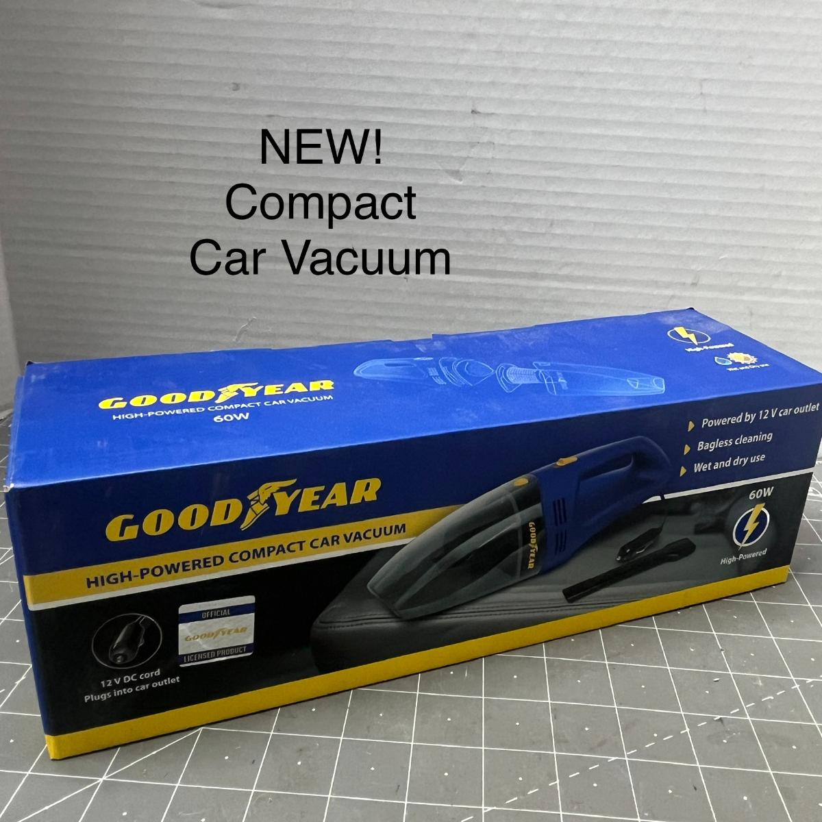 12V powered, 60W suction. Wet/dry use, bagless, hose included.