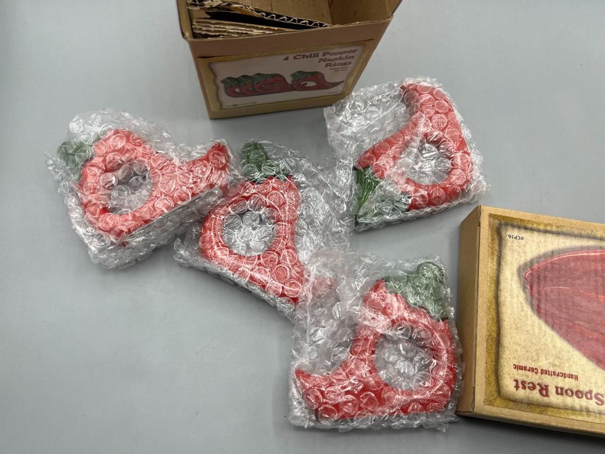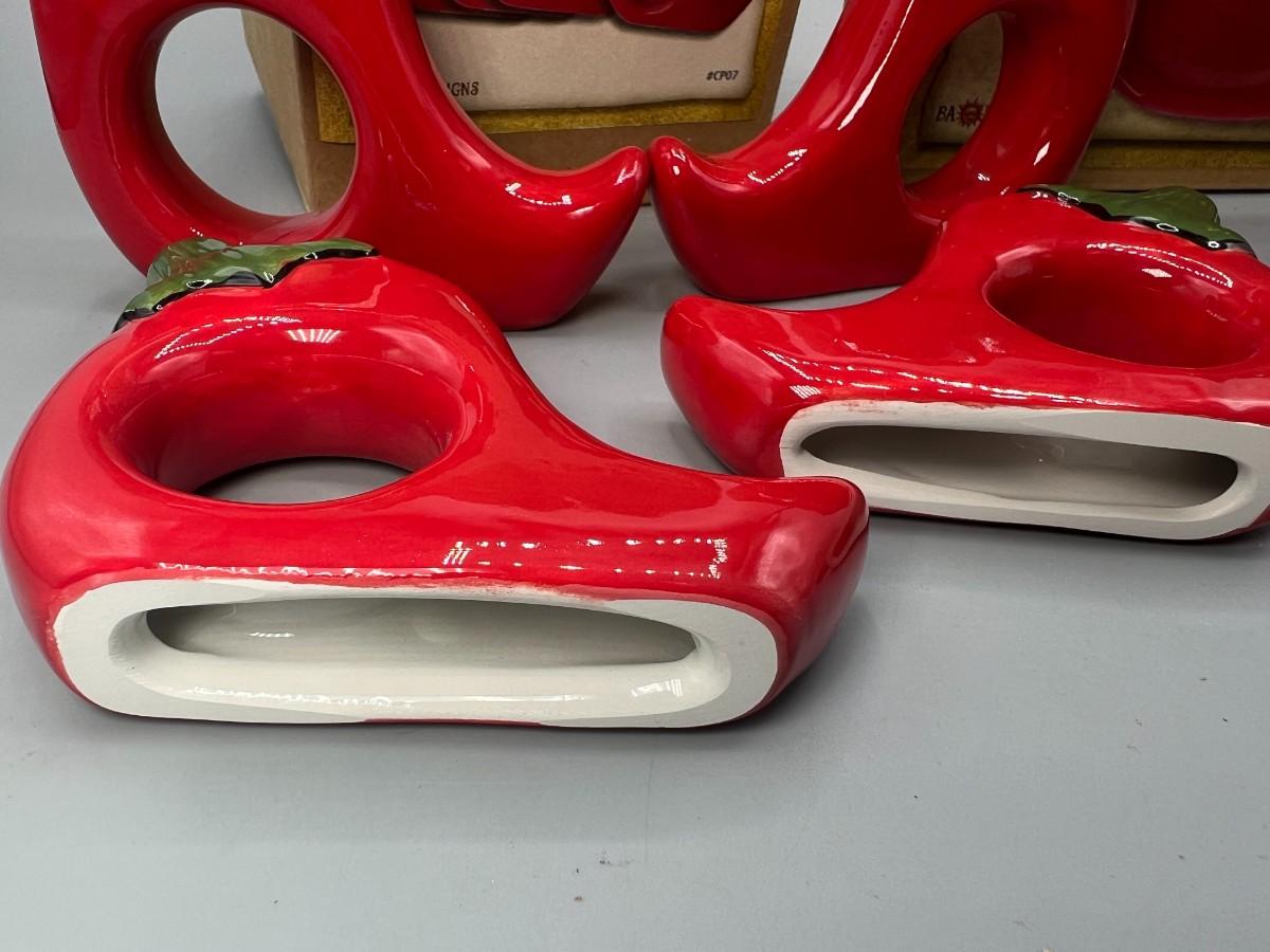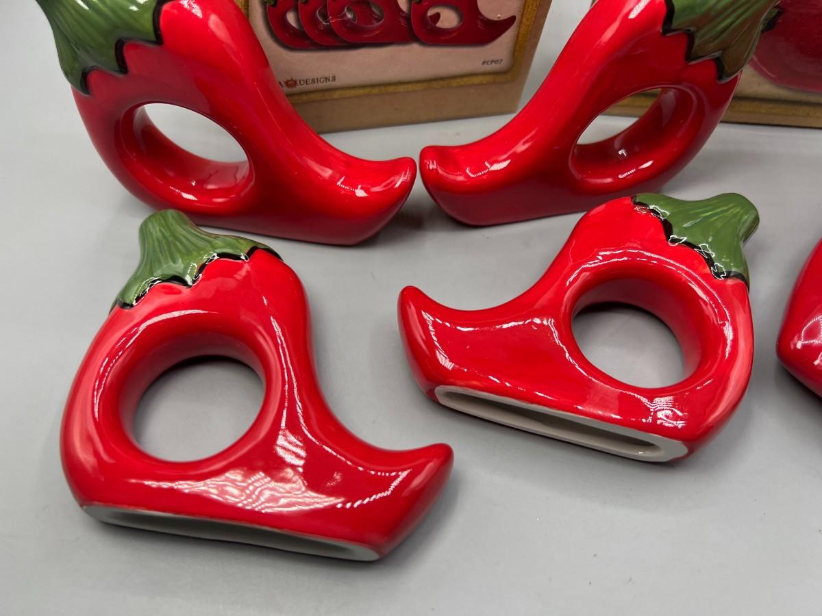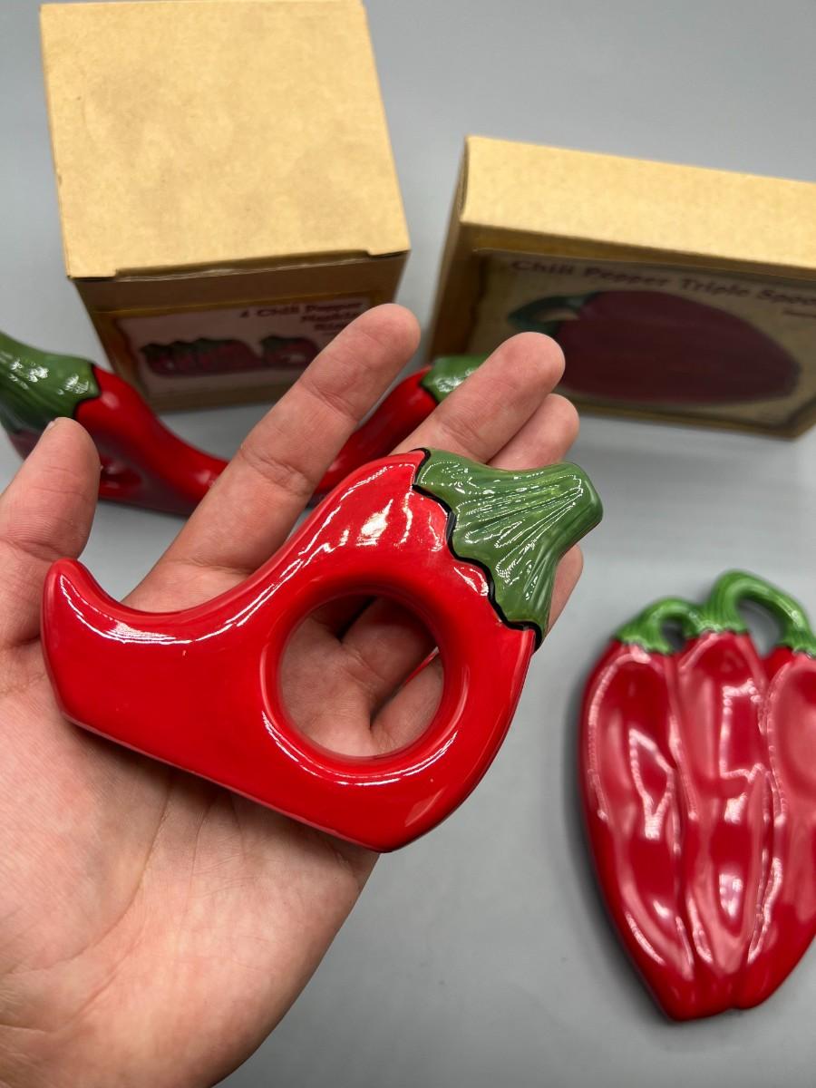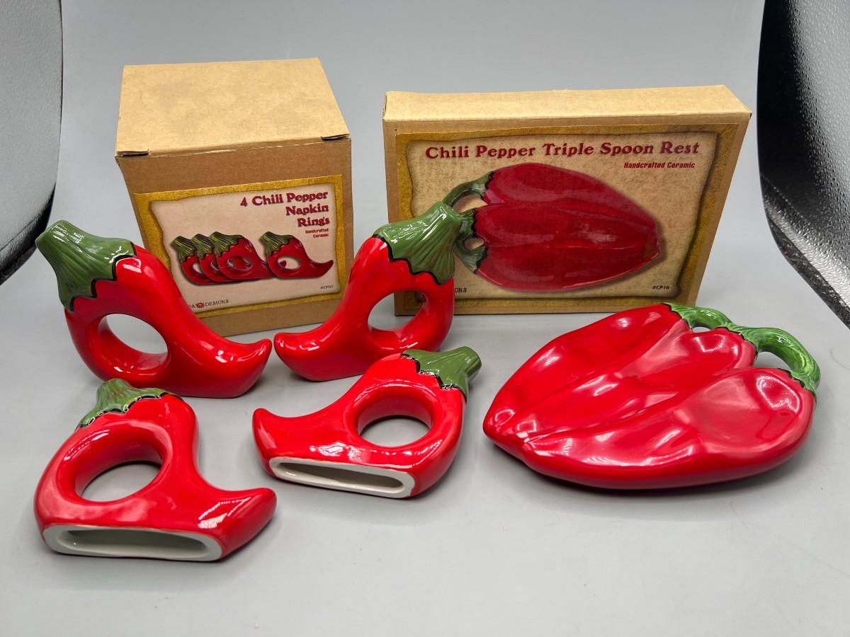 New Handcrafted Matching Ceramic Chili Pepper Triple Spoon Rest & Napkin Rings