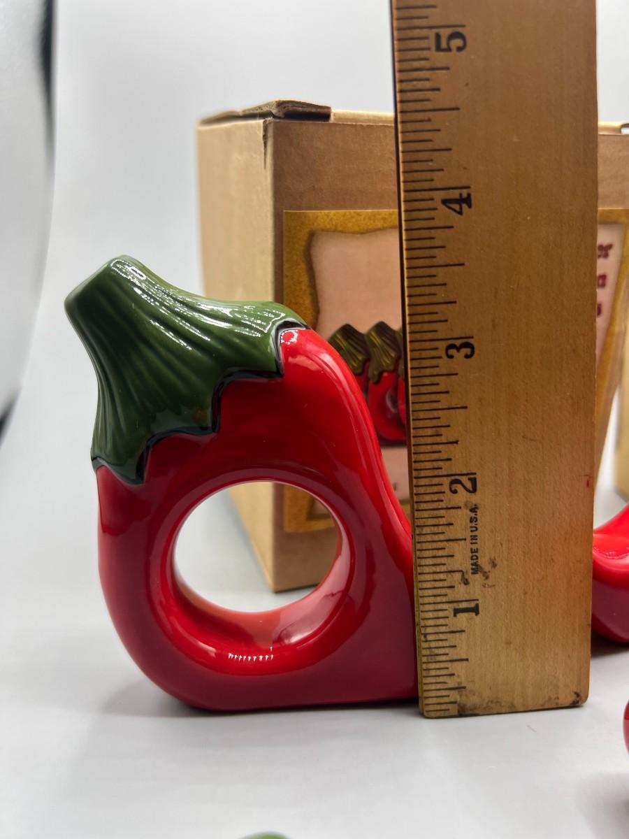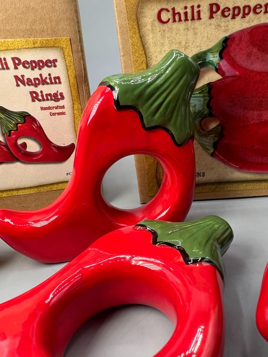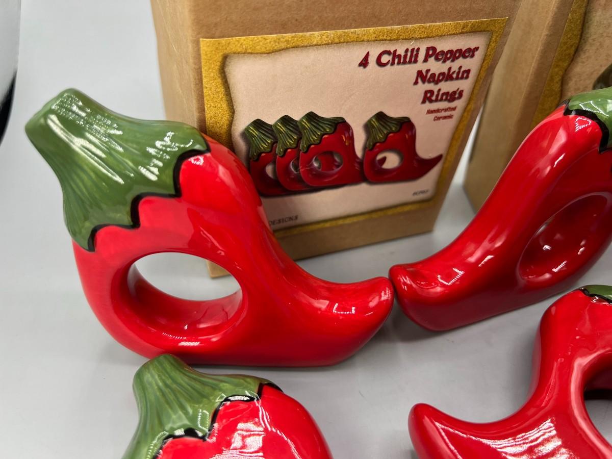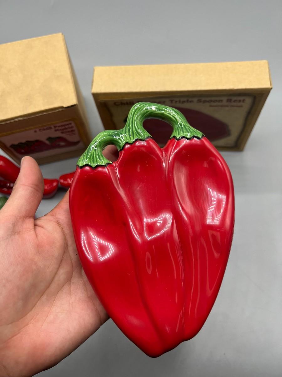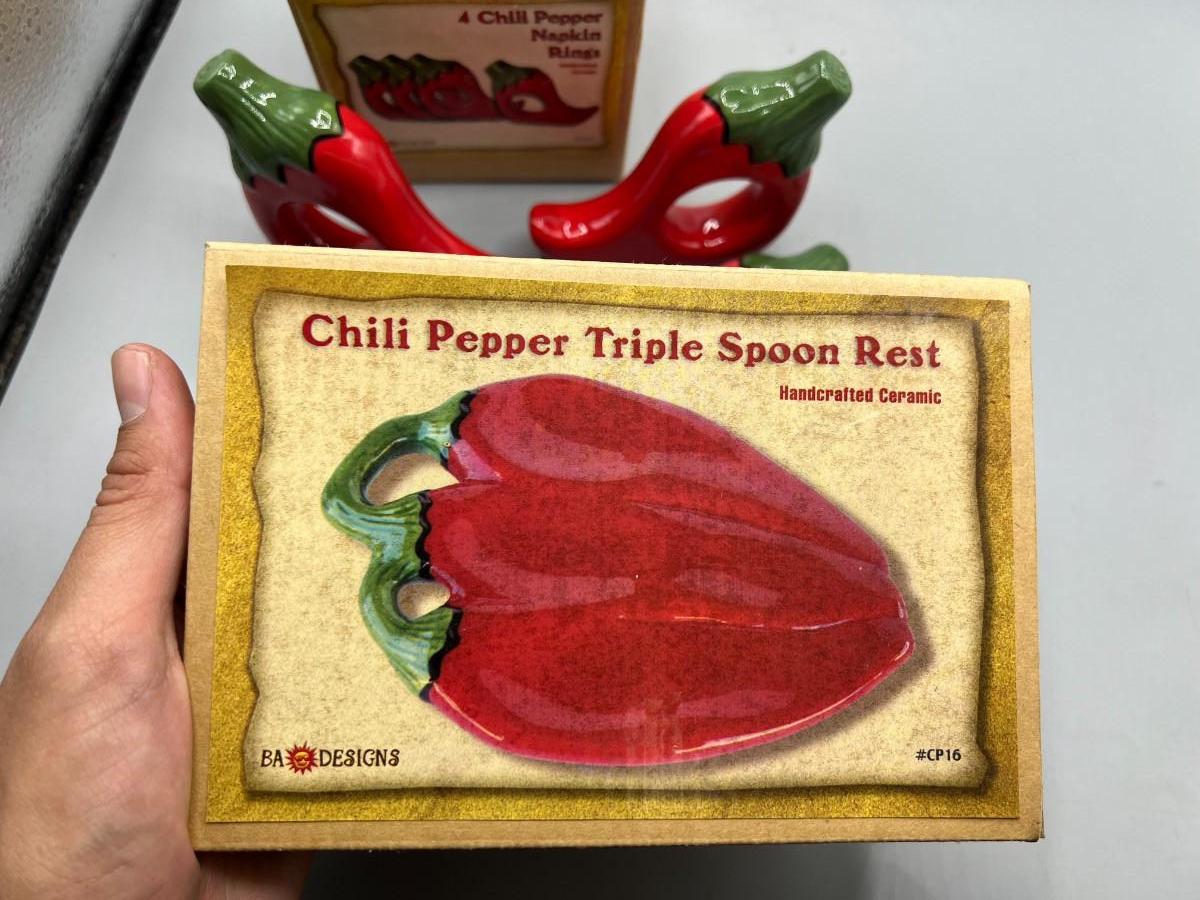 New Handcrafted Matching Ceramic Chili Pepper Triple Spoon Rest & Napkin Rings