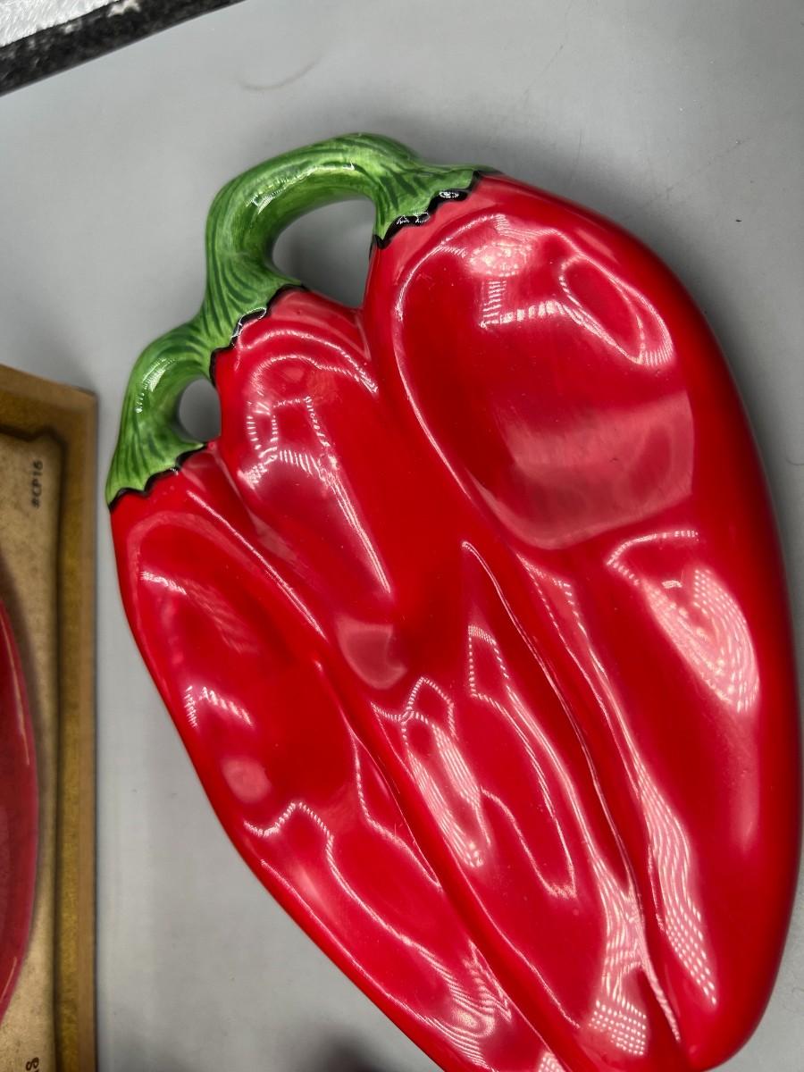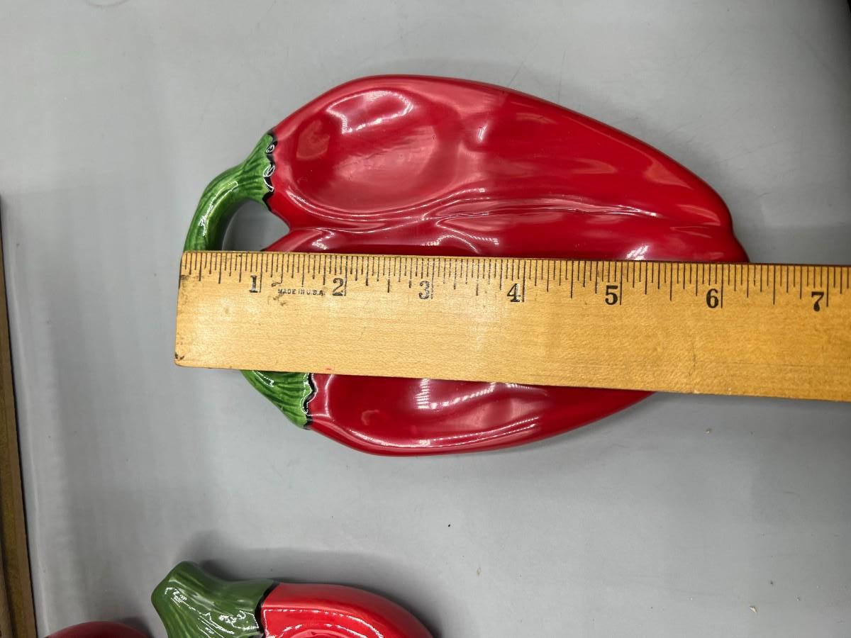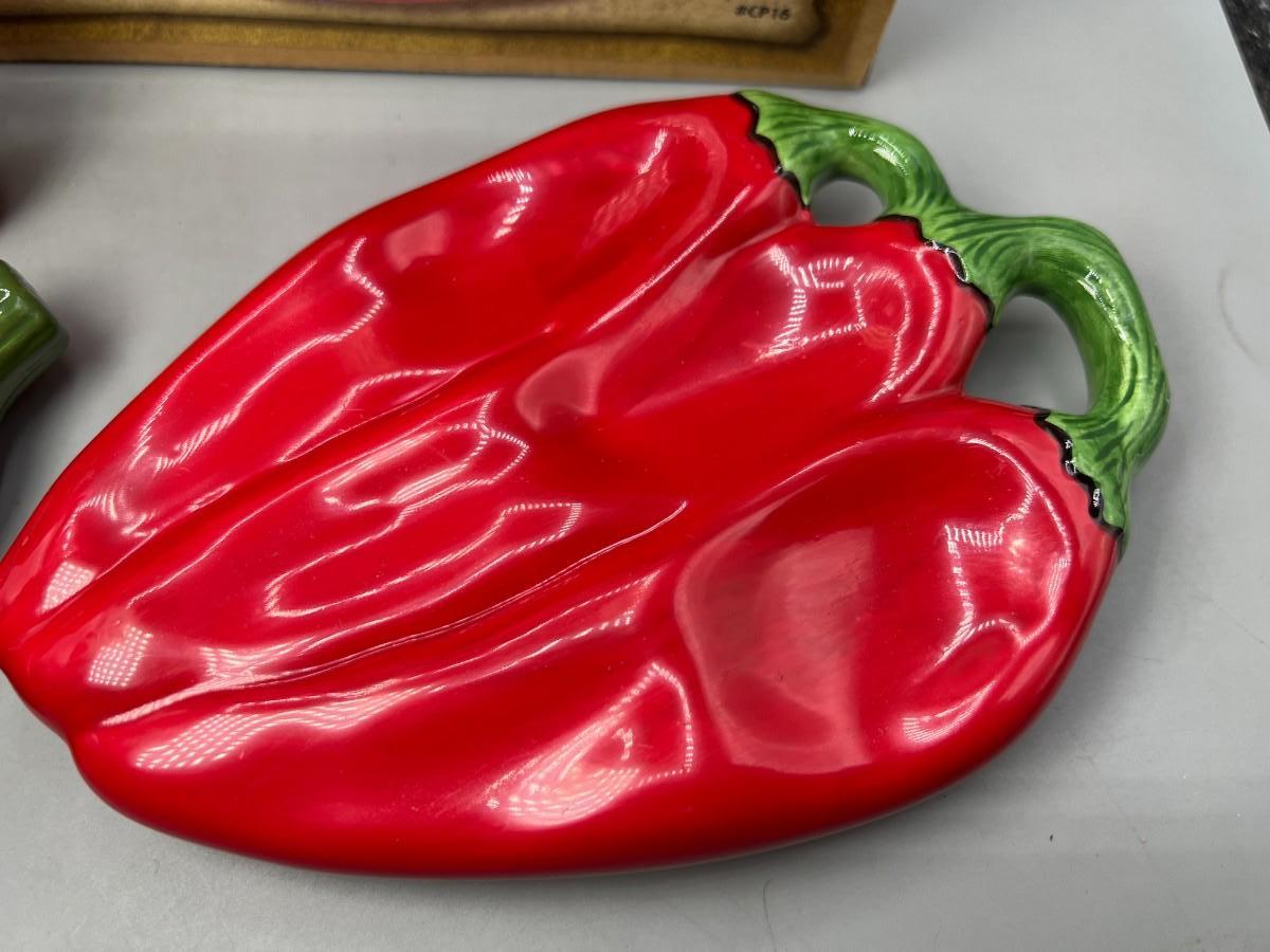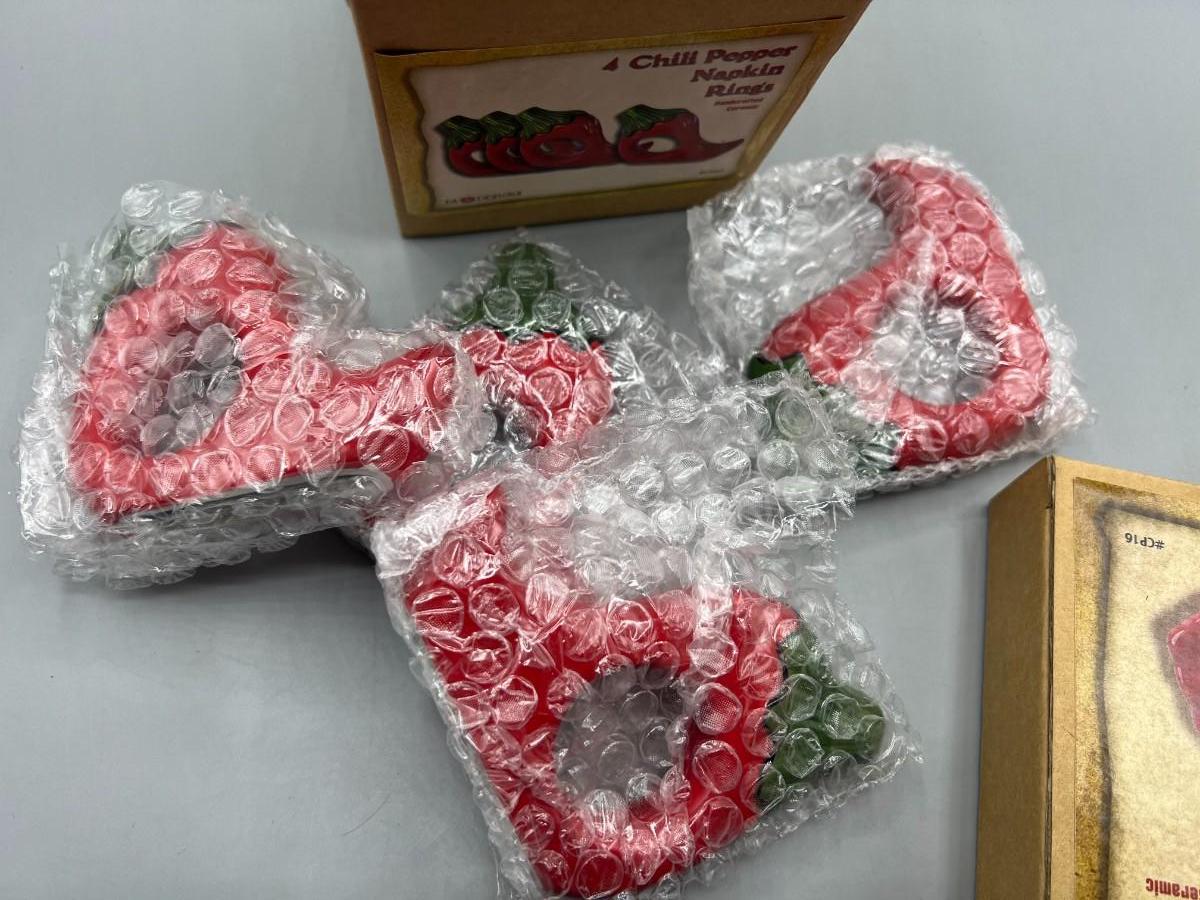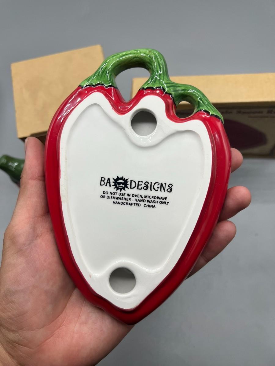 New Handcrafted Matching Ceramic Chili Pepper Triple Spoon Rest & Napkin Rings