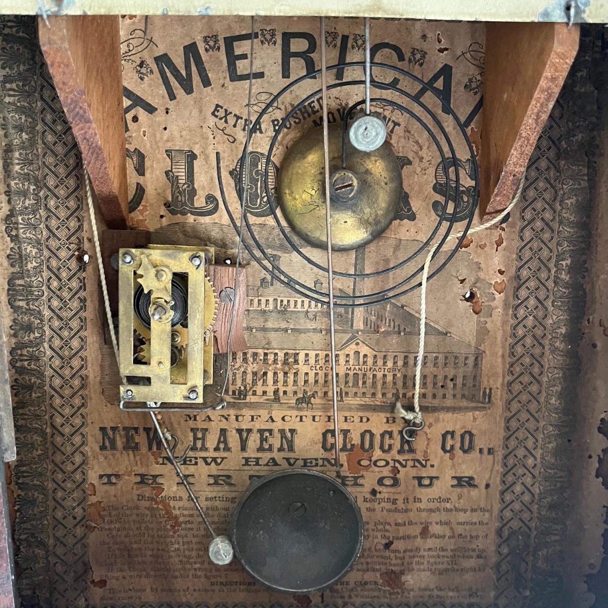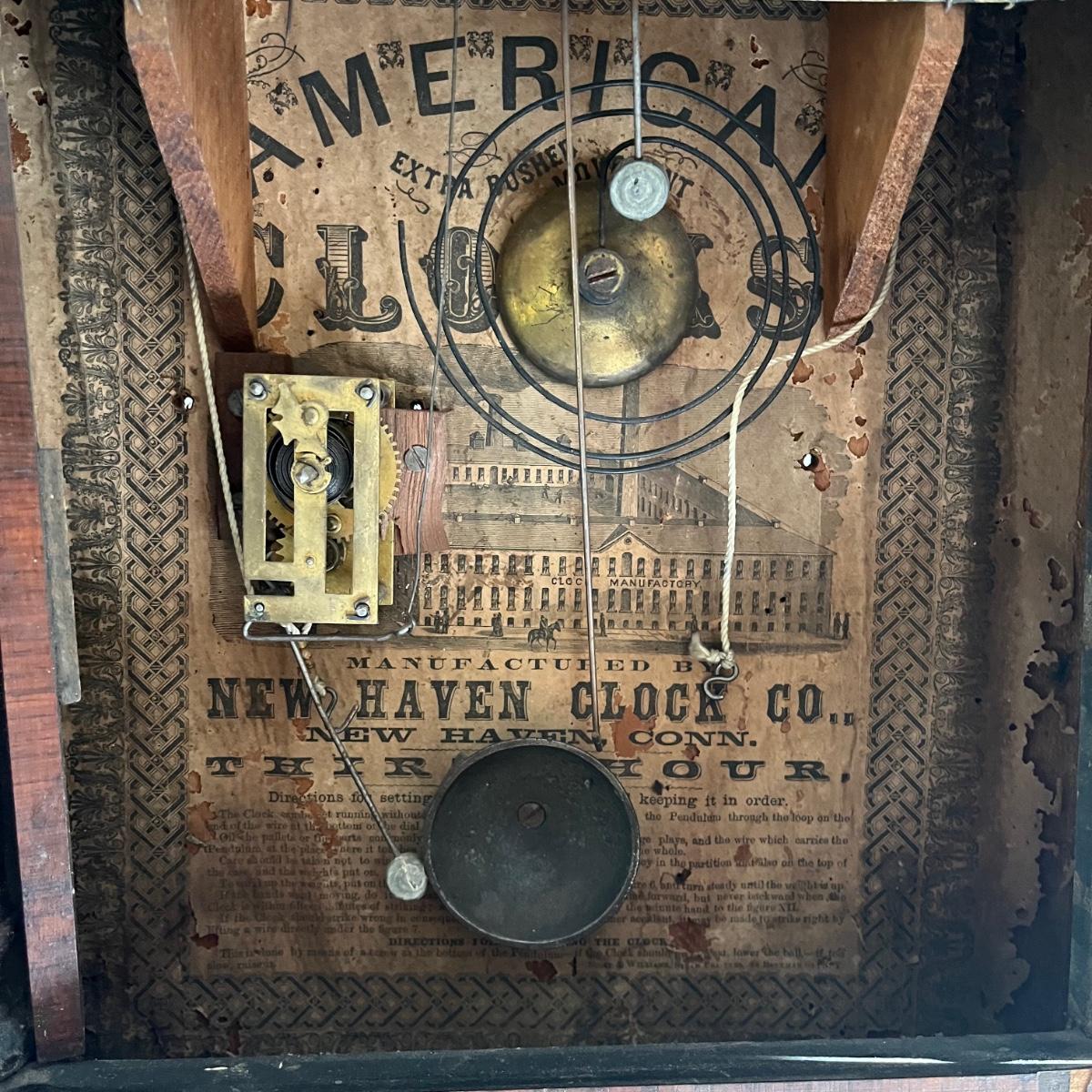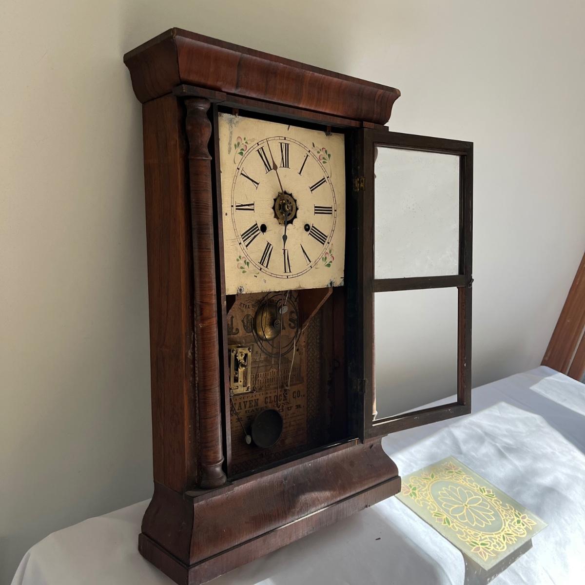This antique mantel clock was made by the New Haven Clock Company. Clock is not currently working and we cannot guarantee all the parts are there. The bottom glass section comes with the clock but is currently not attached, see pictures. Clock measures 4.5” x 15” x 24”.