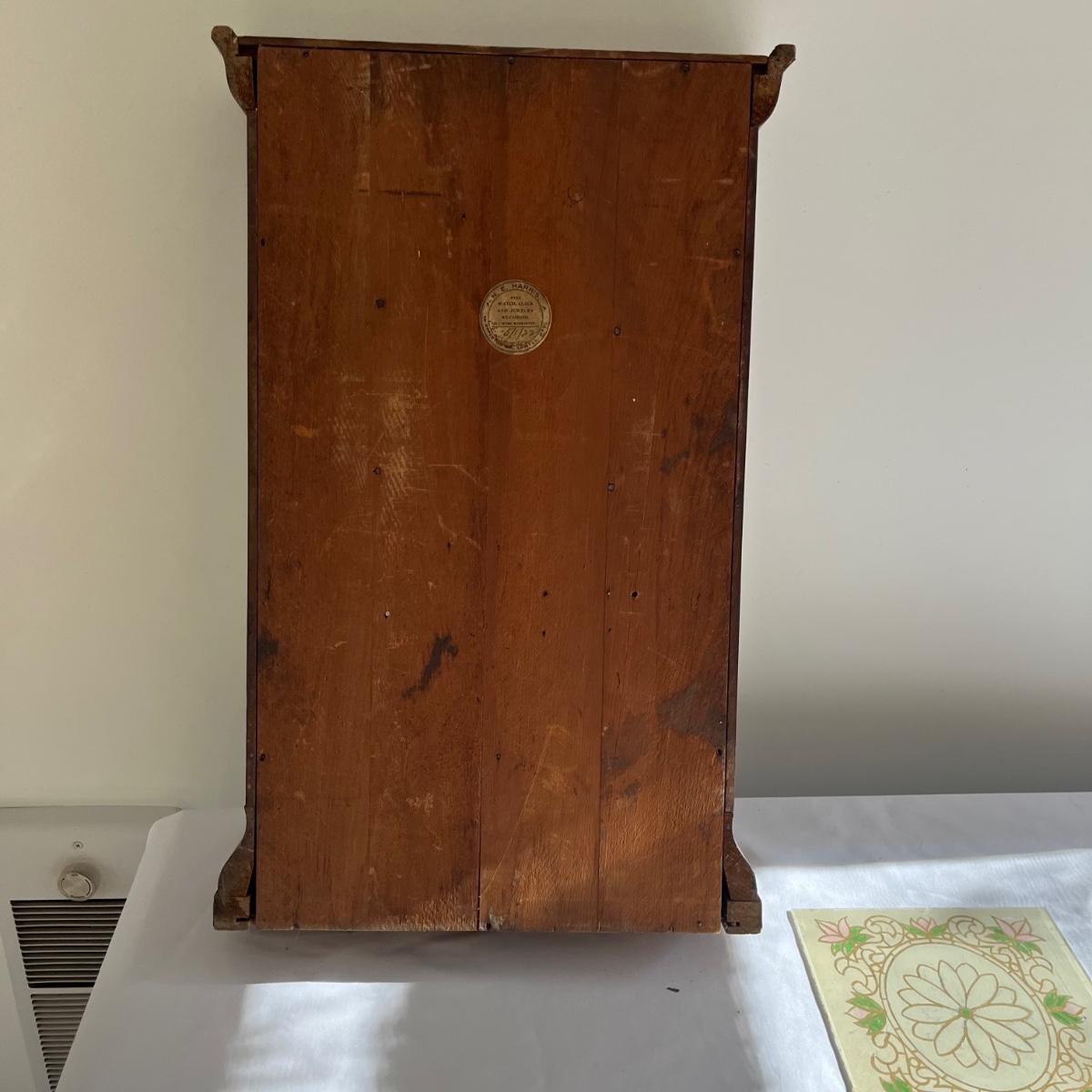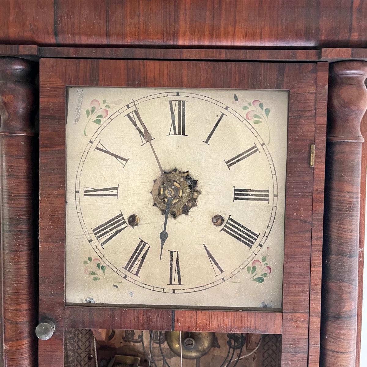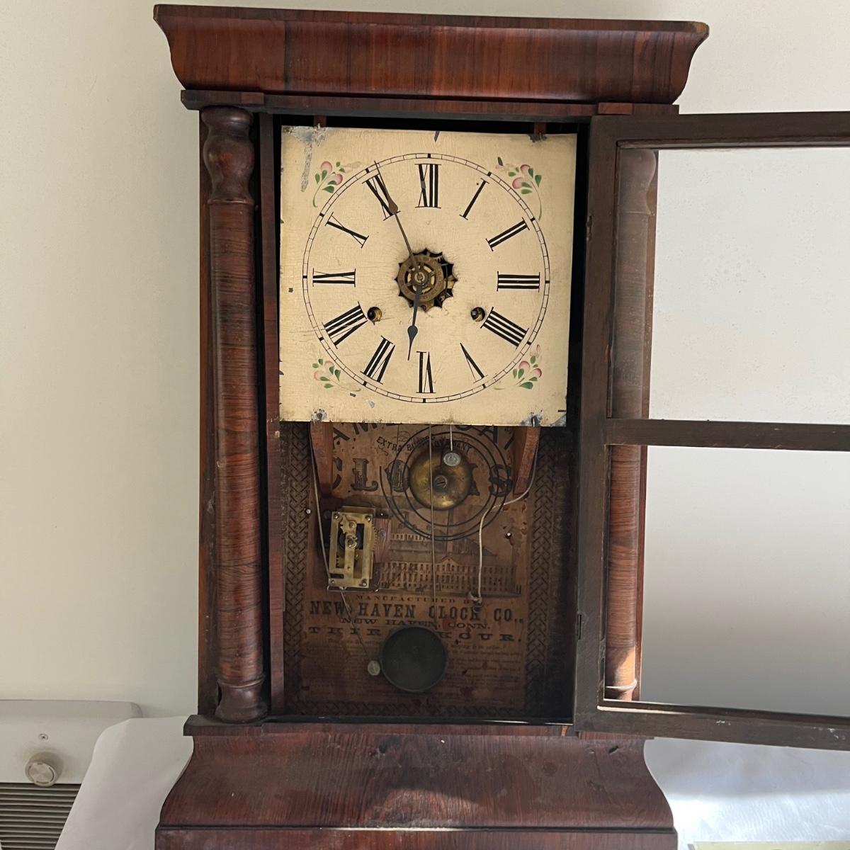 This antique mantel clock was made by the New Haven Clock Company. Clock is not currently working and we cannot guarantee all the parts are there. The bottom glass section comes with the clock but is currently not attached, see pictures. Clock measures 4.5” x 15” x 24”.