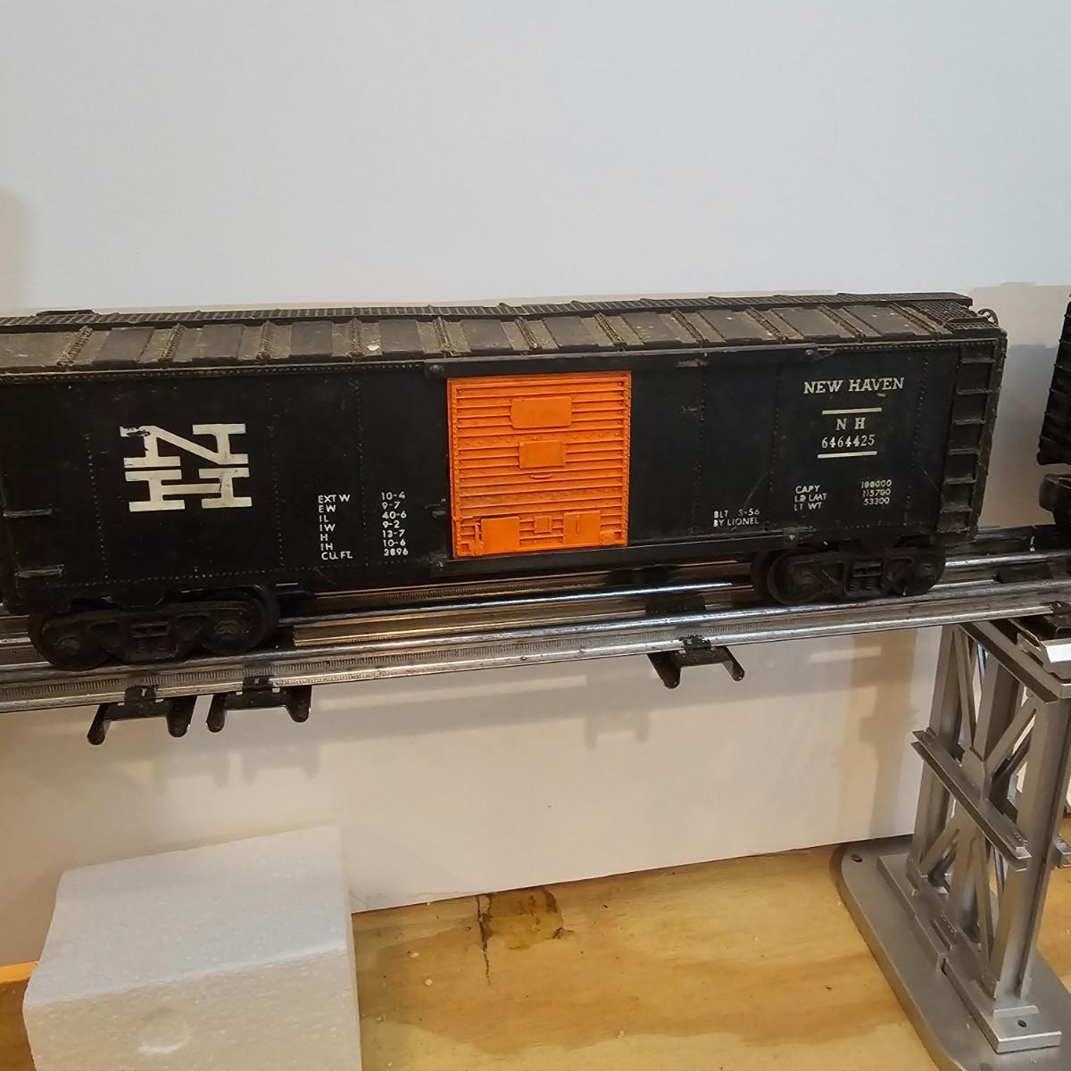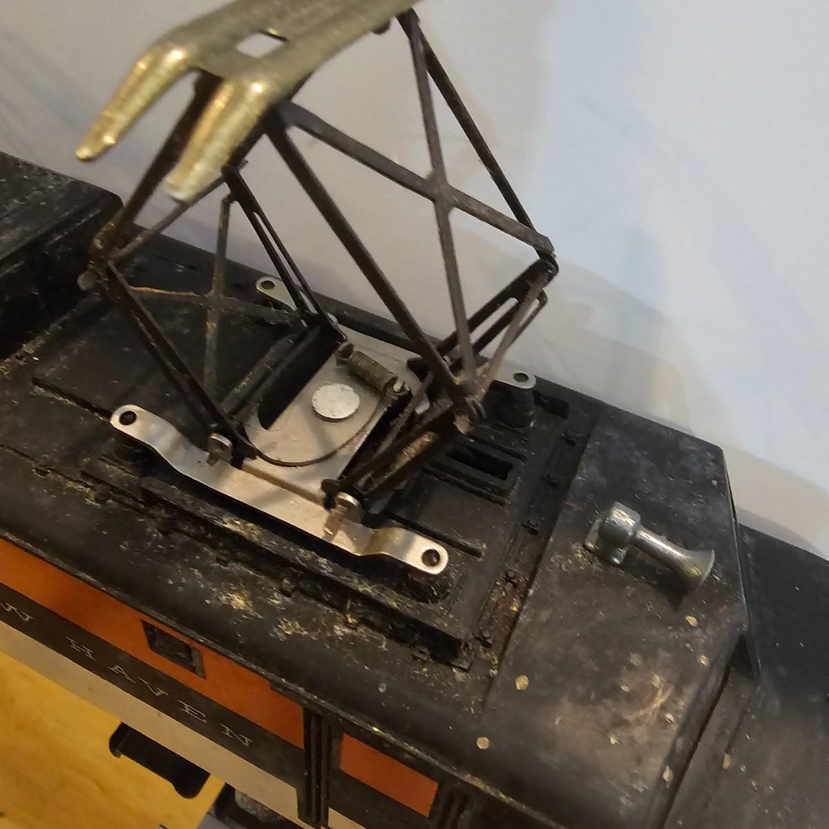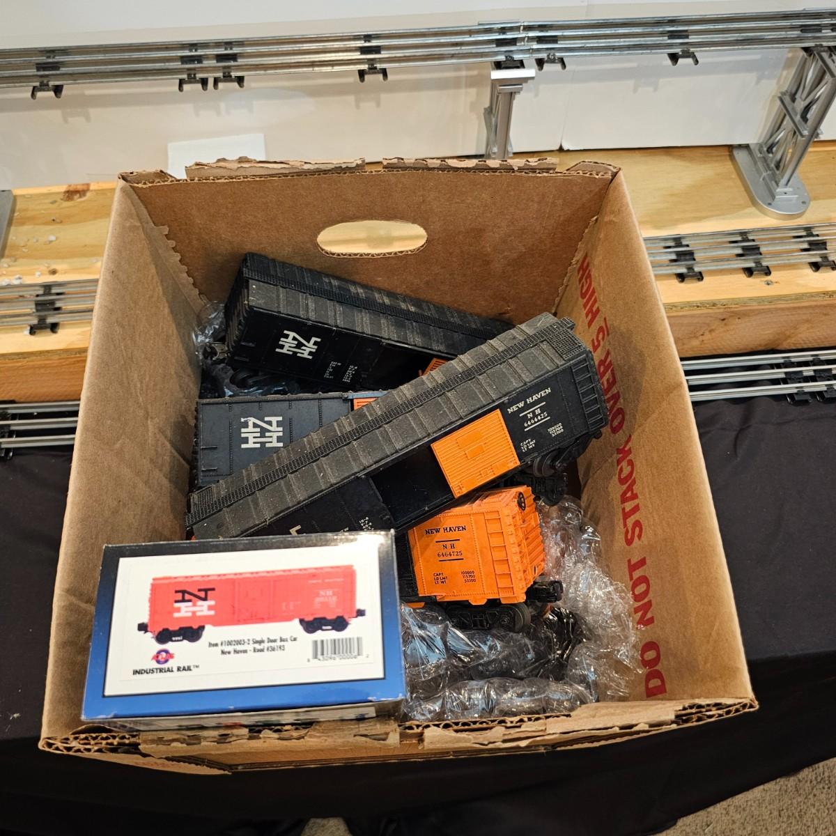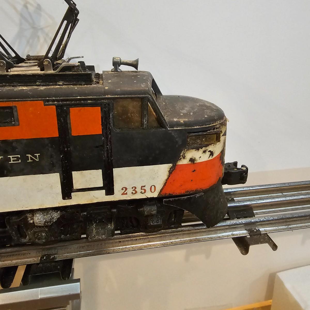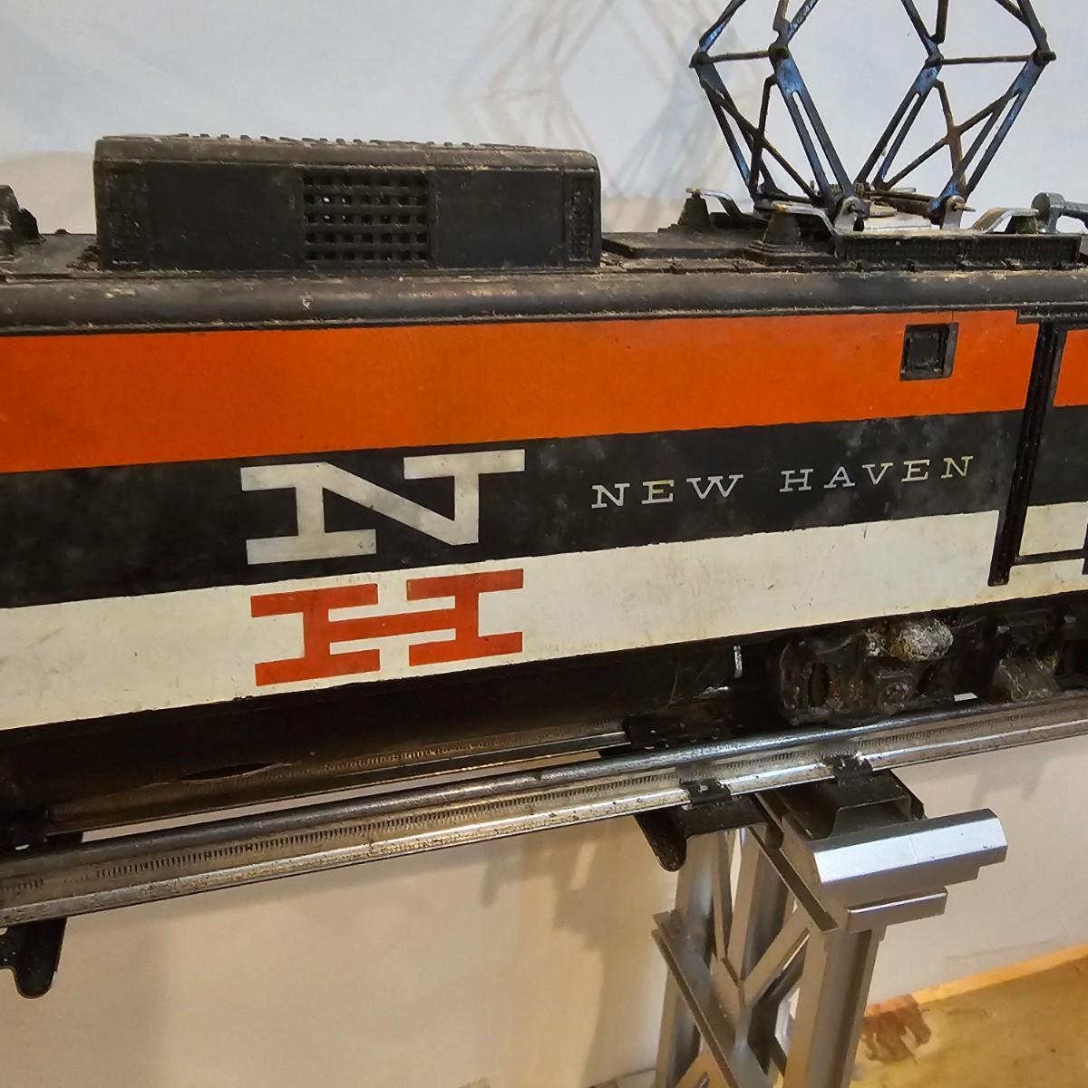 One rough shape EP5 electric engine in New Haven colors. Engine has rust and broken paint, missing some parts. Did not run. Also six New Haven box cars, one double door and five single door. The three black cars are all the same road number. Only one box for a boxcar. Approximately length of full train is 80". See photos for details. Please note that any price tag seen on an item was not put there by Sterling Transitions and does not reflect the current value of the item. Any train tracks shown in photos are not included but are available in another lot in this sale.
