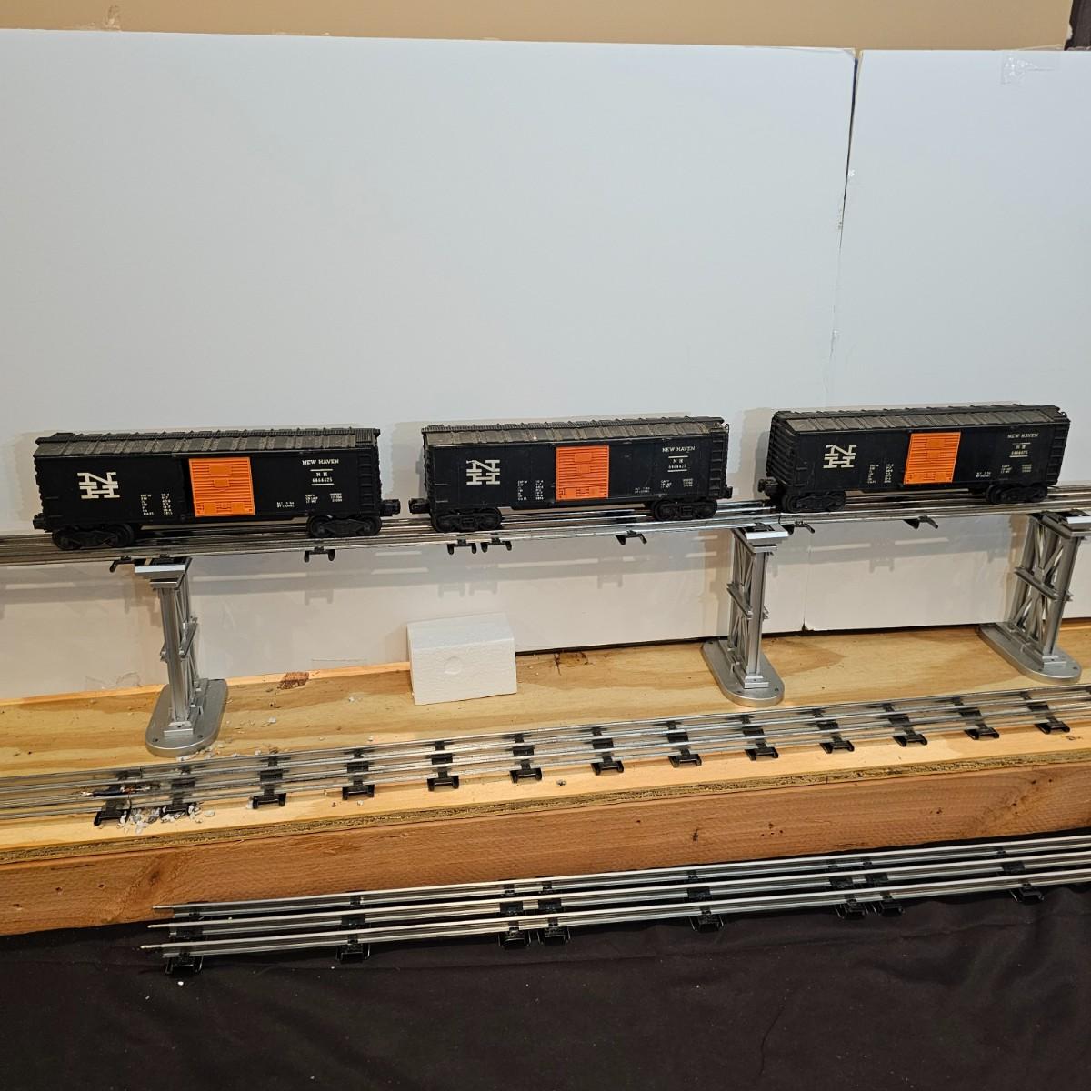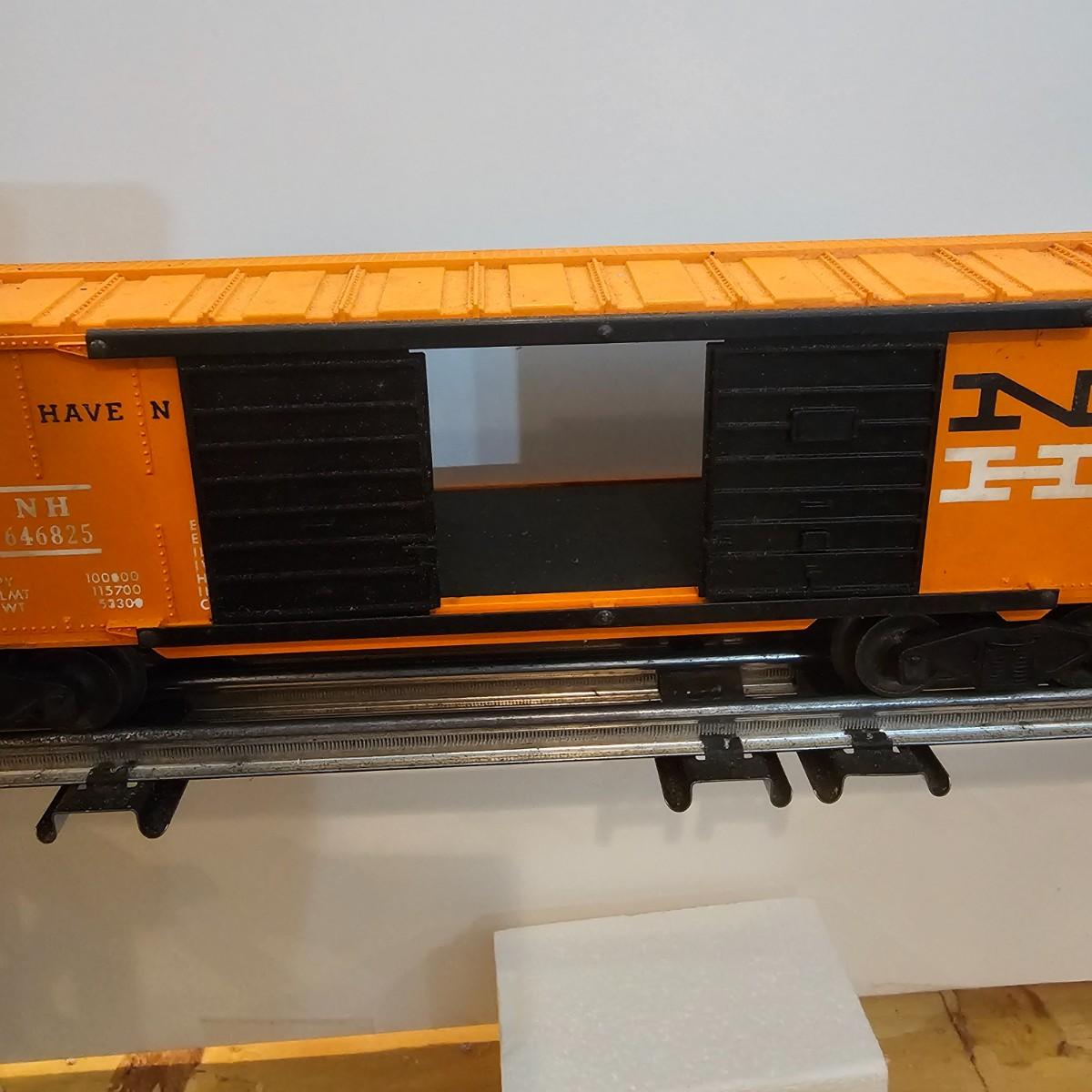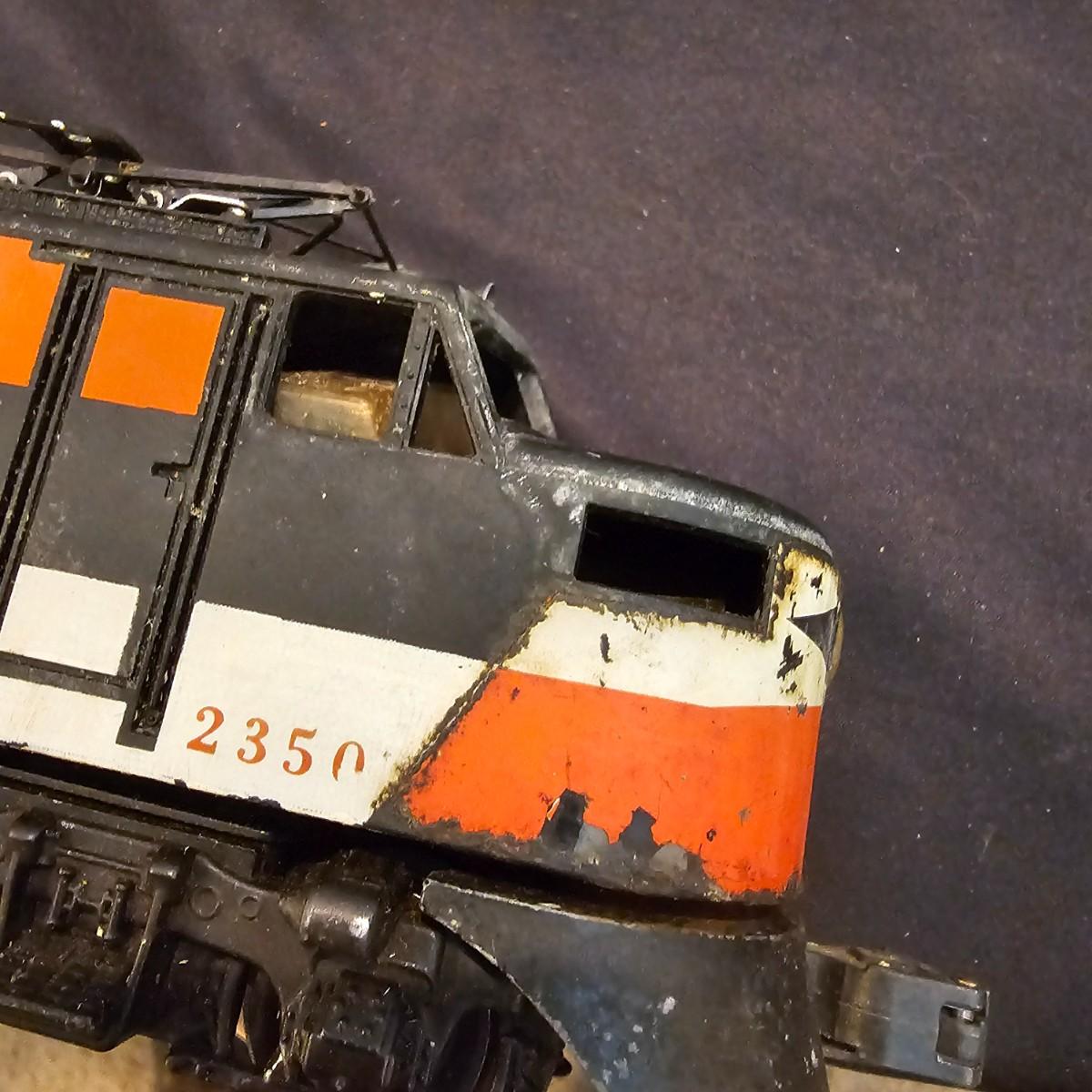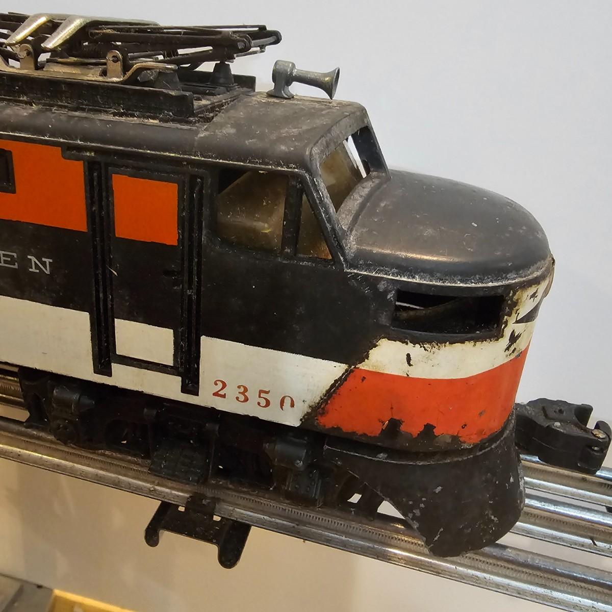 One rough shape EP5 electric engine in New Haven colors. Engine has rust and broken paint, missing some parts. Did not run. Also six New Haven box cars, one double door and five single door. The three black cars are all the same road number. Only one box for a boxcar. Approximately length of full train is 80". See photos for details. Please note that any price tag seen on an item was not put there by Sterling Transitions and does not reflect the current value of the item. Any train tracks shown in photos are not included but are available in another lot in this sale.