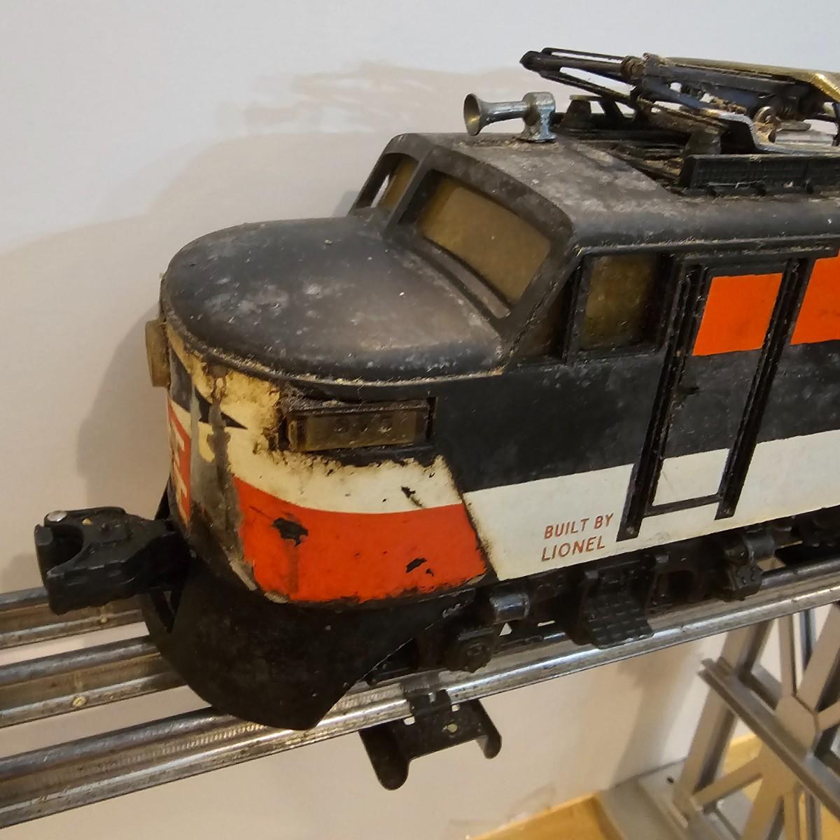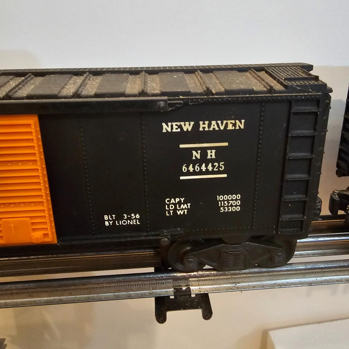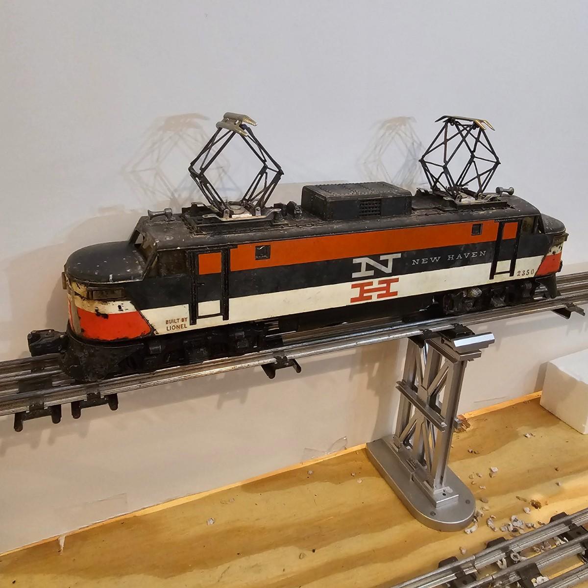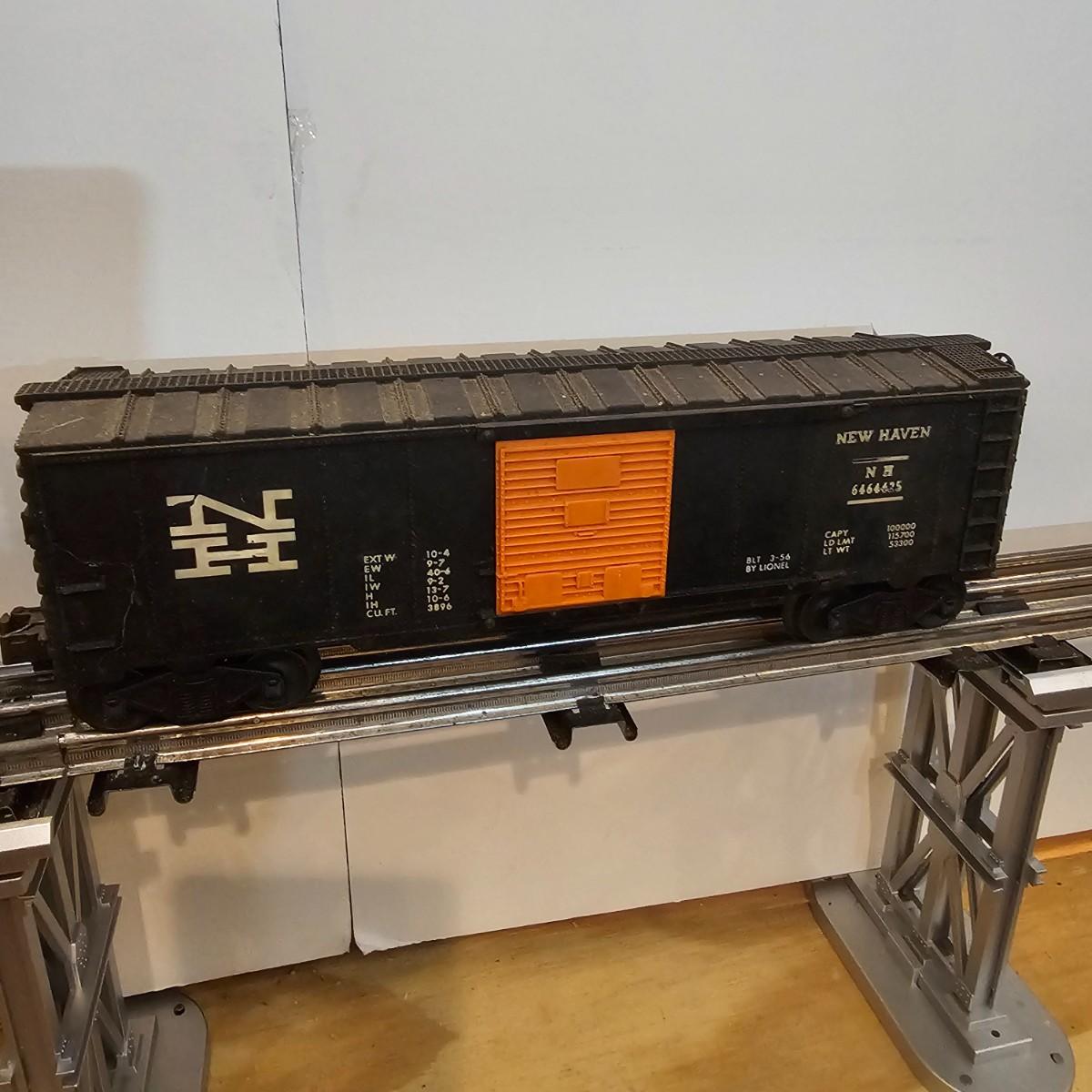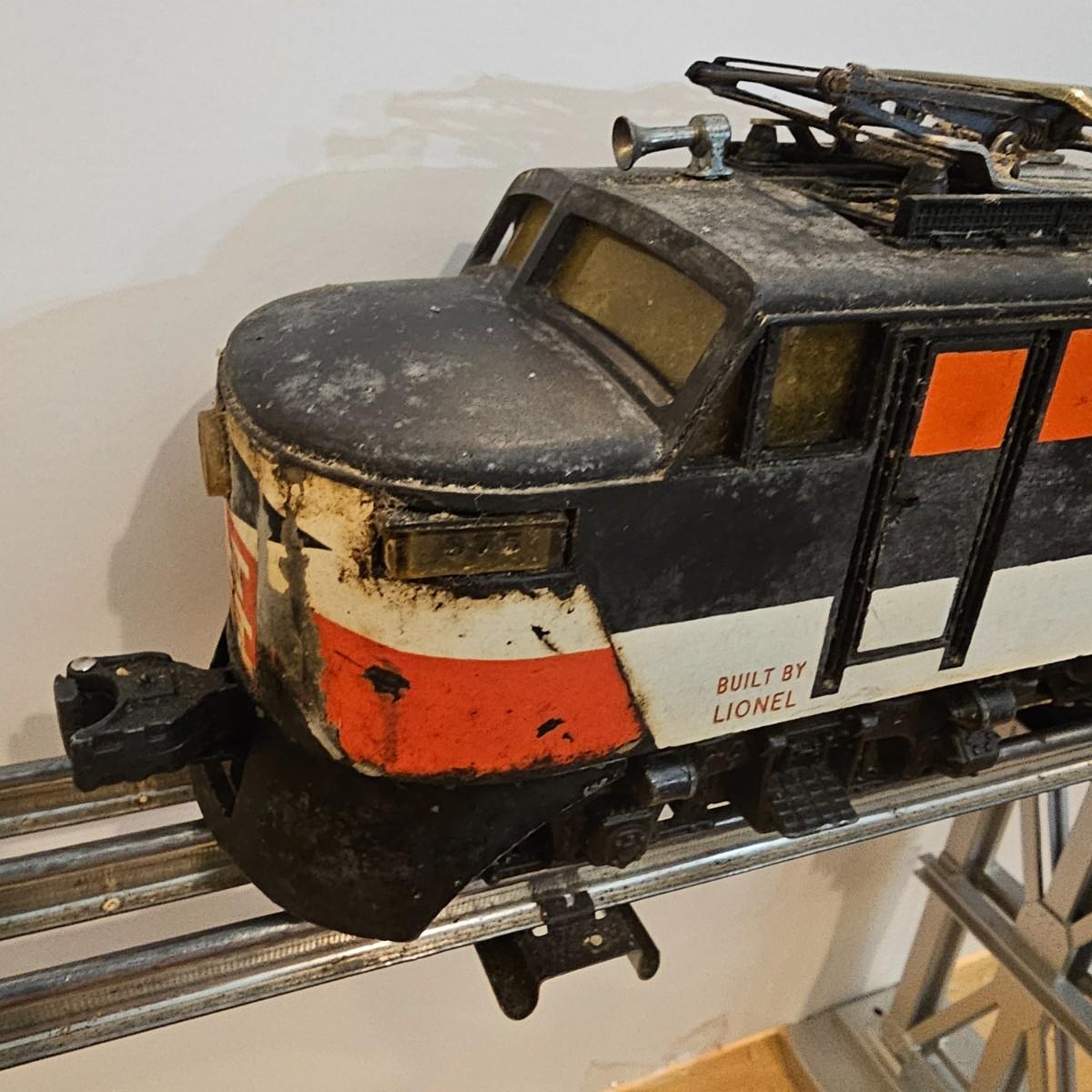 One rough shape EP5 electric engine in New Haven colors. Engine has rust and broken paint, missing some parts. Did not run. Also six New Haven box cars, one double door and five single door. The three black cars are all the same road number. Only one box for a boxcar. Approximately length of full train is 80". See photos for details. Please note that any price tag seen on an item was not put there by Sterling Transitions and does not reflect the current value of the item. Any train tracks shown in photos are not included but are available in another lot in this sale.