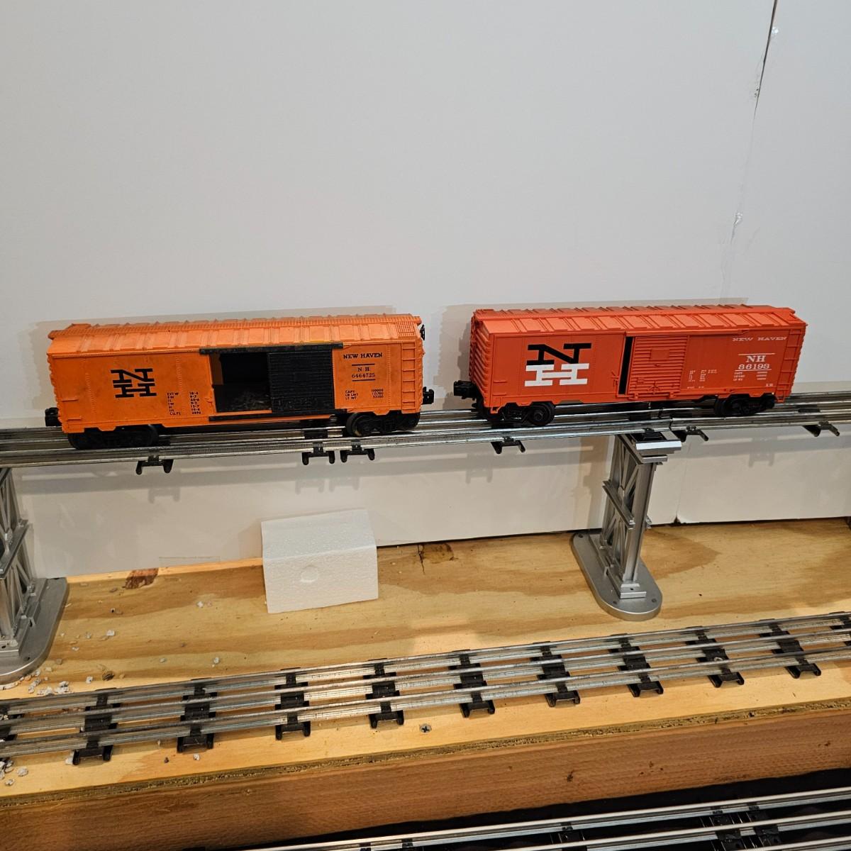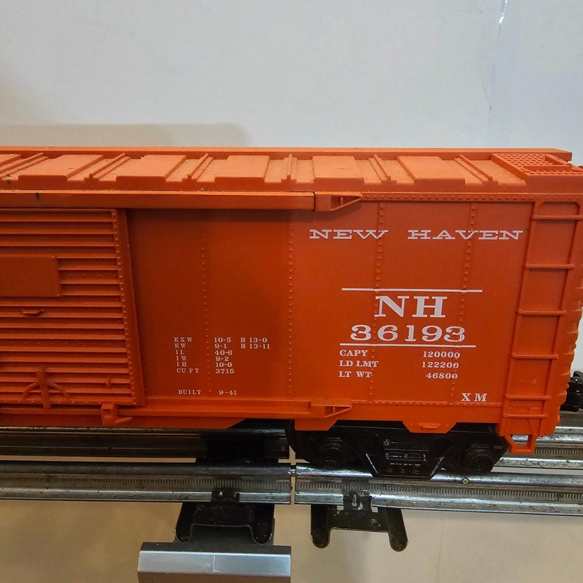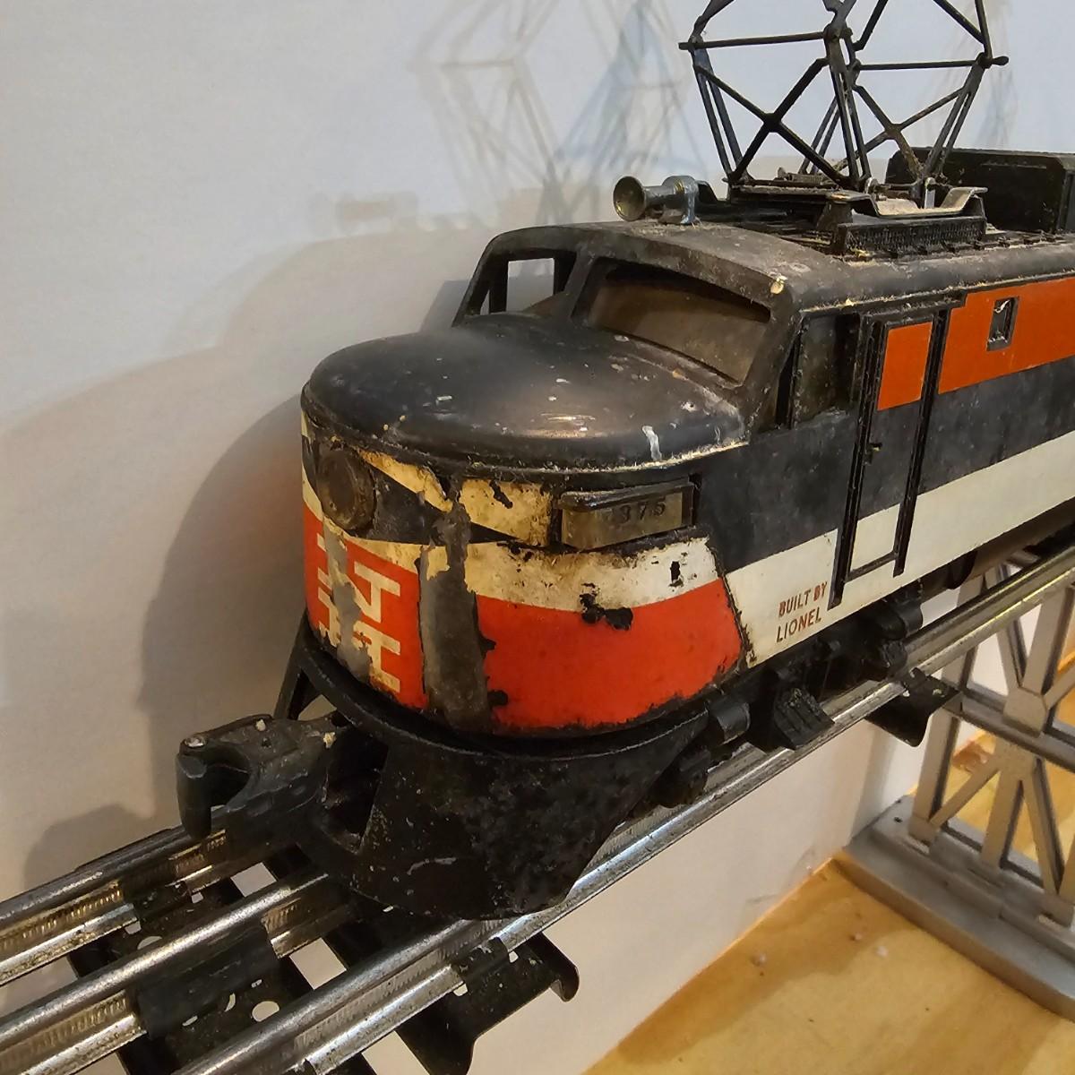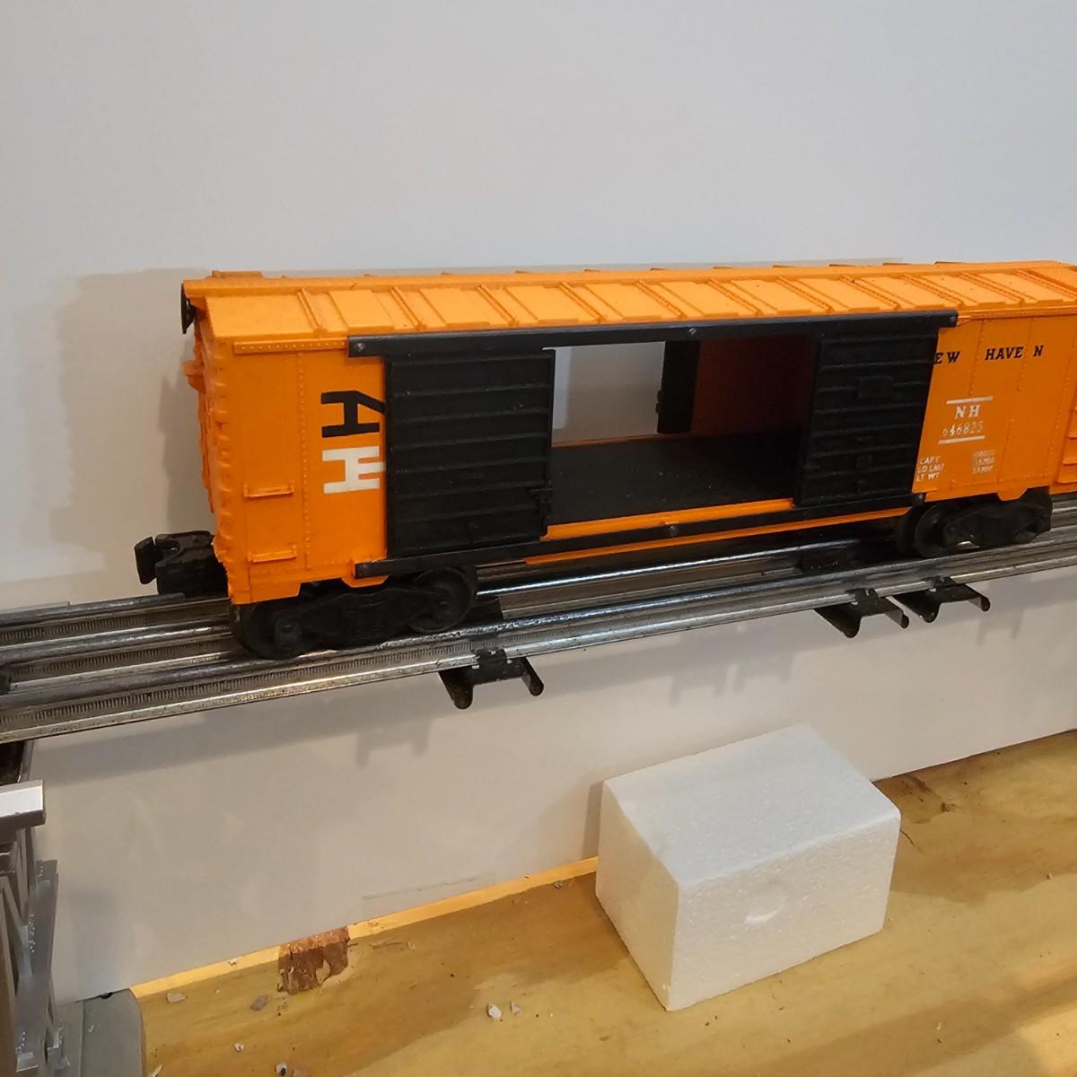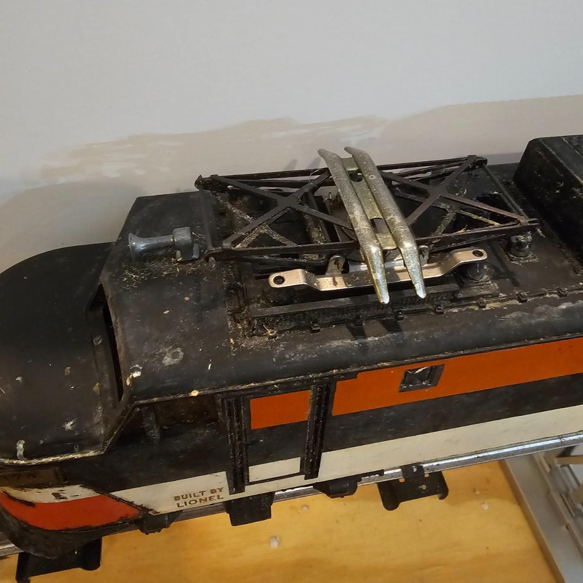 One rough shape EP5 electric engine in New Haven colors. Engine has rust and broken paint, missing some parts. Did not run. Also six New Haven box cars, one double door and five single door. The three black cars are all the same road number. Only one box for a boxcar. Approximately length of full train is 80". See photos for details. Please note that any price tag seen on an item was not put there by Sterling Transitions and does not reflect the current value of the item. Any train tracks shown in photos are not included but are available in another lot in this sale.