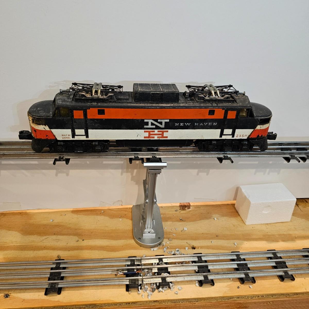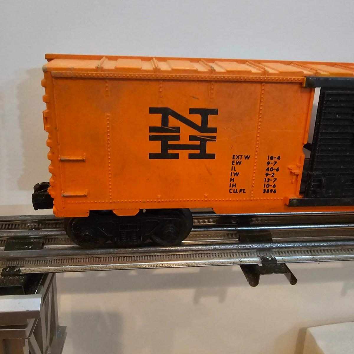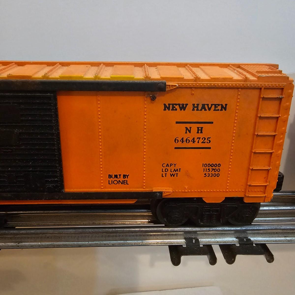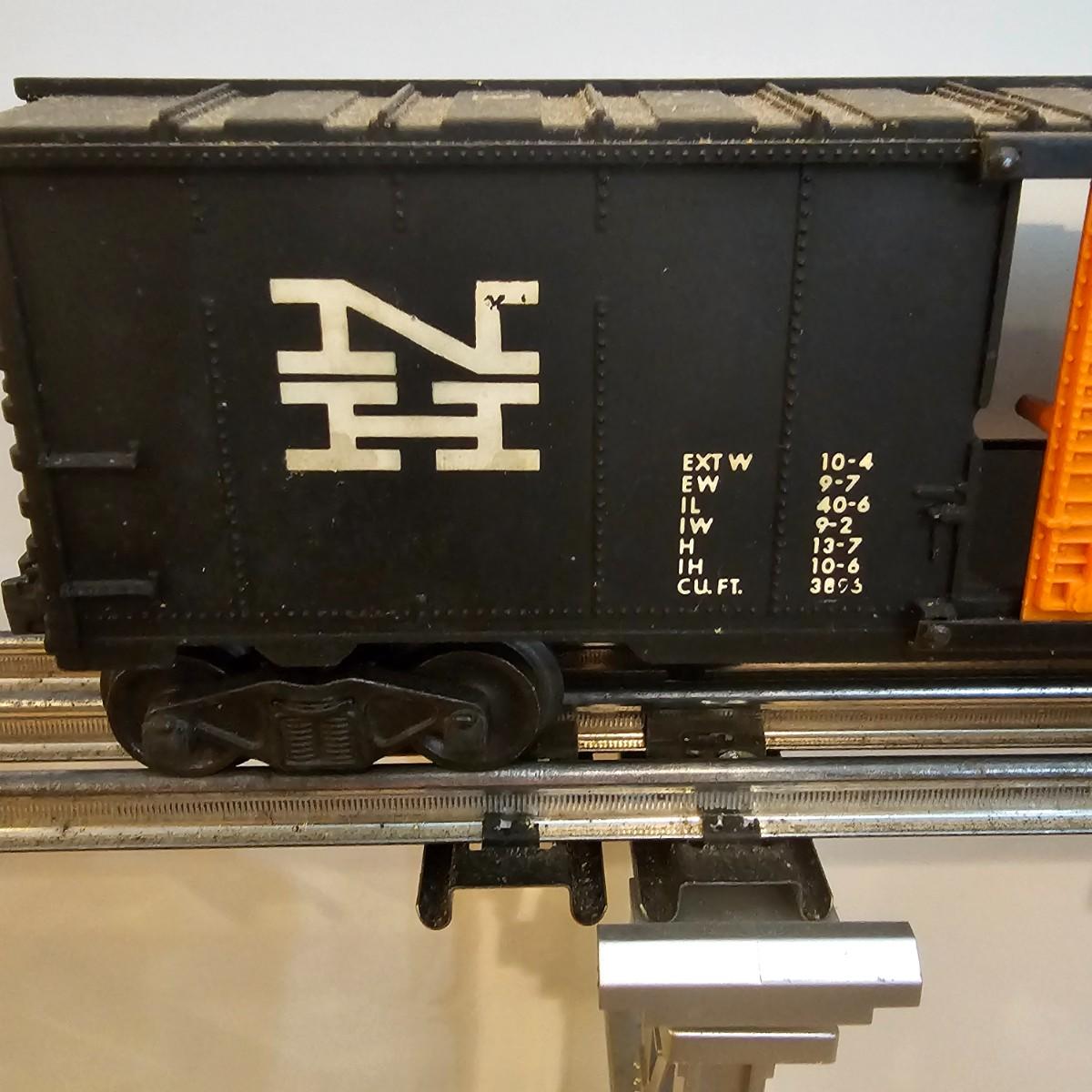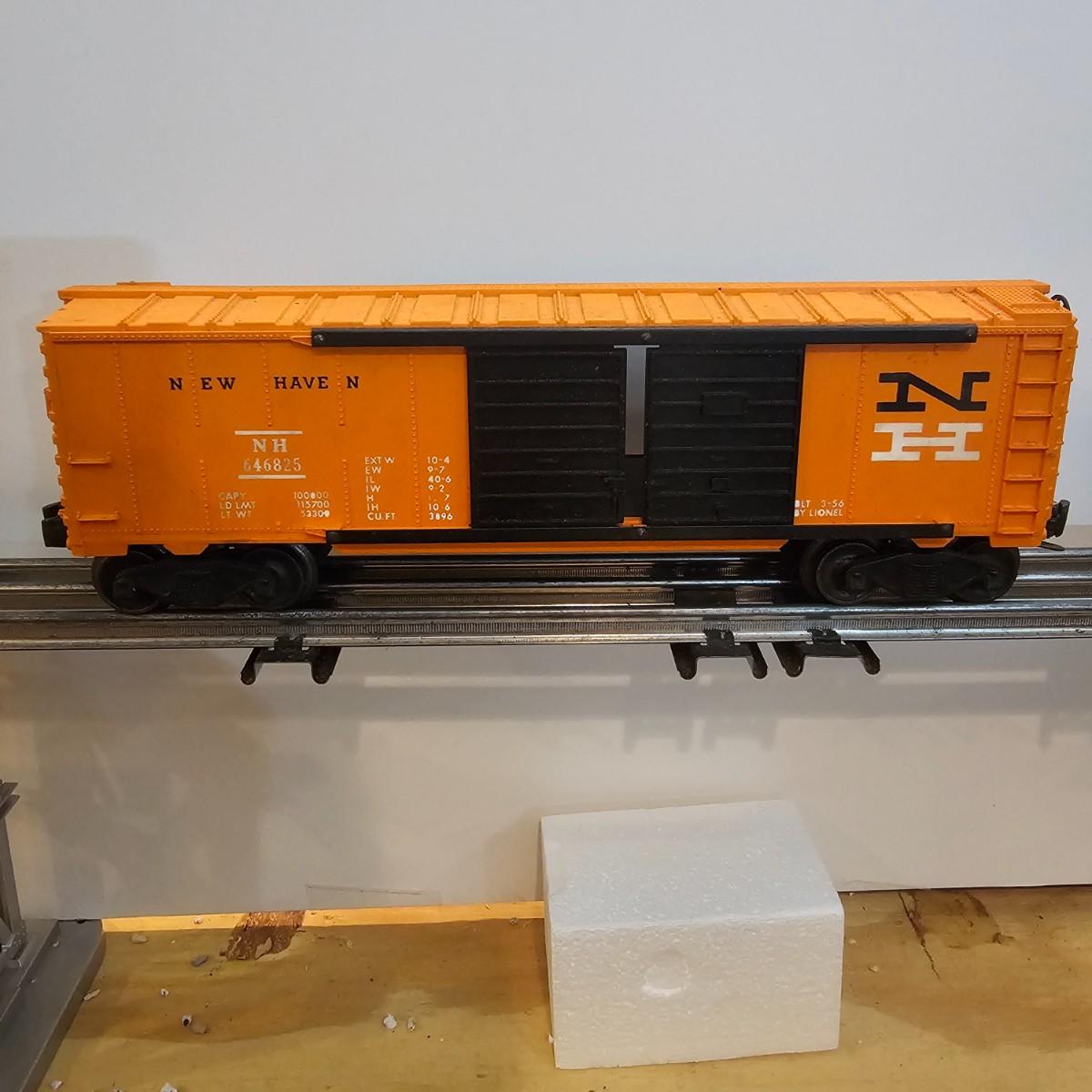 One rough shape EP5 electric engine in New Haven colors. Engine has rust and broken paint, missing some parts. Did not run. Also six New Haven box cars, one double door and five single door. The three black cars are all the same road number. Only one box for a boxcar. Approximately length of full train is 80". See photos for details. Please note that any price tag seen on an item was not put there by Sterling Transitions and does not reflect the current value of the item. Any train tracks shown in photos are not included but are available in another lot in this sale.