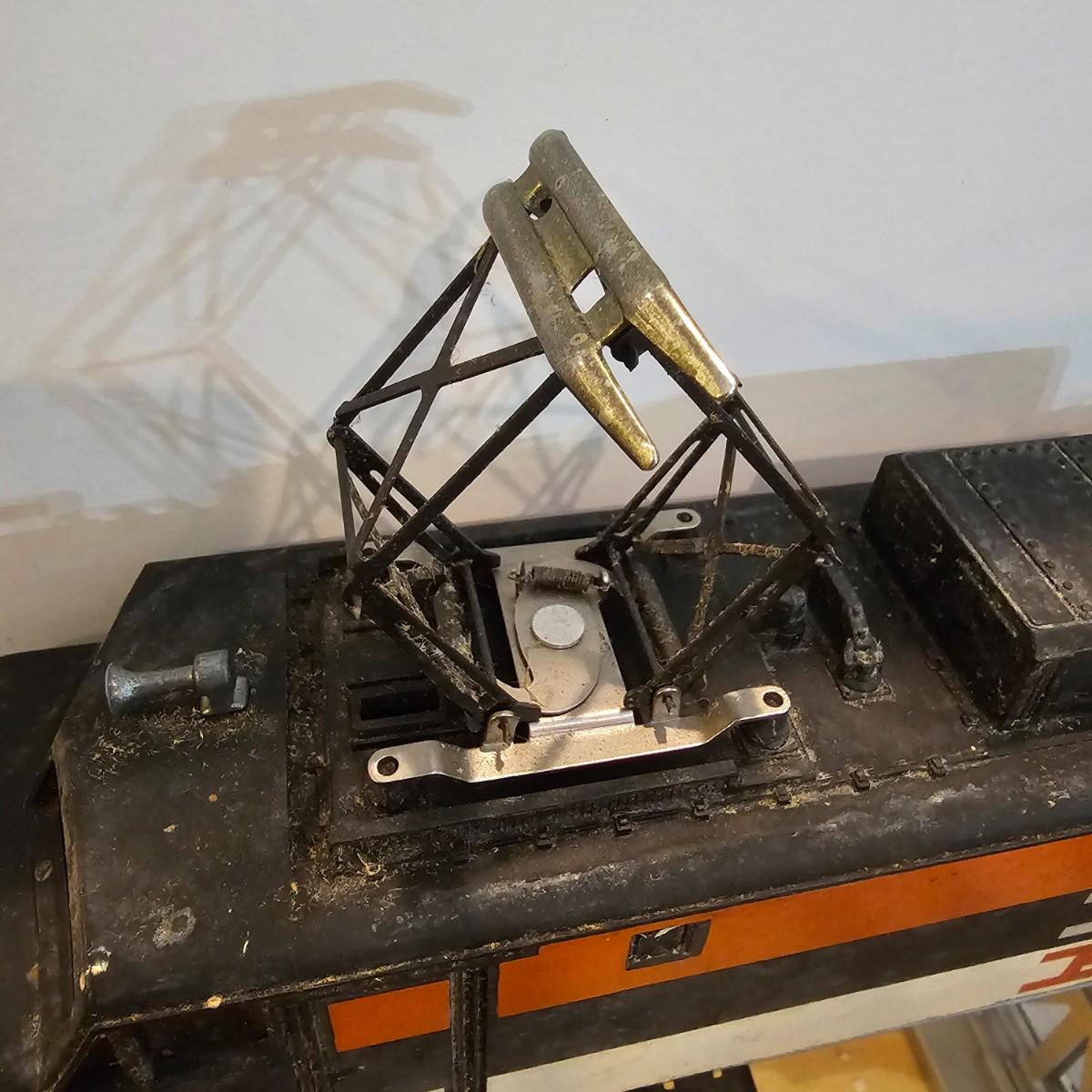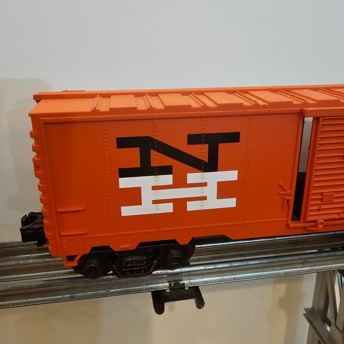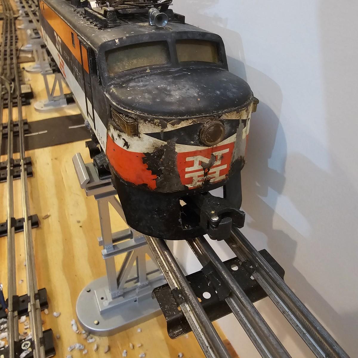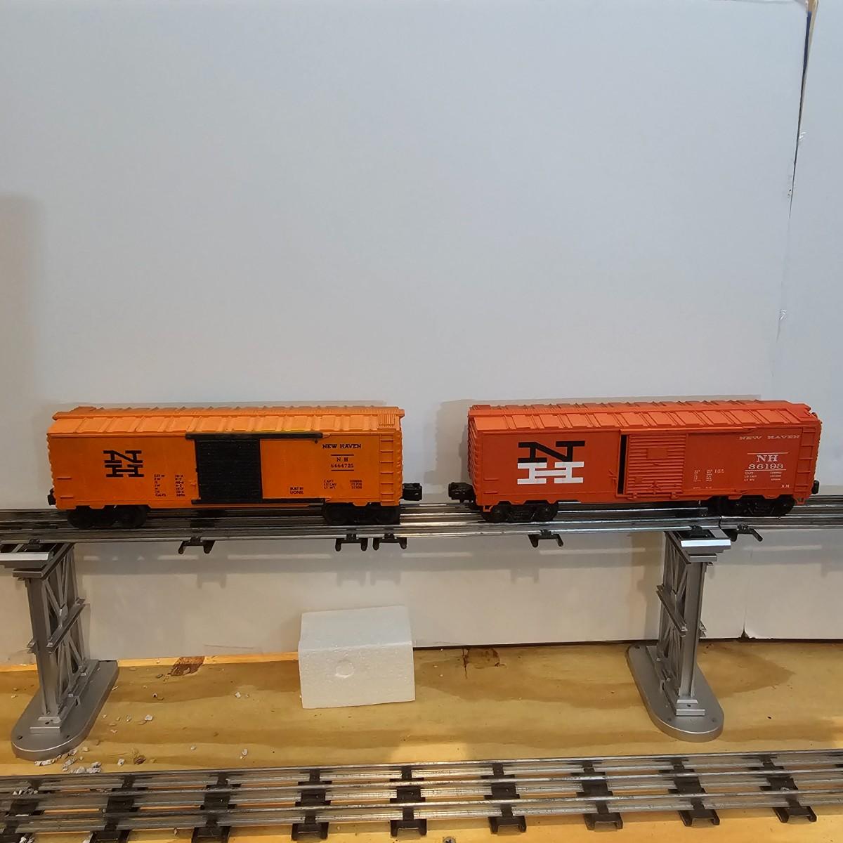 One rough shape EP5 electric engine in New Haven colors. Engine has rust and broken paint, missing some parts. Did not run. Also six New Haven box cars, one double door and five single door. The three black cars are all the same road number. Only one box for a boxcar. Approximately length of full train is 80". See photos for details. Please note that any price tag seen on an item was not put there by Sterling Transitions and does not reflect the current value of the item. Any train tracks shown in photos are not included but are available in another lot in this sale.