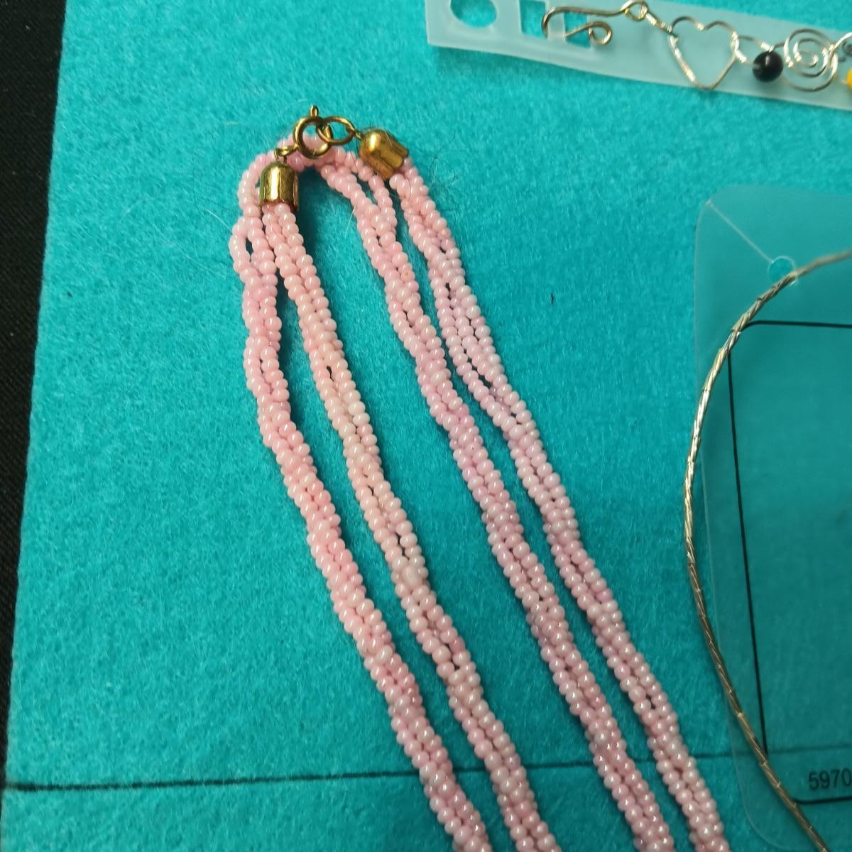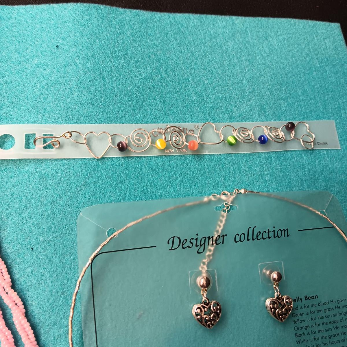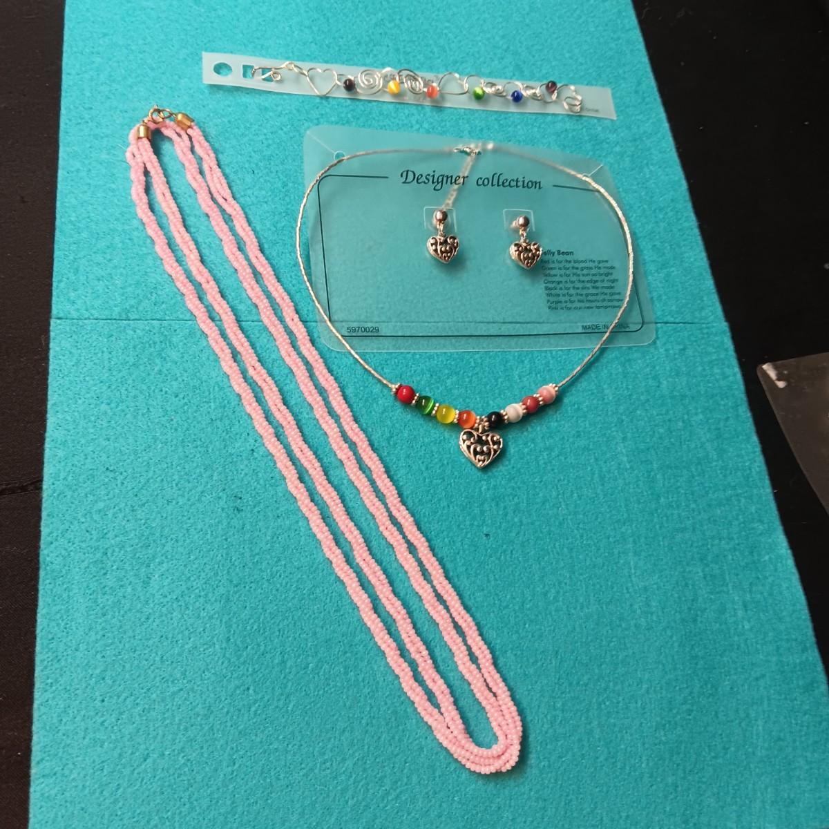 NEW HEART THEMED NECKLACE, EARRINGS AND BRACELET PLUS PINK SEED BEAD NECKLACE