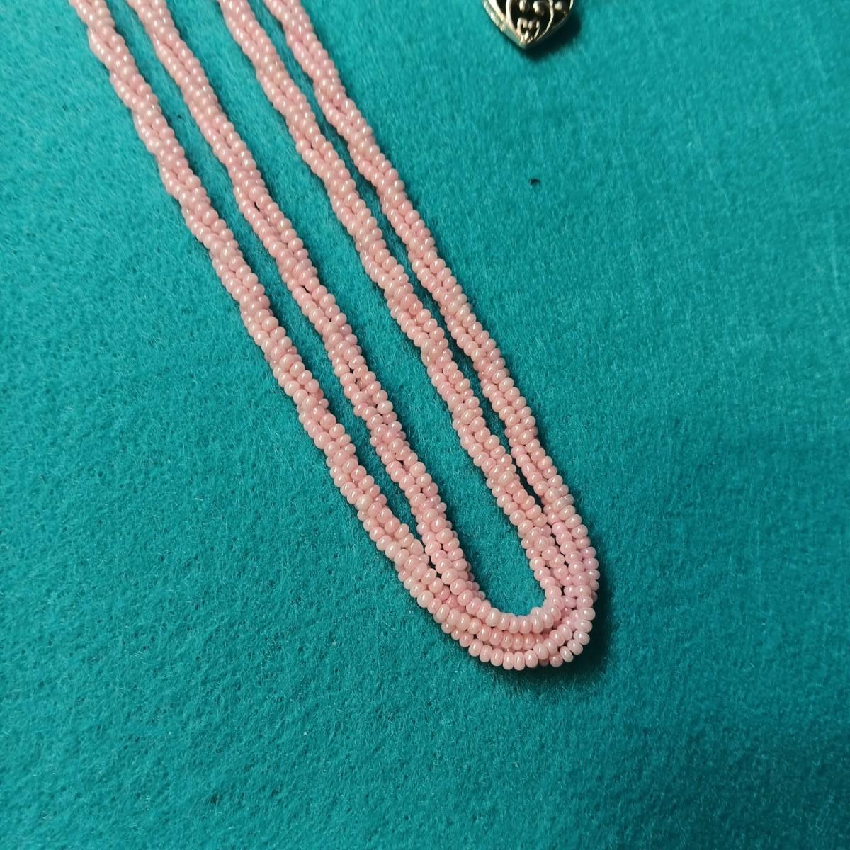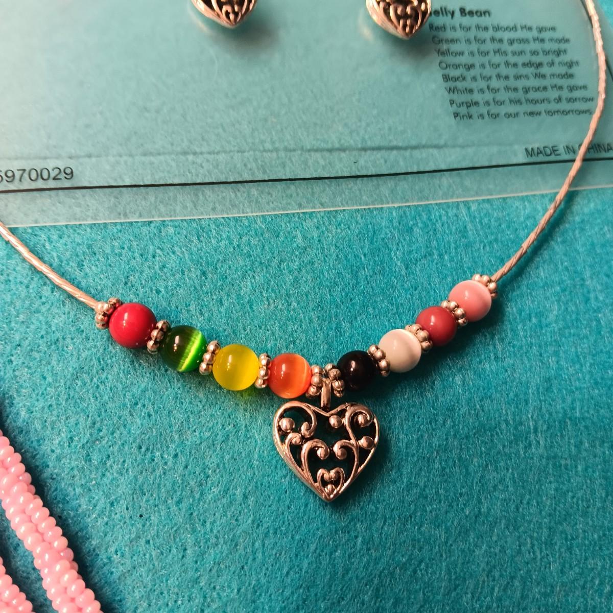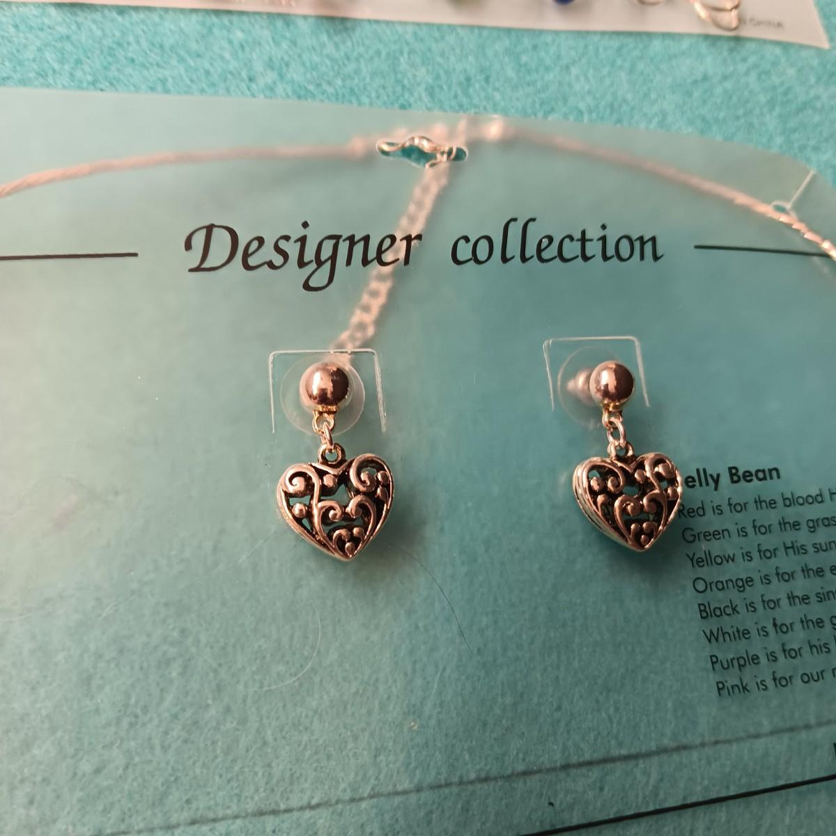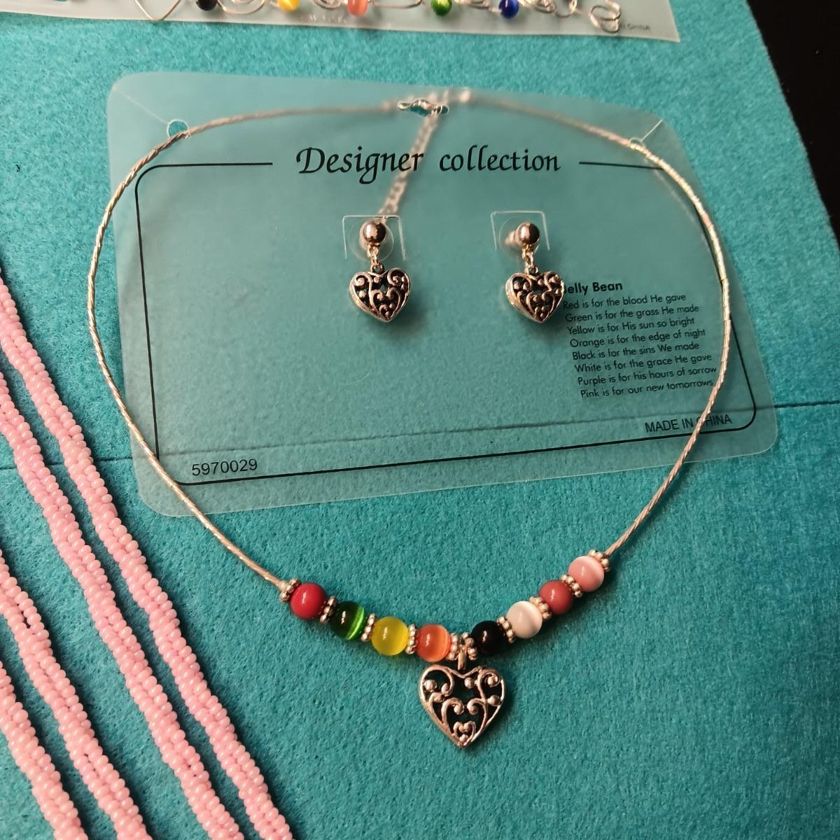 NEW HEART THEMED NECKLACE, EARRINGS AND BRACELET PLUS PINK SEED BEAD NECKLACE