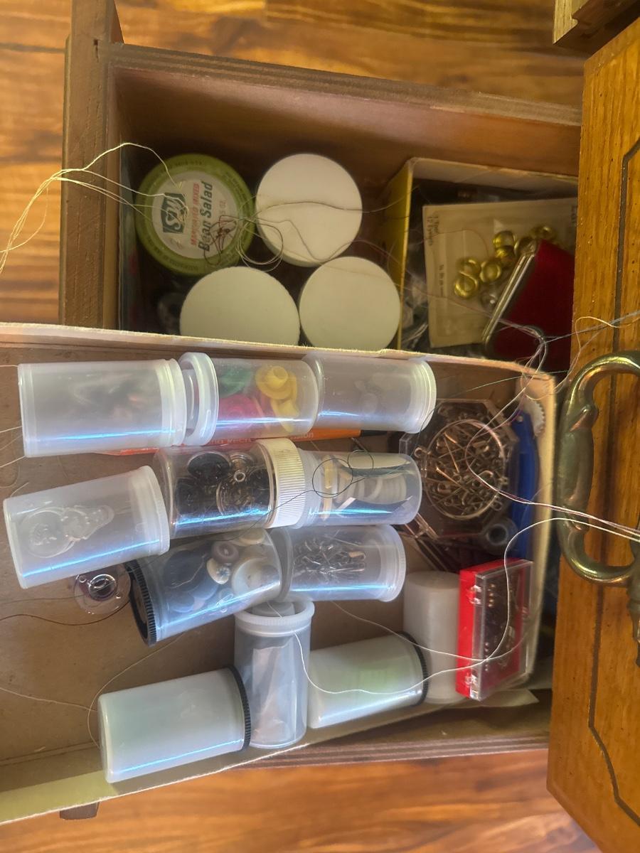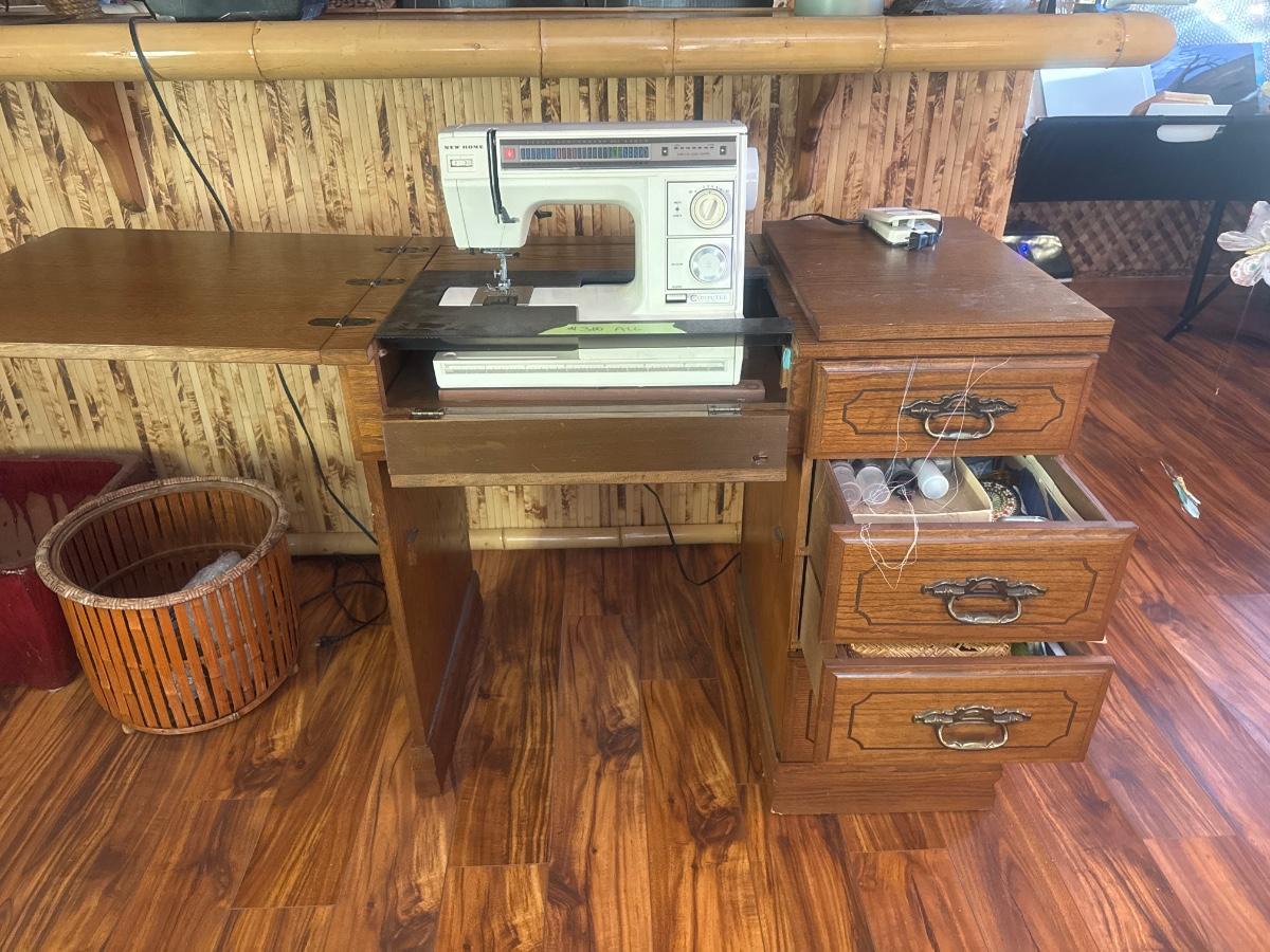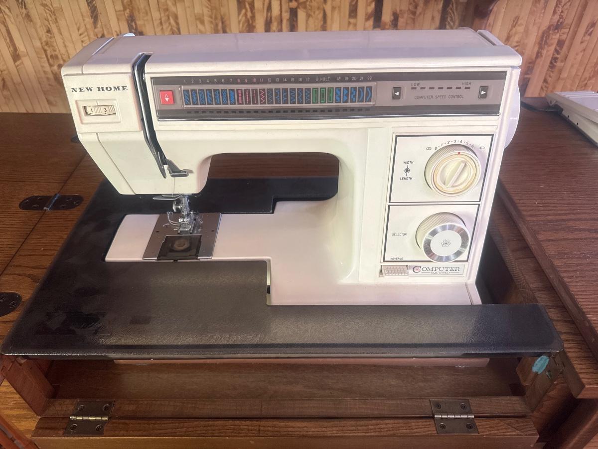 New Home, sewing machine, vintage with table and accessories.