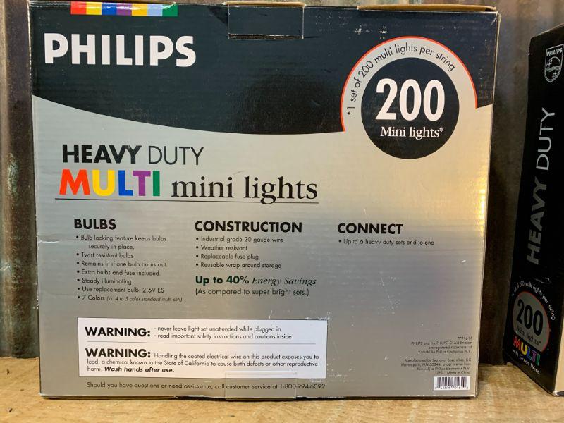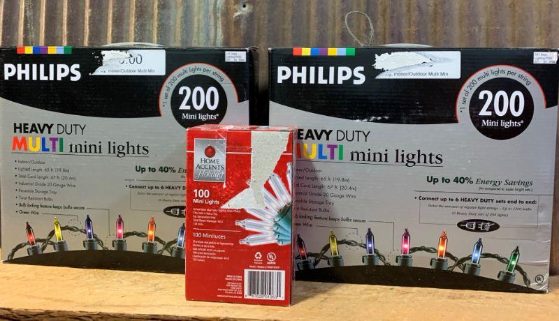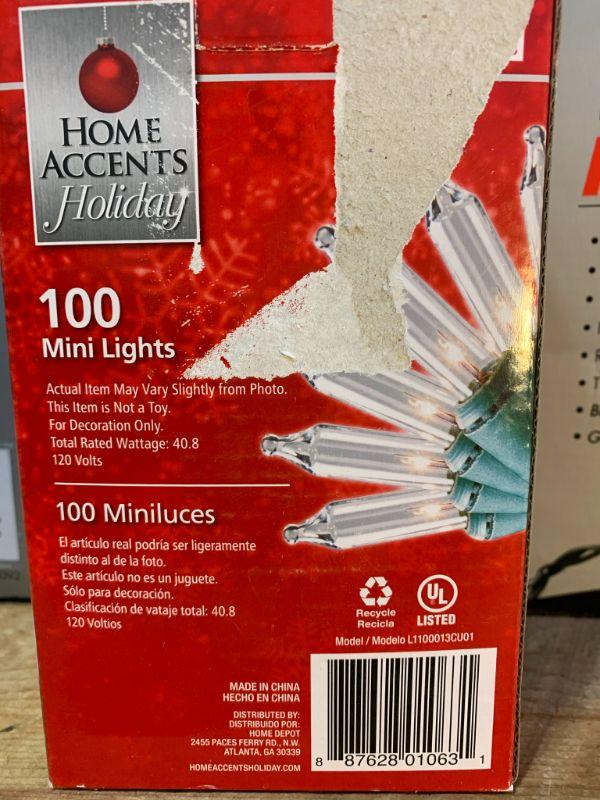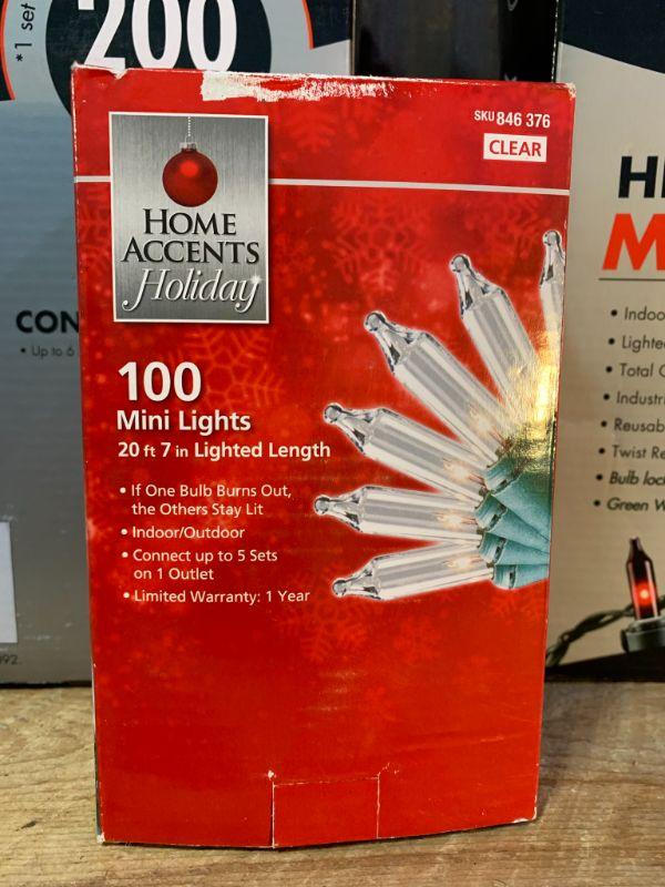 3 new in box Unused Christmas Light Sets, 2 Heavy Duty Multi Mini Light Sets (100 lights) & 1 Home accents Mini Lights(White) Items are sold AS IS. Photos area apart of the description. Shipping is available or Pickup By Appointment