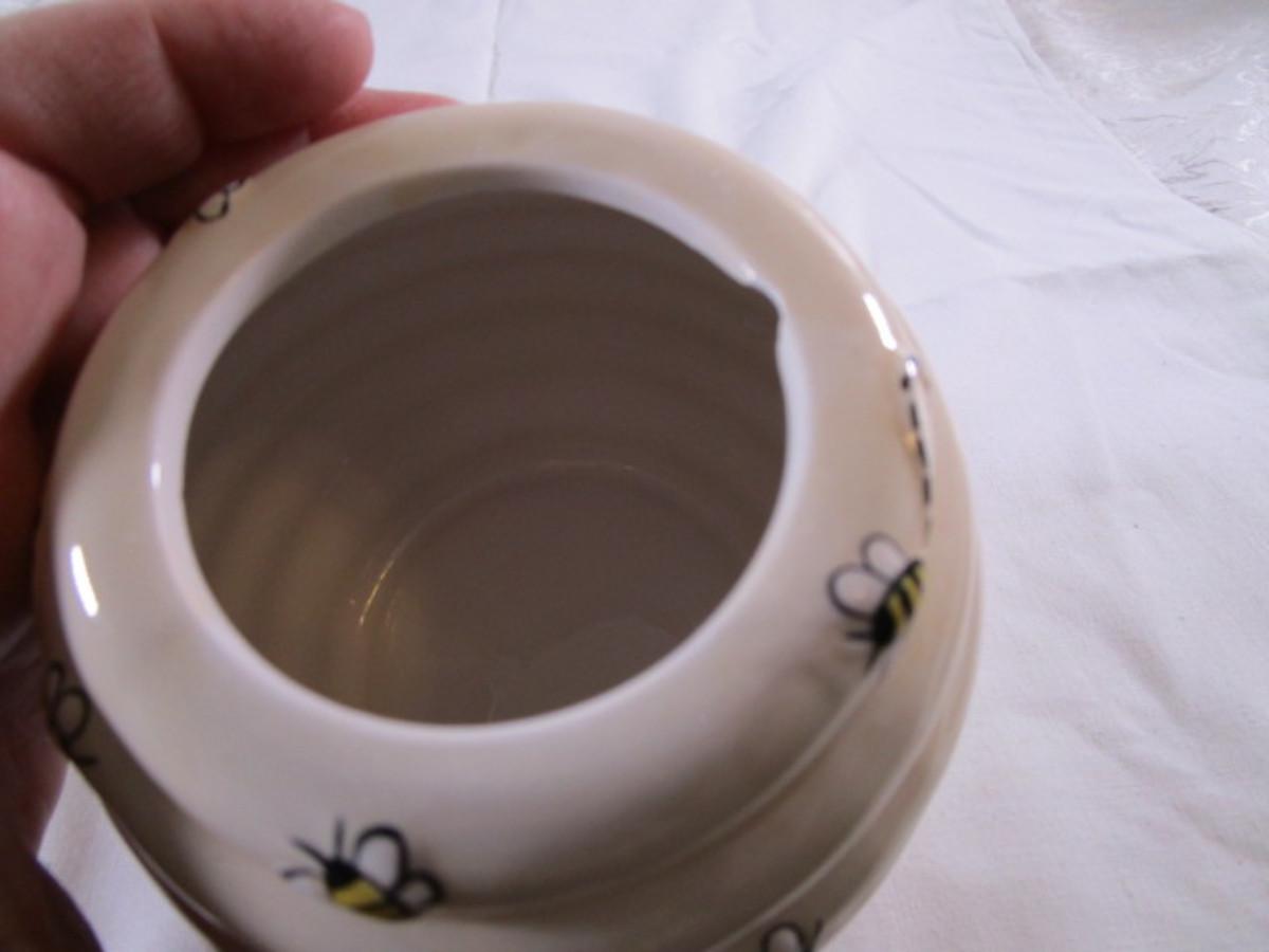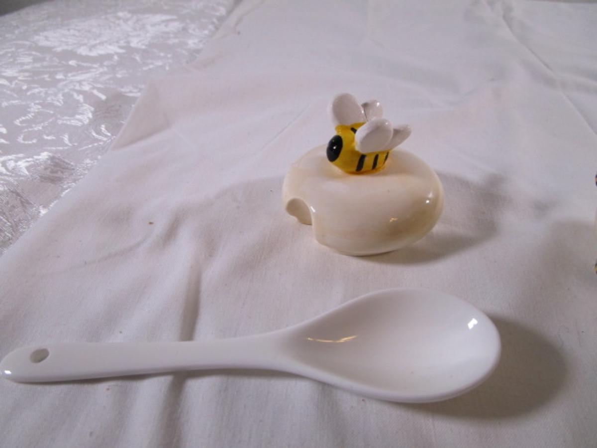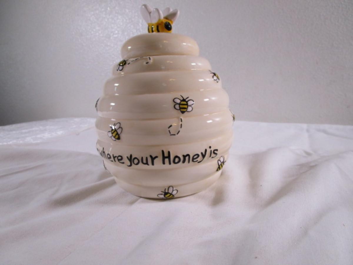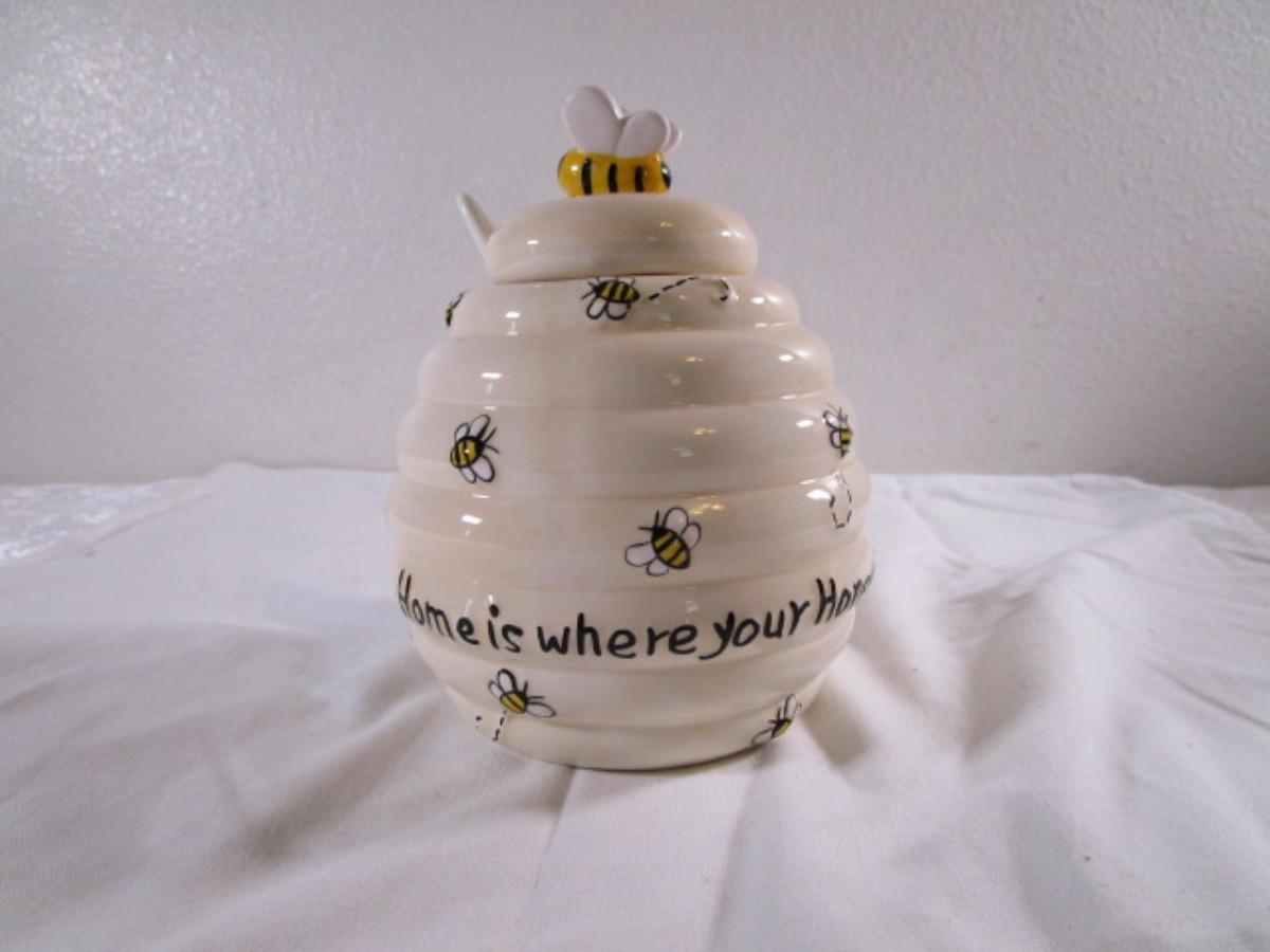 "Home is Where Your Honey Is" Model ER37138, small chip on jar, see pictures, 6-3/4" tall, includes ceramic spoon