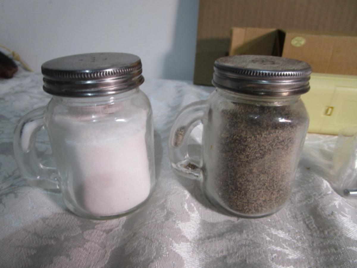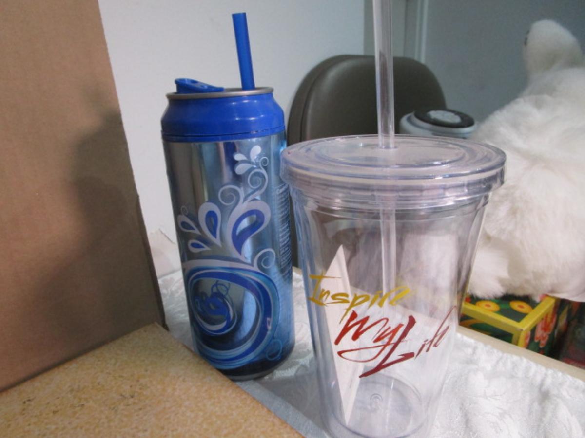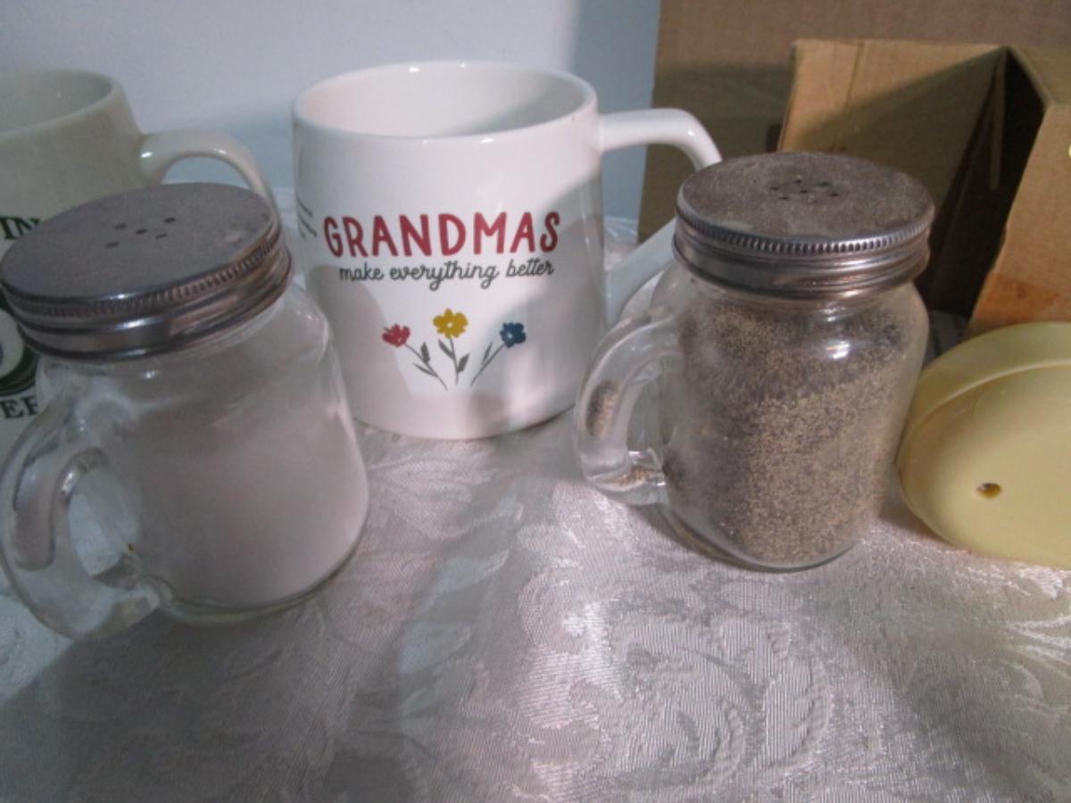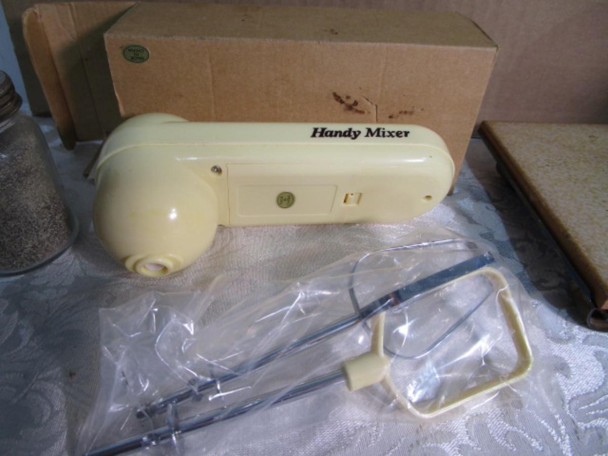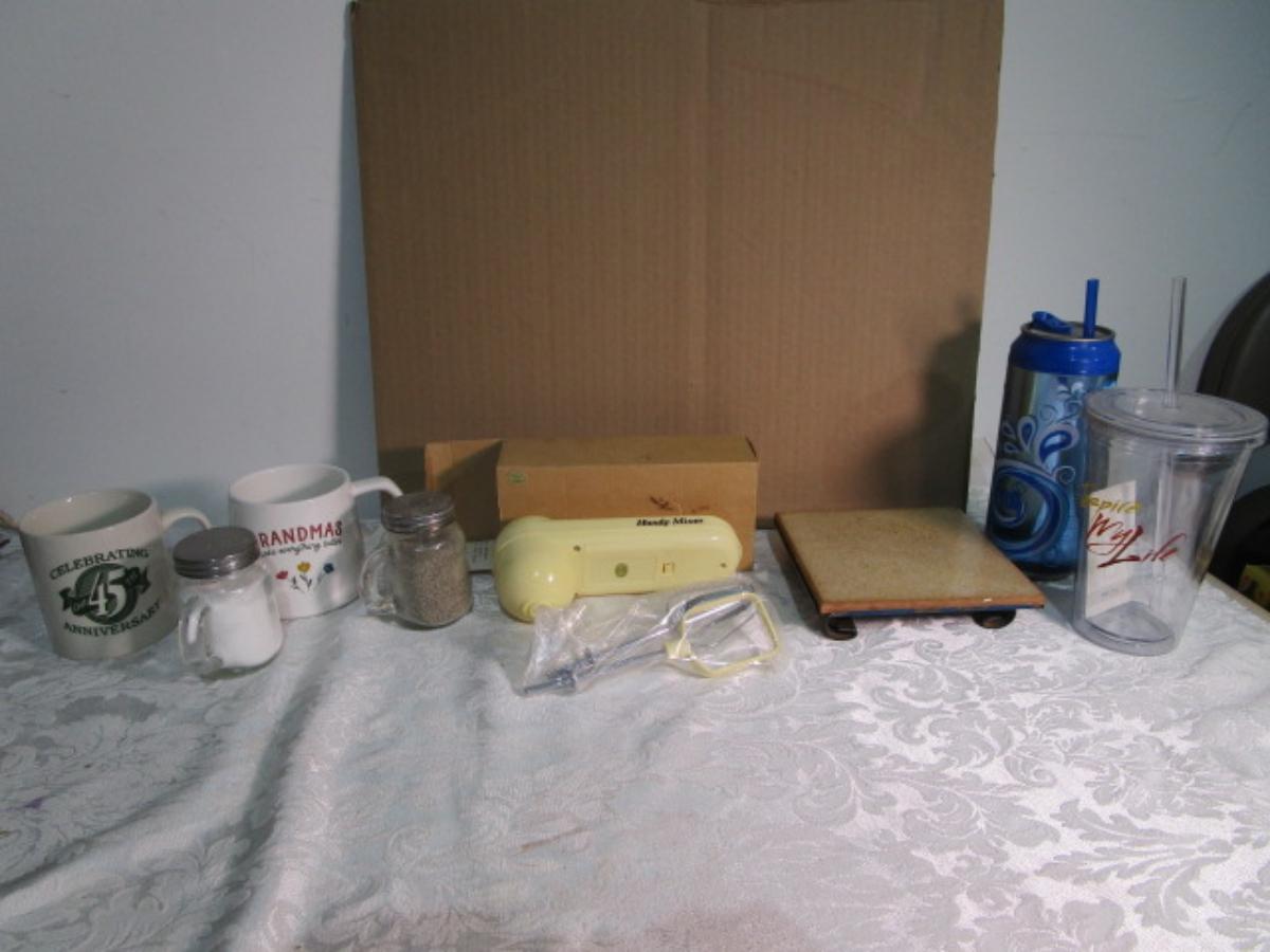 New in box Handy Mixer; trivet, 2 mugs, salt & pepper shakers, 2 new cups with lids & straws