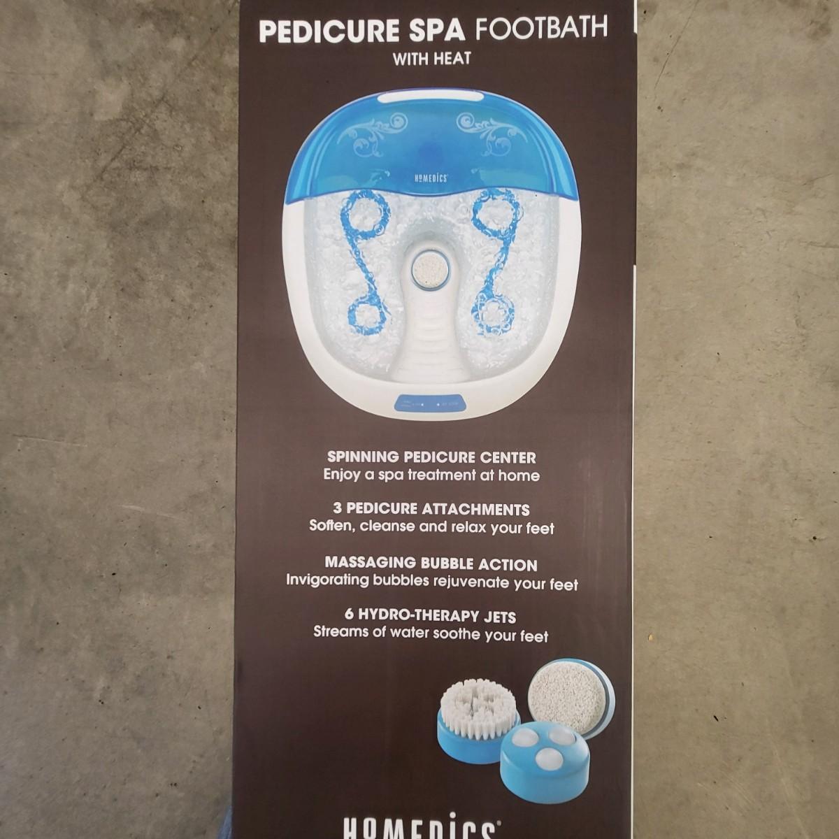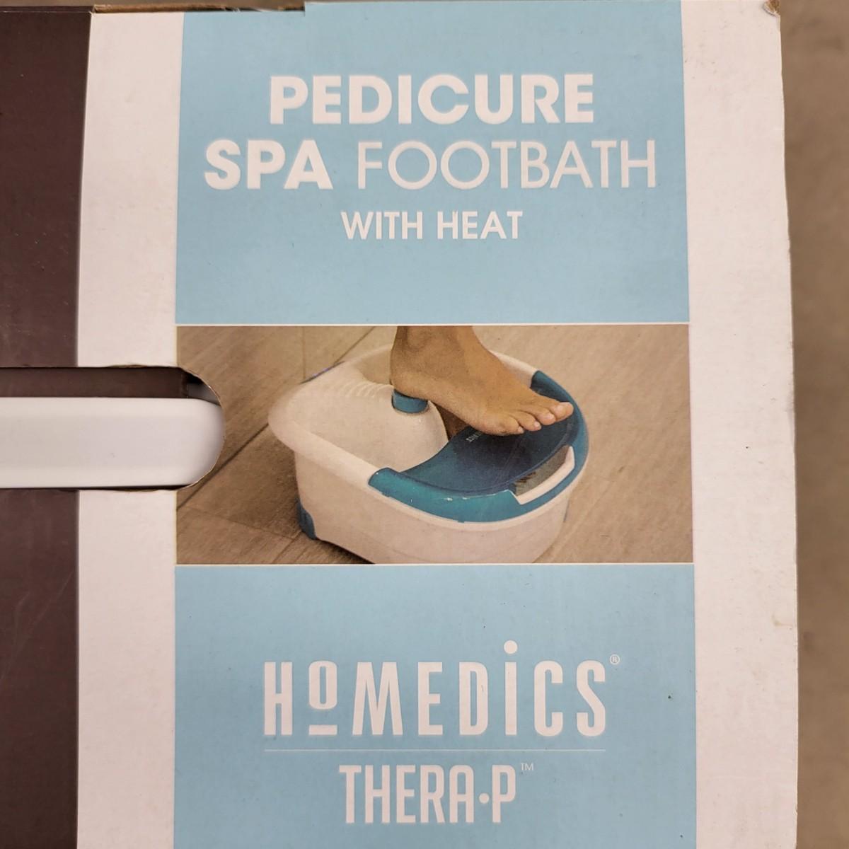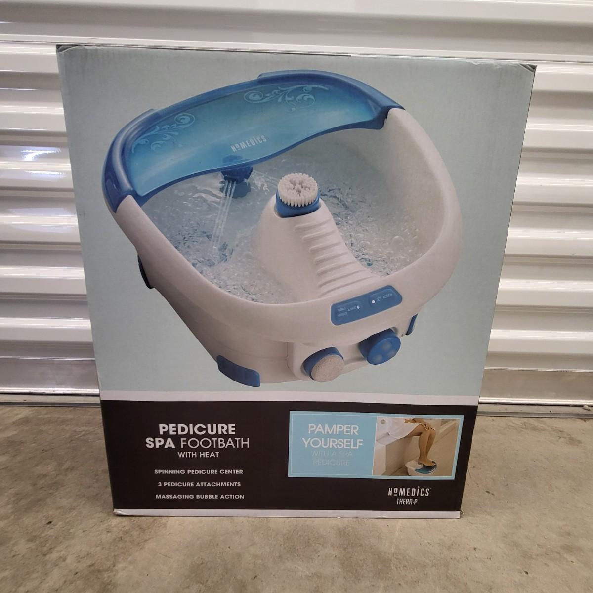 Pamper yourself with this Homedics pedicure spa footbath with attachments, heat, massaging bubbles and jets. Open box but never used. Shipping not available on this item.
