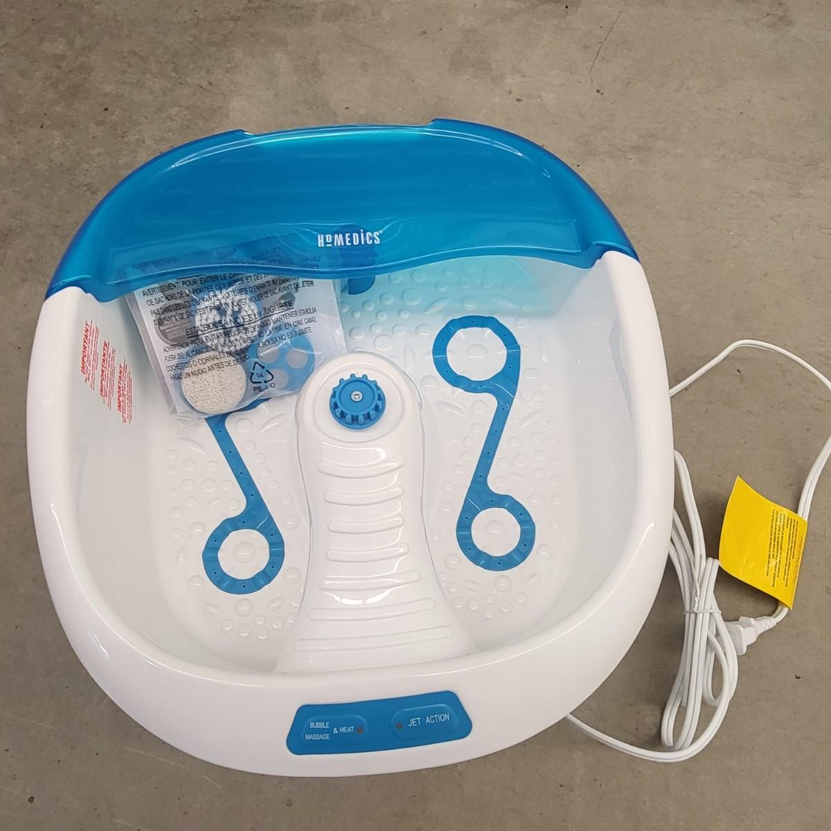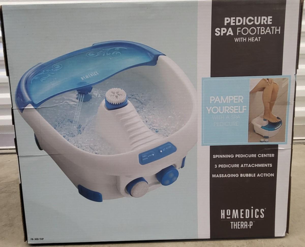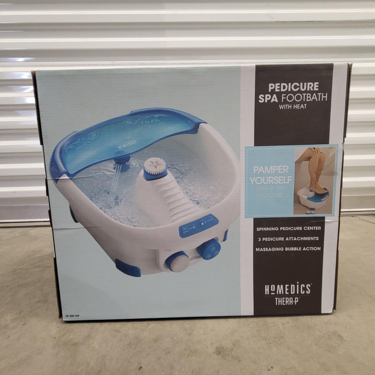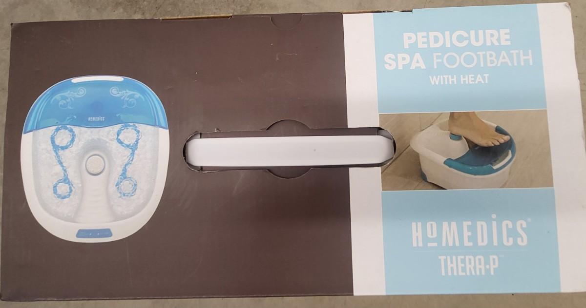 Pamper yourself with this Homedics pedicure spa footbath with attachments, heat, massaging bubbles and jets. Open box but never used. Shipping not available on this item.